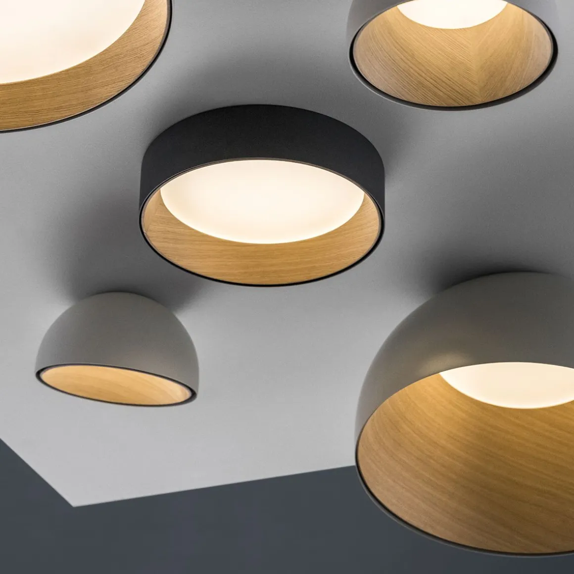 Duo est un plafonnier à monter en surface qui allie l’aspect chaud et naturel du bois de chêne du revêtement intérieur à la technologie toute en finesse du revêtement métallique extérieur en aluminium.