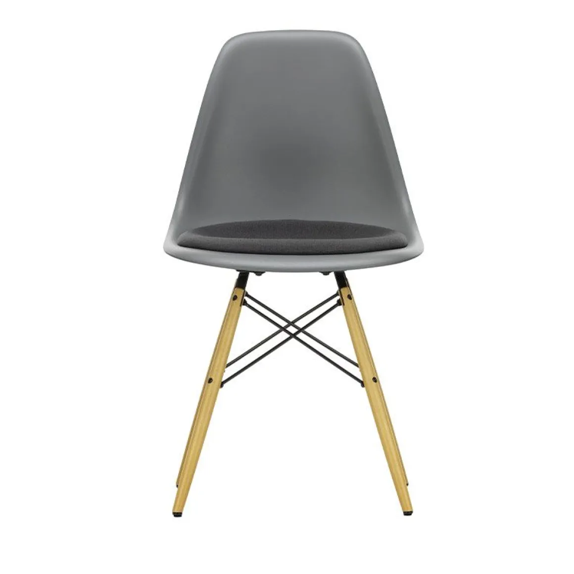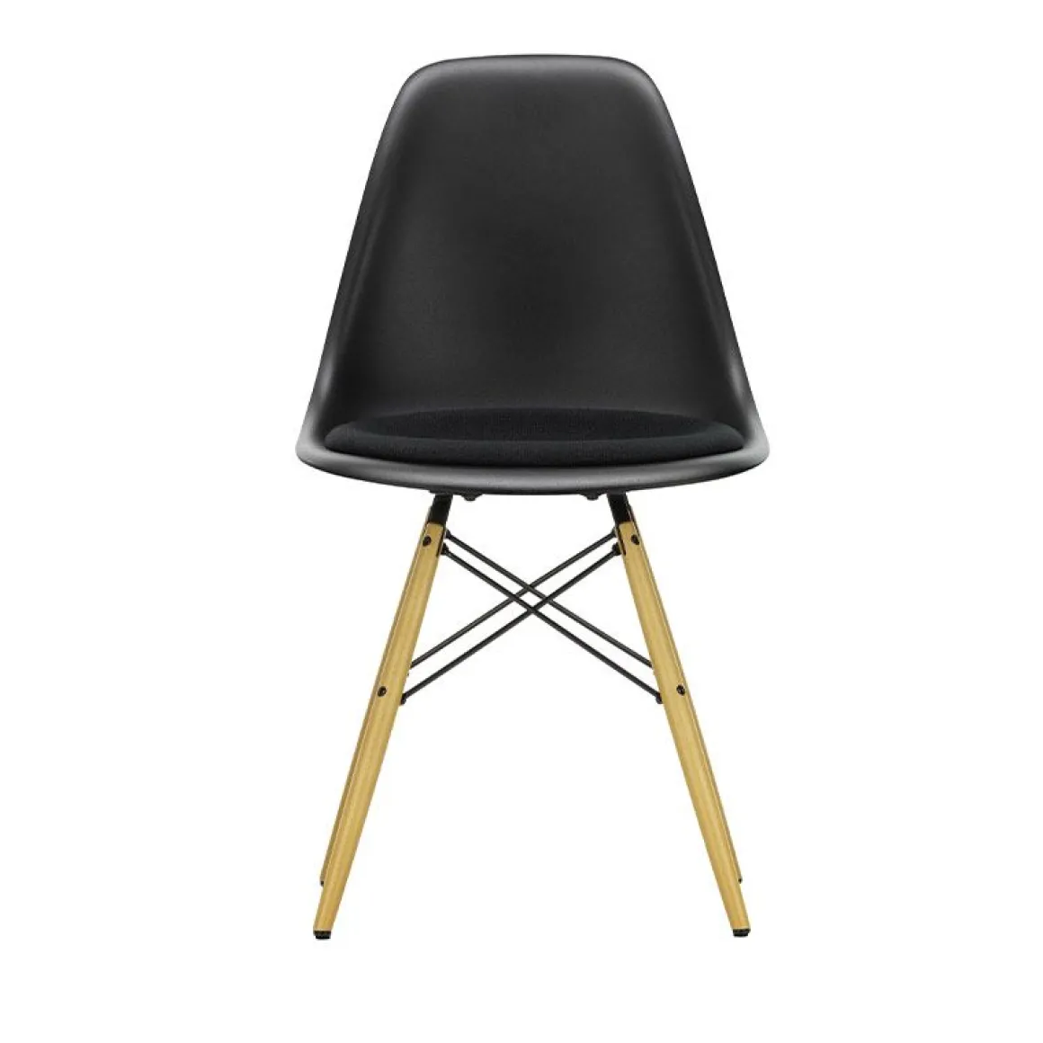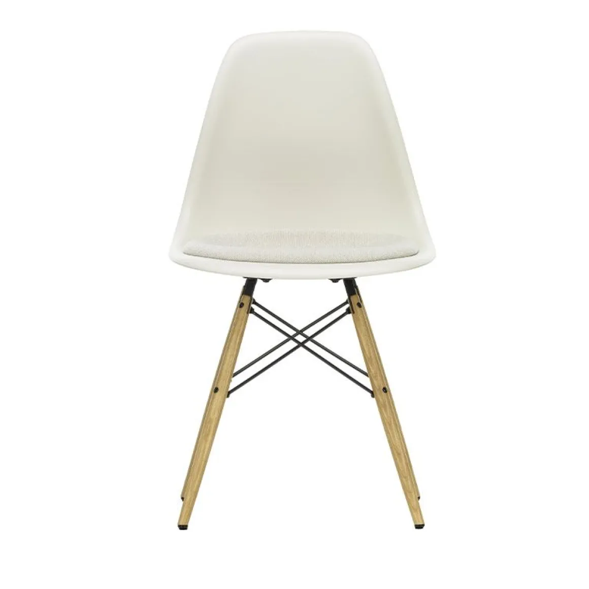 Piètement : piètement en bois non empilable en différentes nuances d’érable ou de frêne couleur miel, finition teinte et vernie. Croisillons en tube d’acier basic dark. (DSW = Dining Height Side Chair Wood Base)