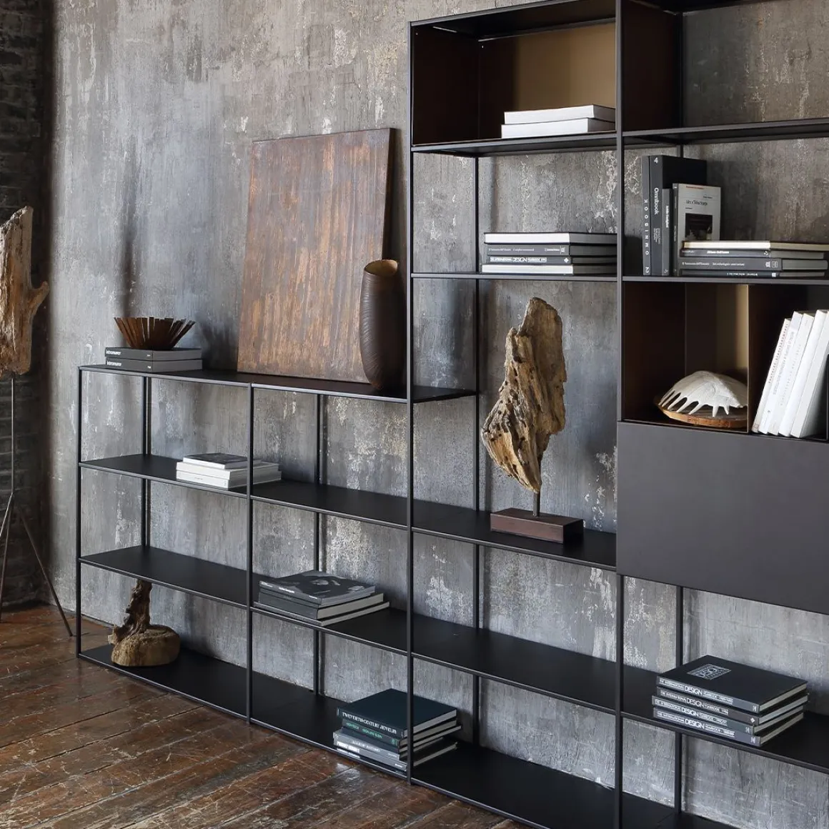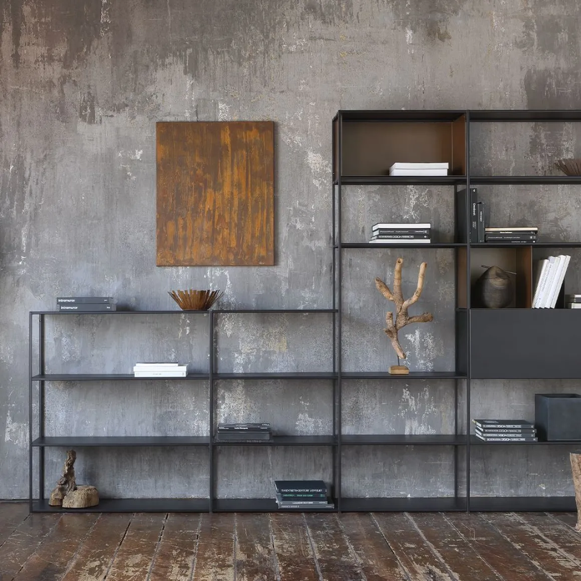 Module console. Single, componible ou à intégration de la bibliothèque déjà existante EASY IRONY. Structure démontable et modulable avec montants H 114 cm en tube d’acier 15 x 15 mm. Tablettes encastrables L 74 ou 104 cm en tôle d’acier courbée, épaisseur 1,5 mm. Peinture époxy noir cuivré sablé ou blanc gaufré. Disponible aussi montant H 114 cm. Prévu pour fixage au mur. Espace utile entre les tablettes 36 cm.