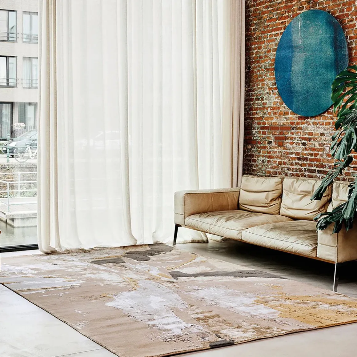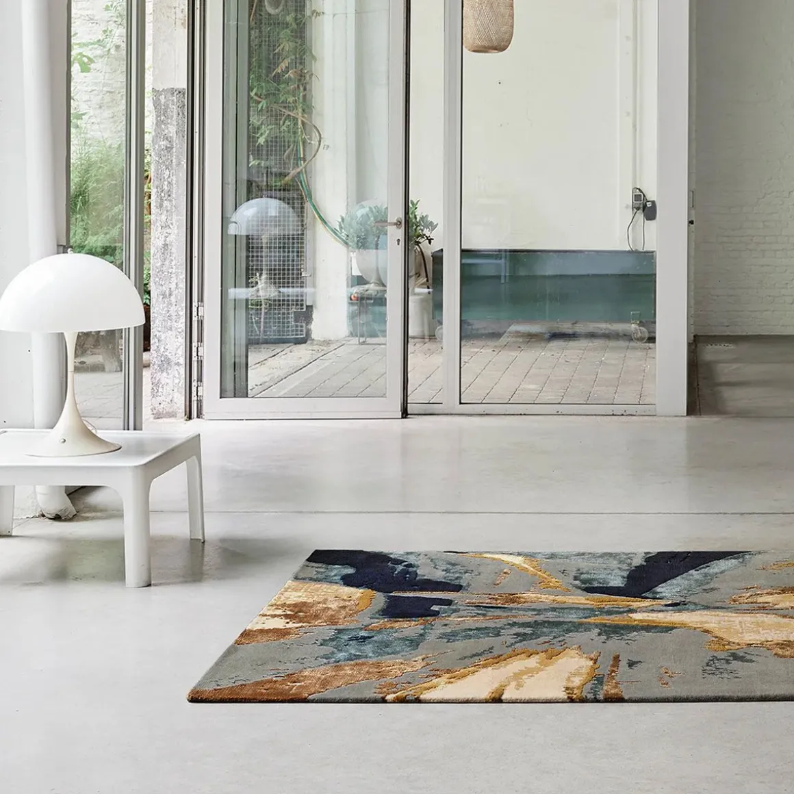 Le motif abstrait, éclatant et spectaculaire s’organise depuis le centre de ce tapis. Déployées en corolle, chaque zone colorée ressemble à un pétale dont l’ensemble dessine une fleur en train d’éclore sous la caresse des rayons de soleil.