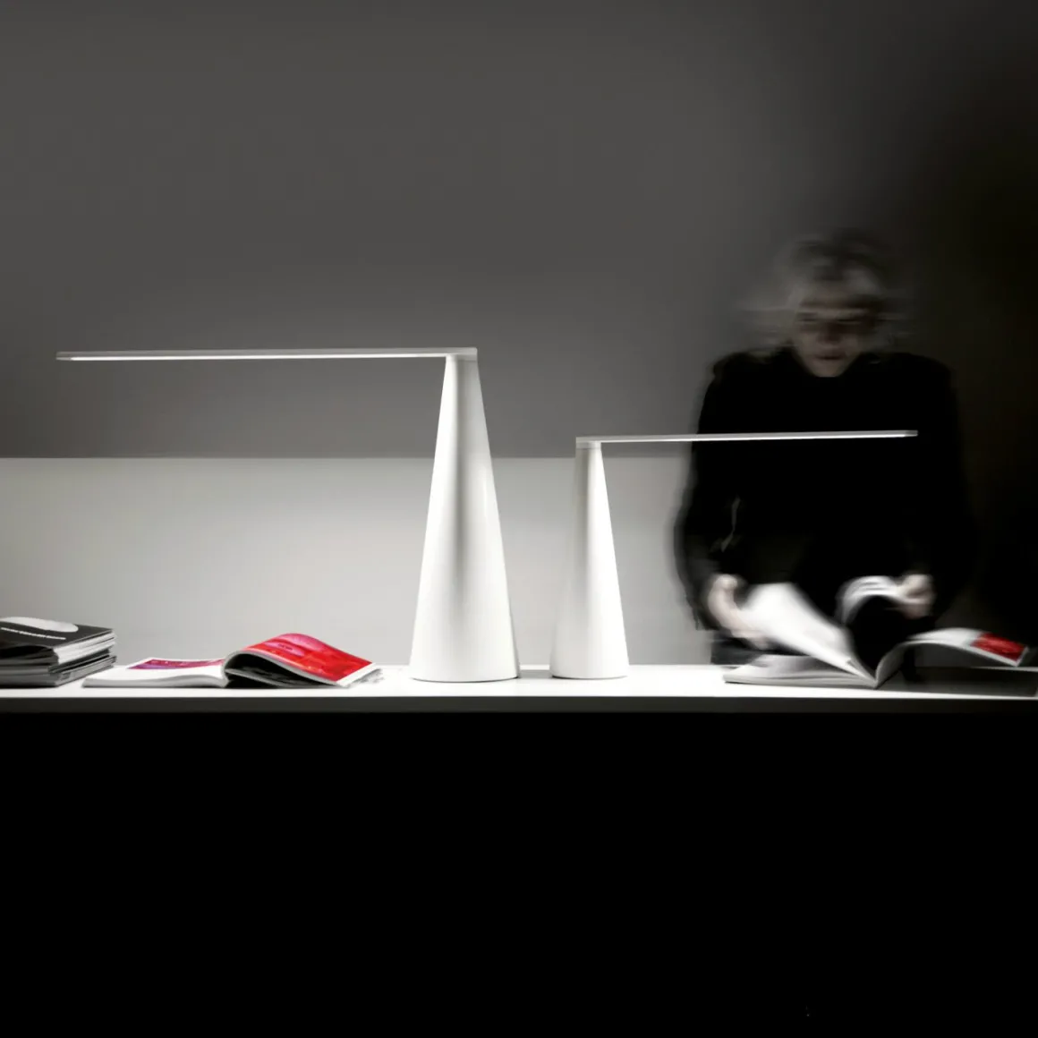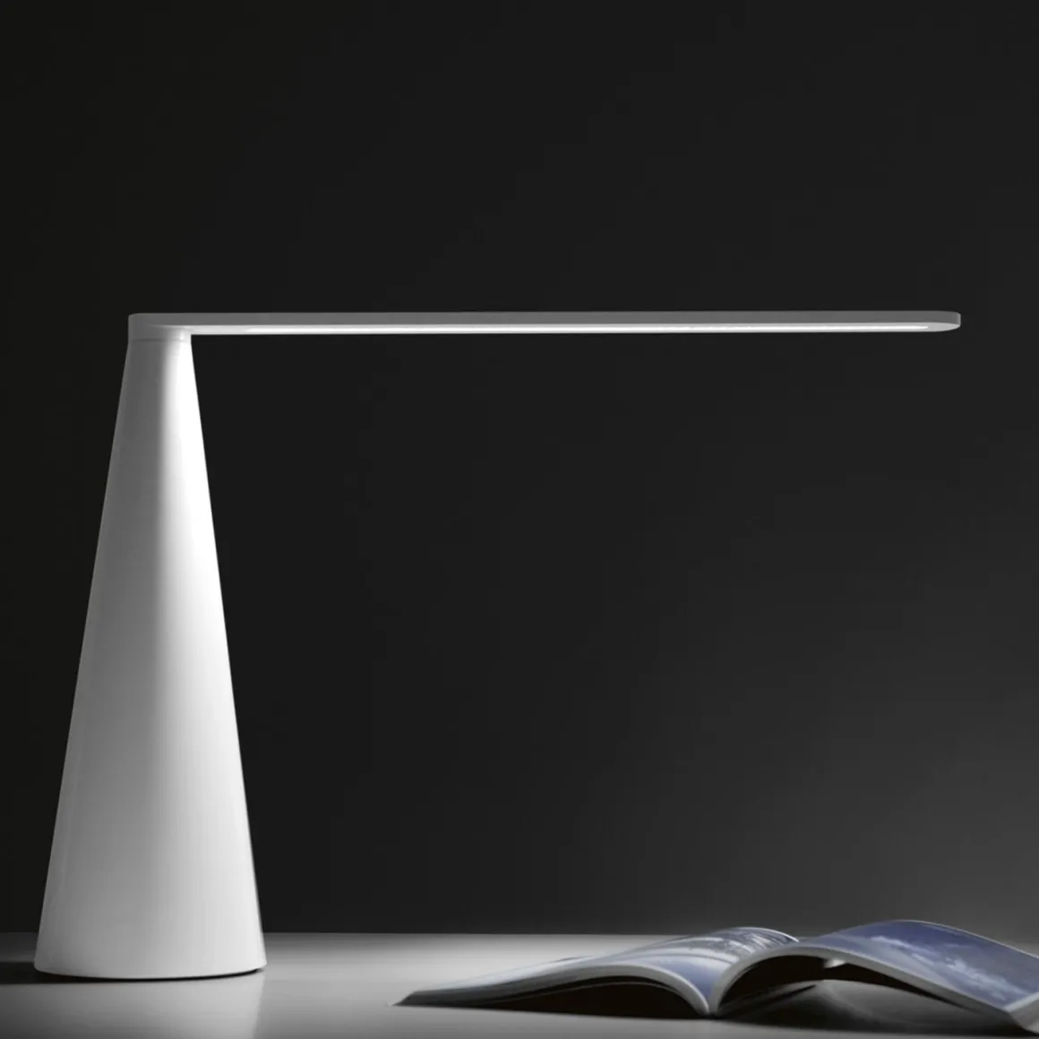Lampe Elica de Martinelli, avec corps en métal et un bras ajustable en aluminium peints en blanc. La lampe est controlée par la rotation du bras. Elle utilise une source LED. Dessinée par Brian Sironi en 2009, elle est disponible en deux tailles. Le mouvement produit la lumière, par rotation du bras, Elica ne se soulève pas par le haut mais elle illumine, il ,’y a pas d’interrupteur qui altère l’harmonie de sa forme; c’est un simple luminaire qui, comme un jeu amusant,permet à l’imagination et à la fantasie de s’envoler.