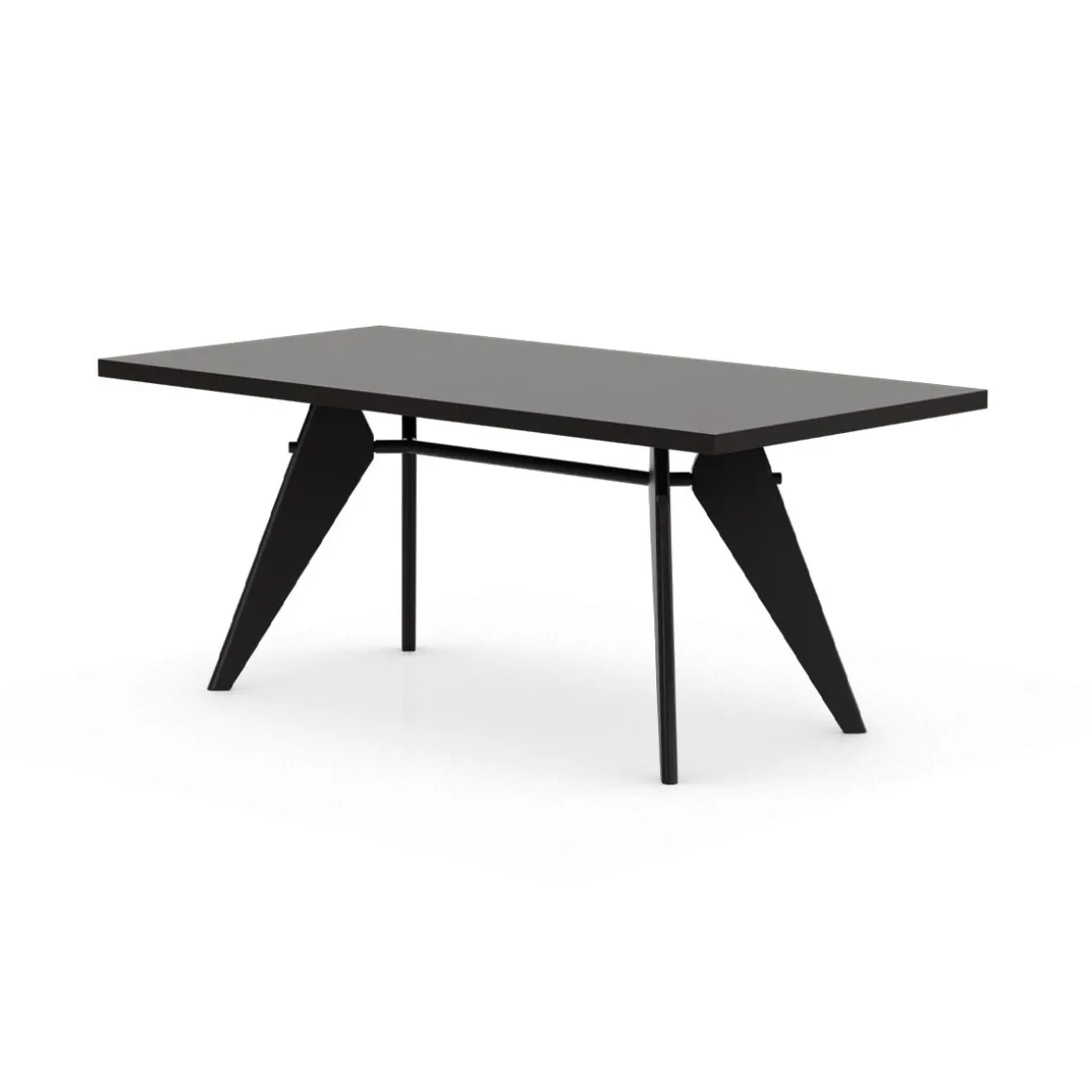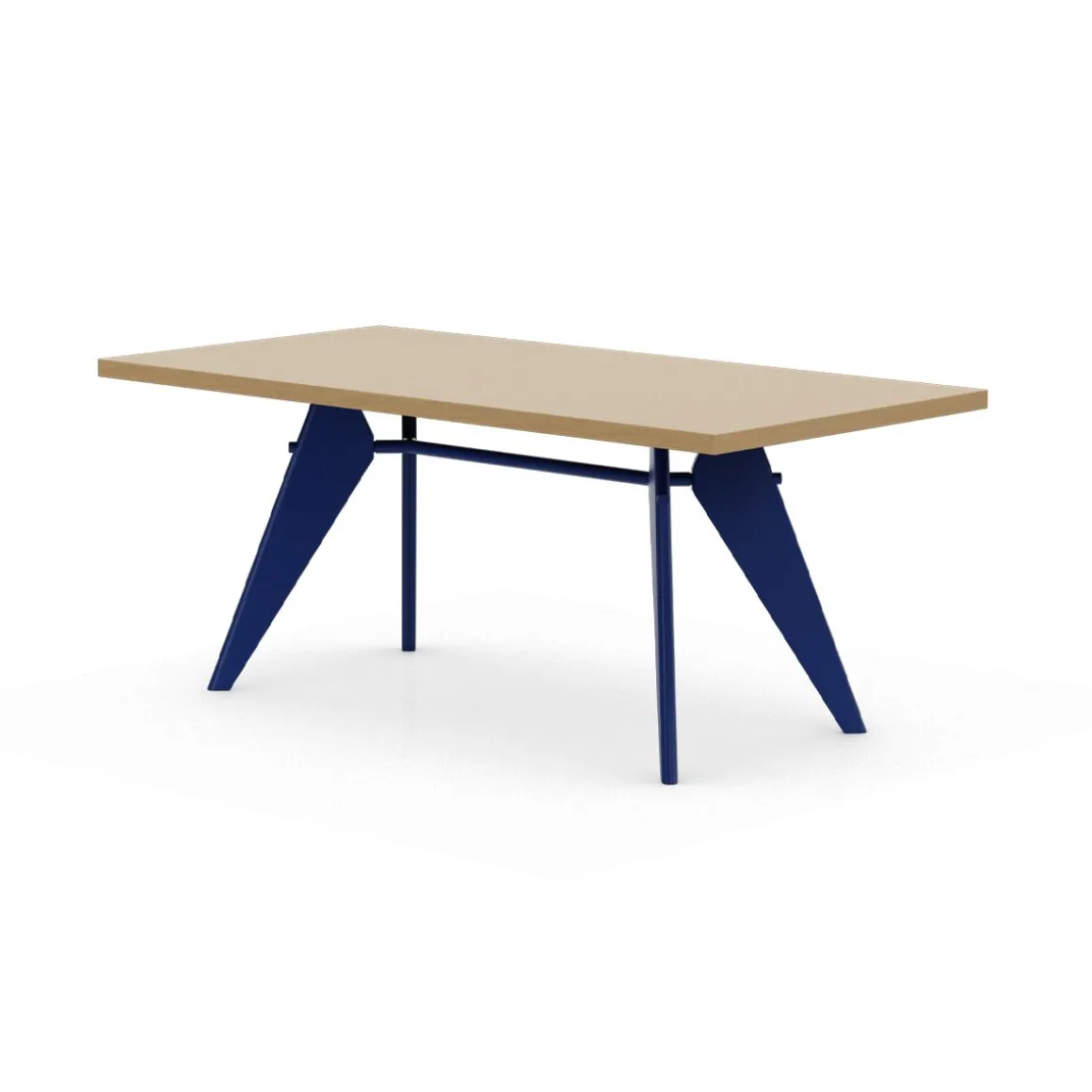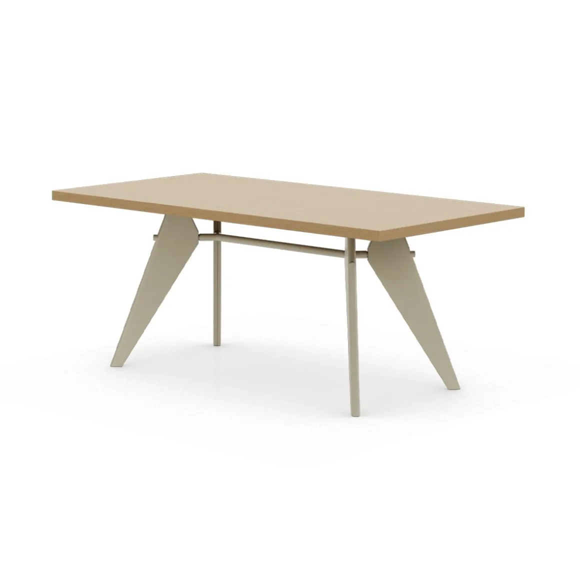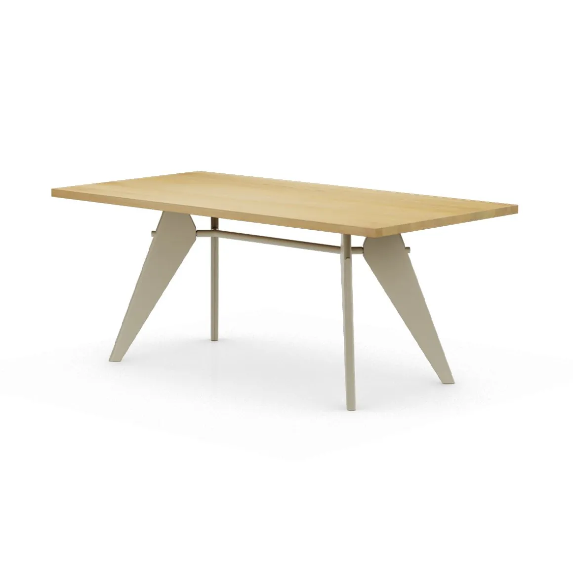 Le designer et ingénieur Jean Prouvé conçoit l’EM Table (Entretoise Métallique) vers 1950 pour le projet « Maison Tropicale ». Cette table empreinte de la pensée constructive jusque dans le moindre détail repose sur une esthétique de la nécessité. Les pieds inclinés sont reliés par une barre transversale, illustrant la propagation des formes et les rapports statiques à la manière des constructions d’ingénierie.