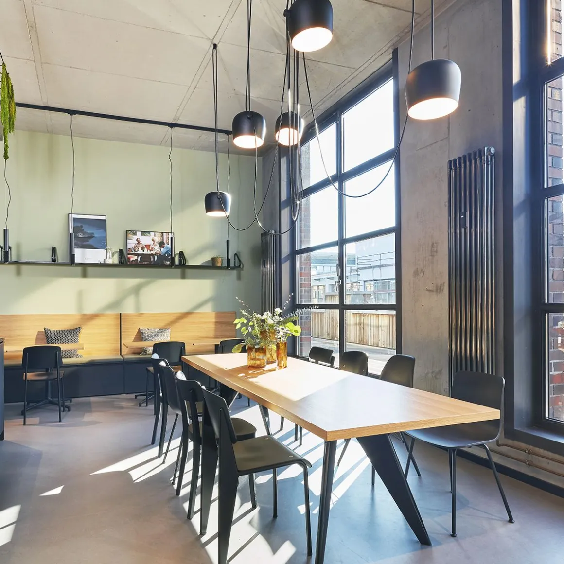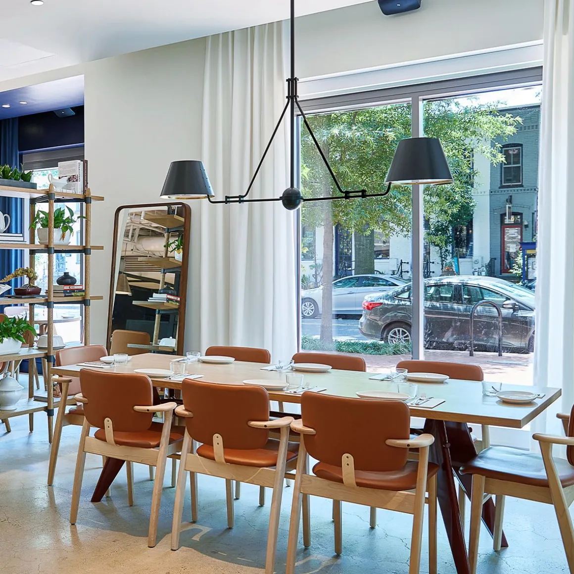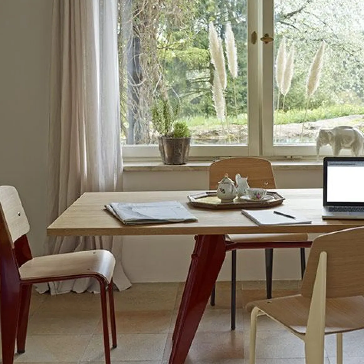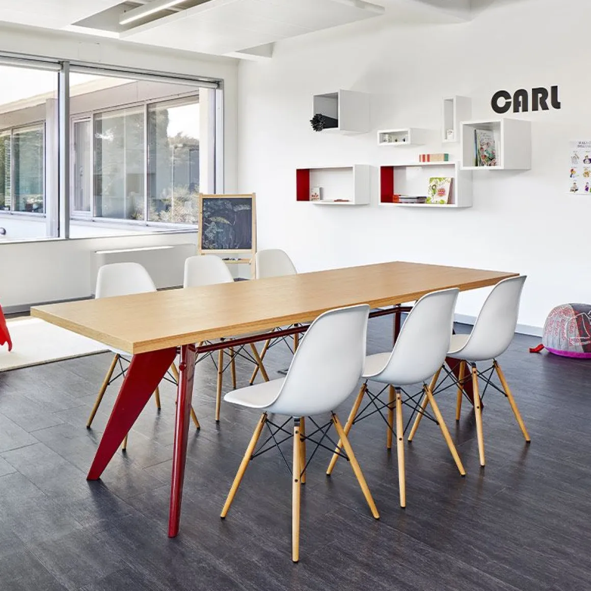 Le designer et ingénieur Jean Prouvé conçoit l’EM Table (Entretoise Métallique) vers 1950 pour le projet « Maison Tropicale ». Cette table empreinte de la pensée constructive jusque dans le moindre détail repose sur une esthétique de la nécessité. Les pieds inclinés sont reliés par une barre transversale, illustrant la propagation des formes et les rapports statiques à la manière des constructions d’ingénierie.