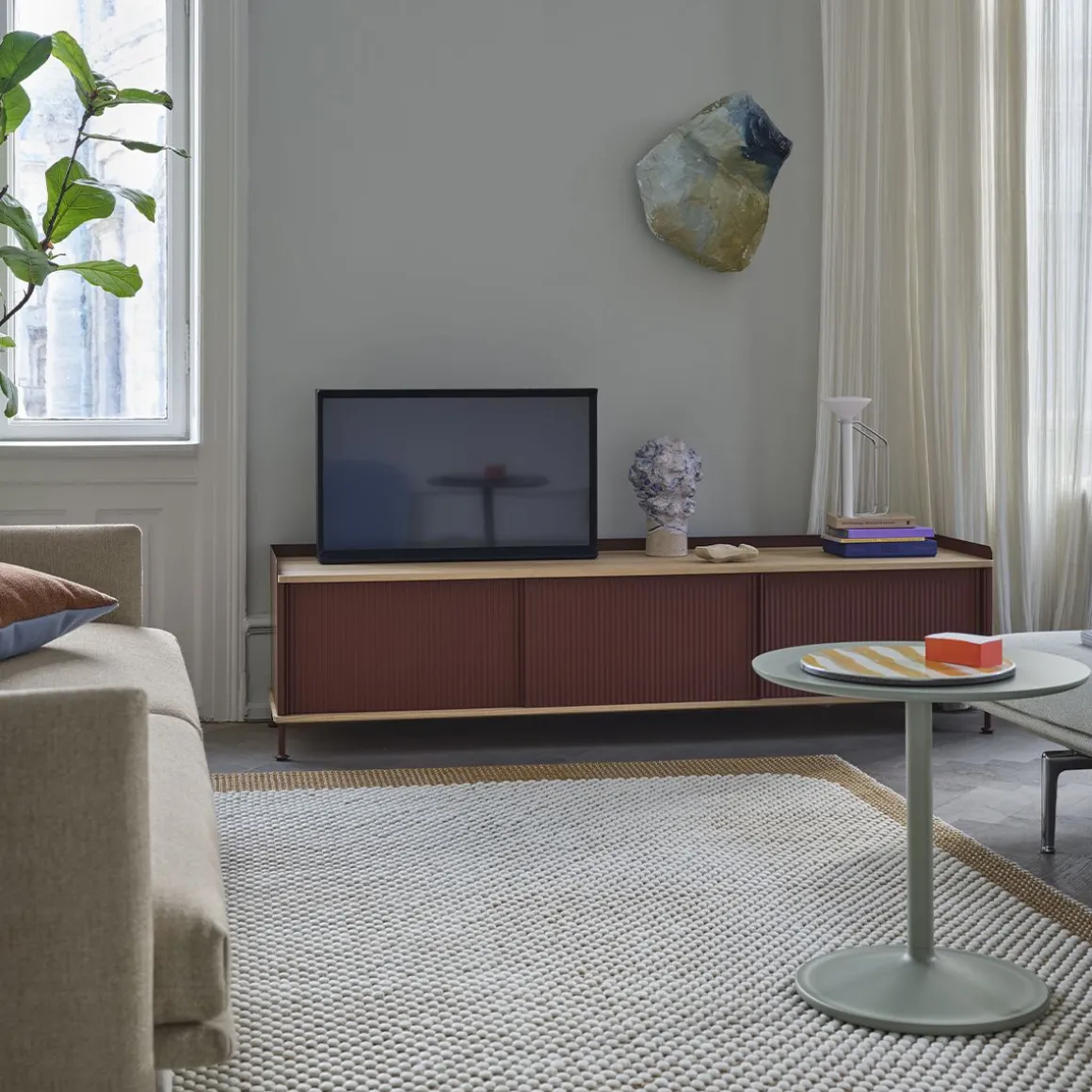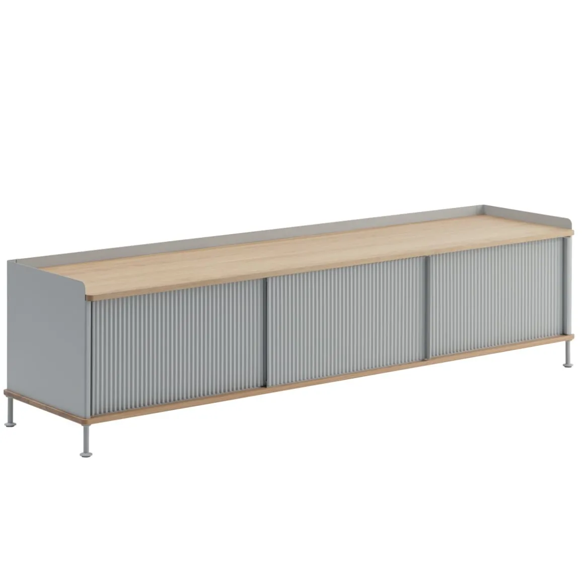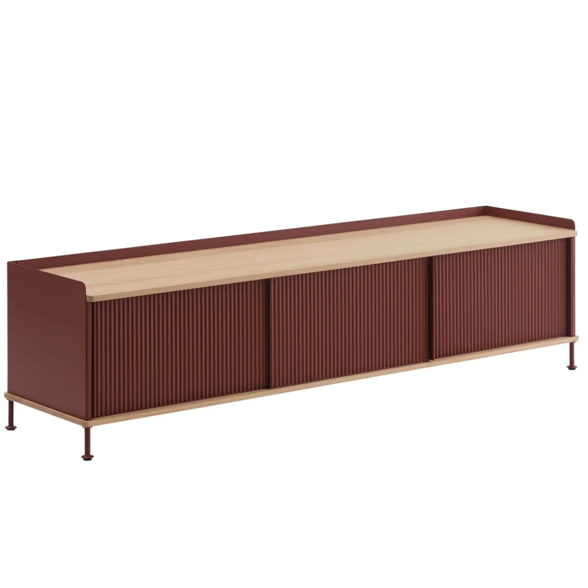 Le buffet Enfold combine la matérialité industrielle avec des références résidentielles pour une nouvelle perspective sur le stockage moderne. Fabriqué à partir d’un acier laqué qui enveloppe doucement son haut et son bas en chêne massif, le buffet Enfold fusionne des matériaux froids et chauds pour une expression unique, associée à l’expression vibrante et moderne de ses portes en acier striées. La conception flexible est disponible en quatre tailles, qui ont toutes des étagères réglables et des sorties de câble discrètes. Cela offre la possibilité de trouver la solution idéale pour votre espace, votre fonction et vos besoins – qu’il s’agisse d’une console multimédia, dans le couloir ou d’un buffet haut pour le rangement.