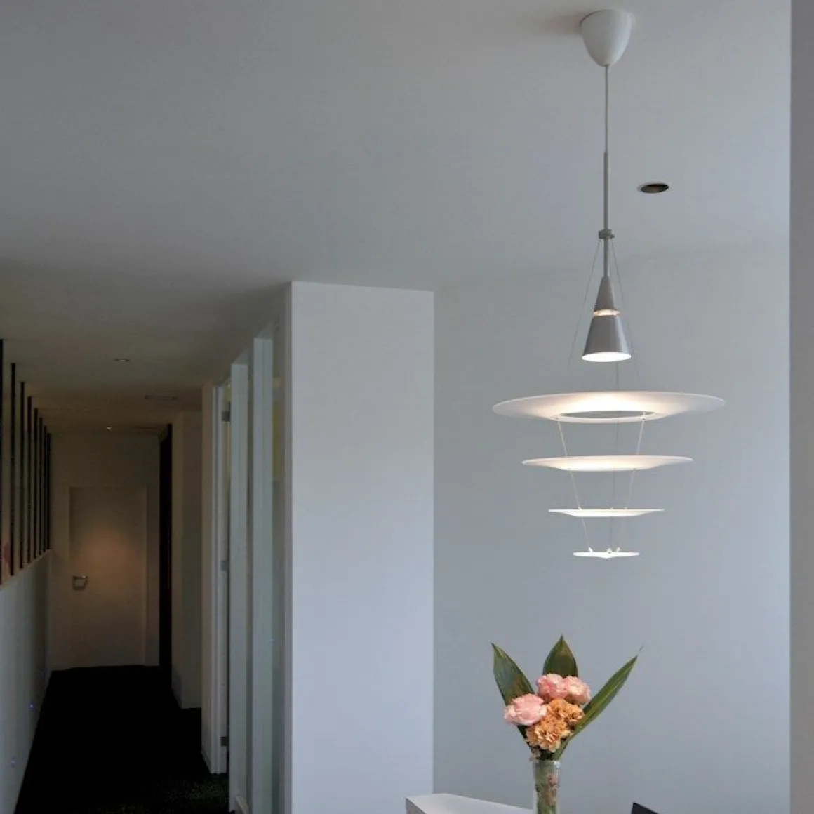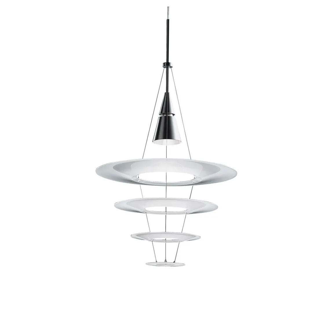 Matériaux : cône en aluminium brossé et laqué, suspension par câble en acier inoxydable, abat-jours en acrylique et peinture mate, tube de suspension en aluminium extrudé brossé
