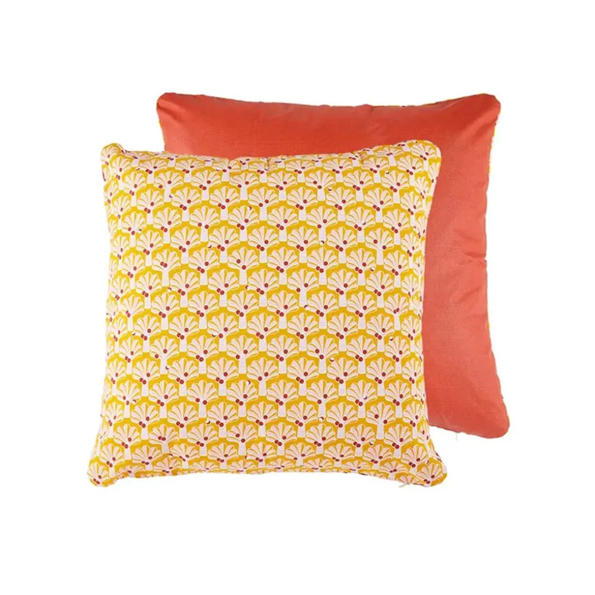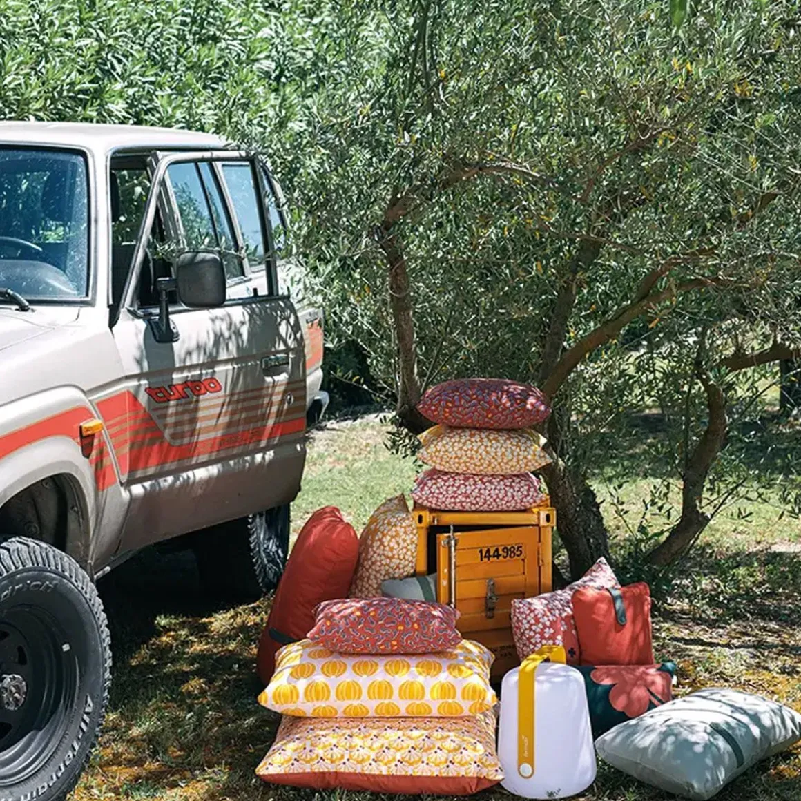Envie d’ailleurs – coussin cocotiers de Fermob. Tissu outdoor Verso en coton avec enduction acrylique et polyuréthane. Mousse en polyester, résistant aux taches et à la moisissure.