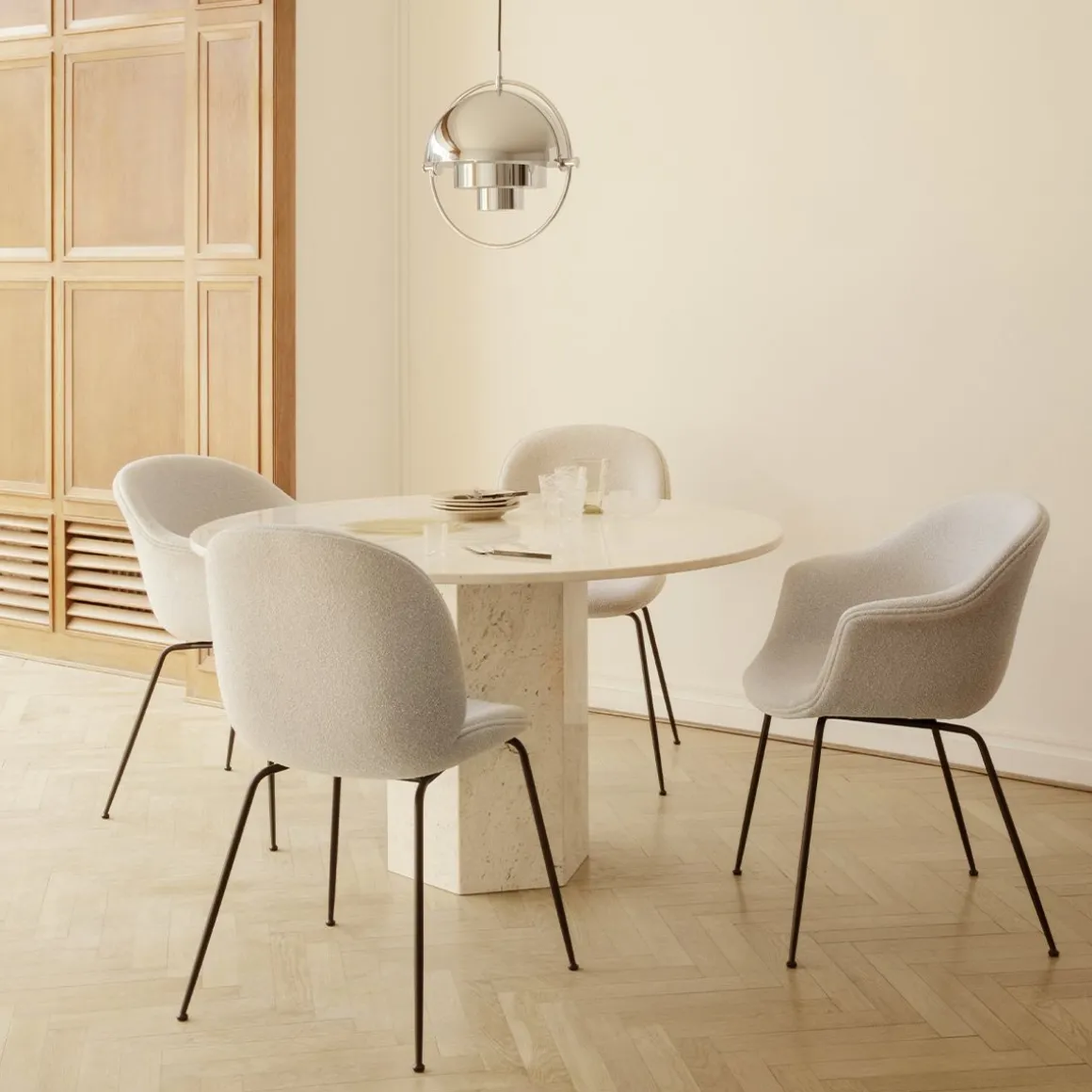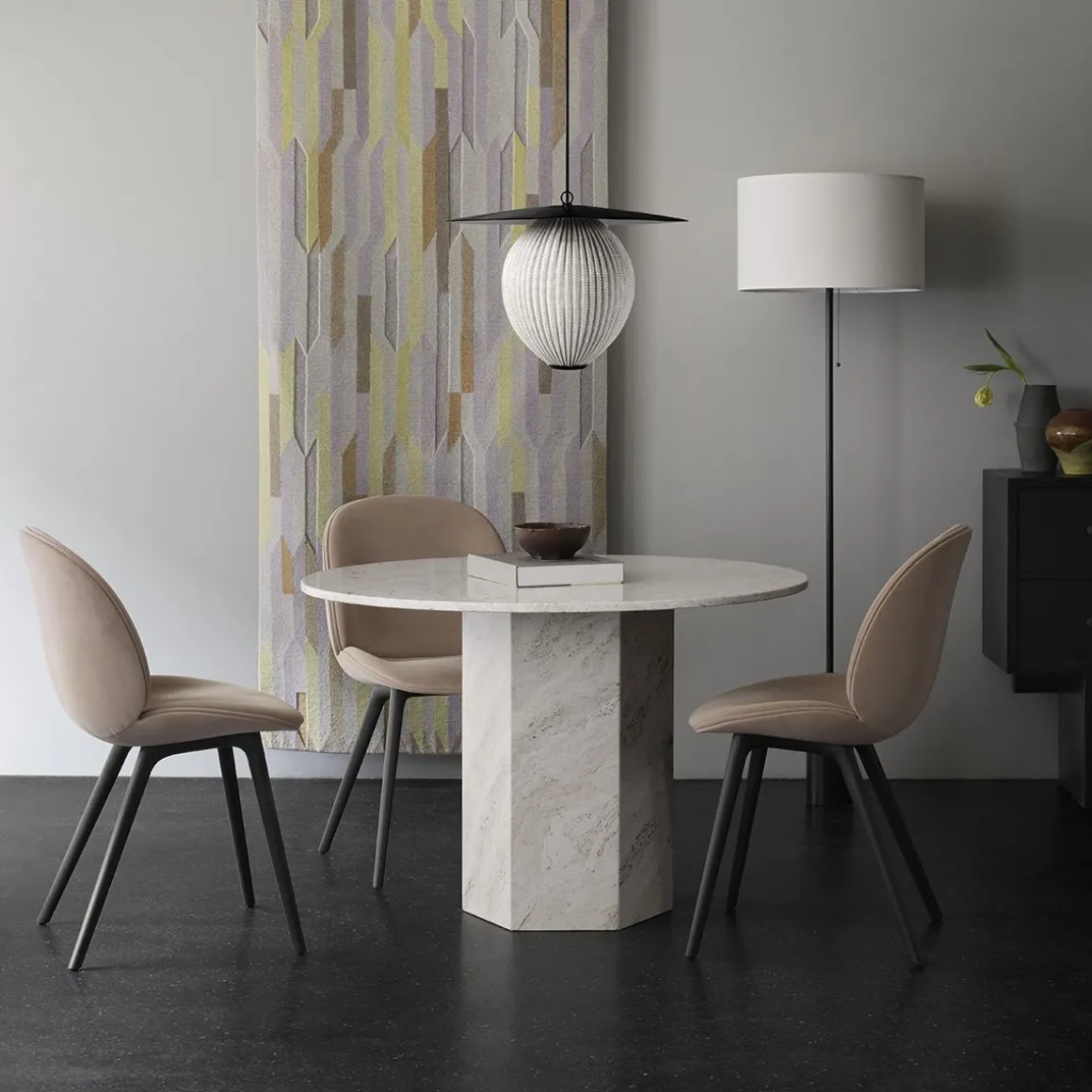 Epic Dining Table de Gubi par GamFratesi. C’est un meuble sculptural inspiré des colonnes grecques et de l’architecture romaine et nommé d’après les poèmes épiques des temps anciens. Fabriqué en Italie à partir de pierre de travertin, la forme monolithique souligne la matérialité de la pierre, la beauté naturelle de ses veines et la texture vibrante de sa patine unique.