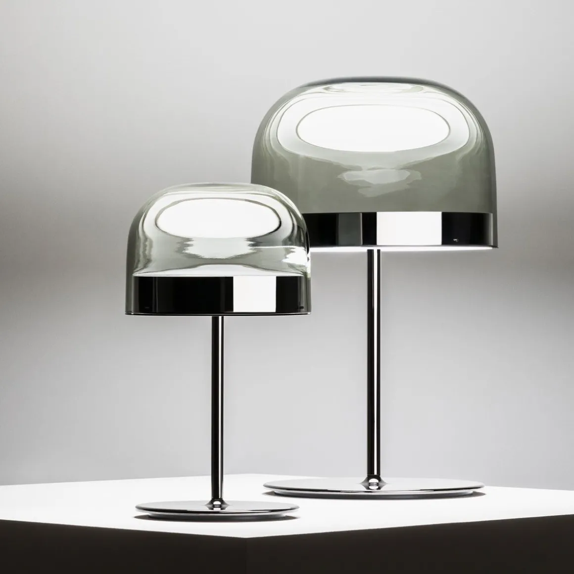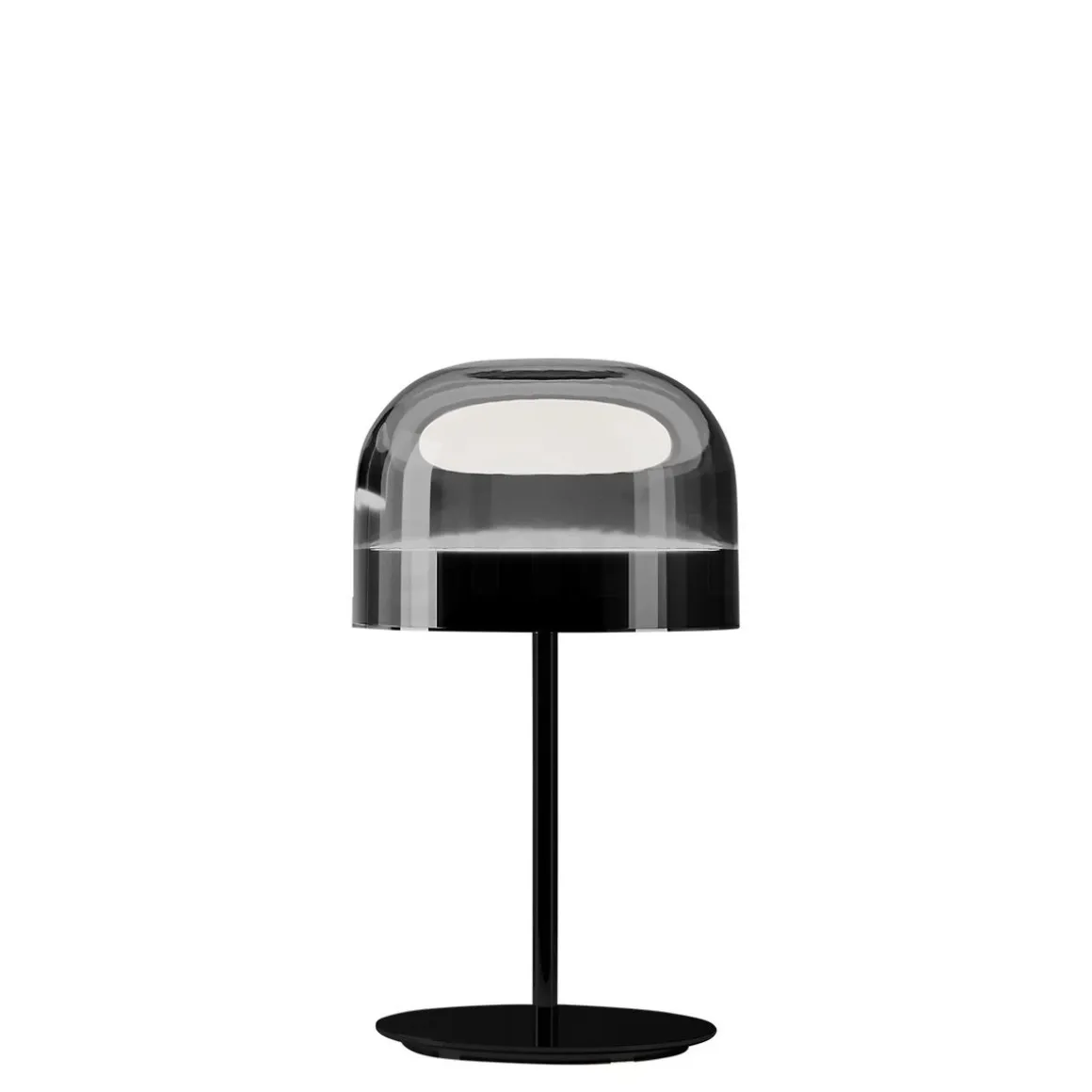 Equatore est la réinterprétation avec un goût contemporain des lampes classiques avec abat-jour en verre. Si, fans les abat-jour traditionnels, le diffuseur contient la source lumineuse, dans cette famille de lampes, il est paradoxalement et suggestivement vide et l’effet lumineux est produit part deux disques lumineux situés à l’intérieur d’une bande métallique centrale, visible sur l’abat-jour et rappelant la ligne de l’Équateur. La lumière produite par les led, grâce aux écrans intérieurs disposés en couches, se distribue régulièrement sur la surface des disques, en les faisant rayonner d’une lumière magique. Le disque inférieur produit une émission lumineuse vers le bas, tandis que le disque supérieur éclaire la calotte de verre, pour donner une diffusion douce de la lumière. Disponible en version de table, de sol, et à suspension, en deux mesures.
