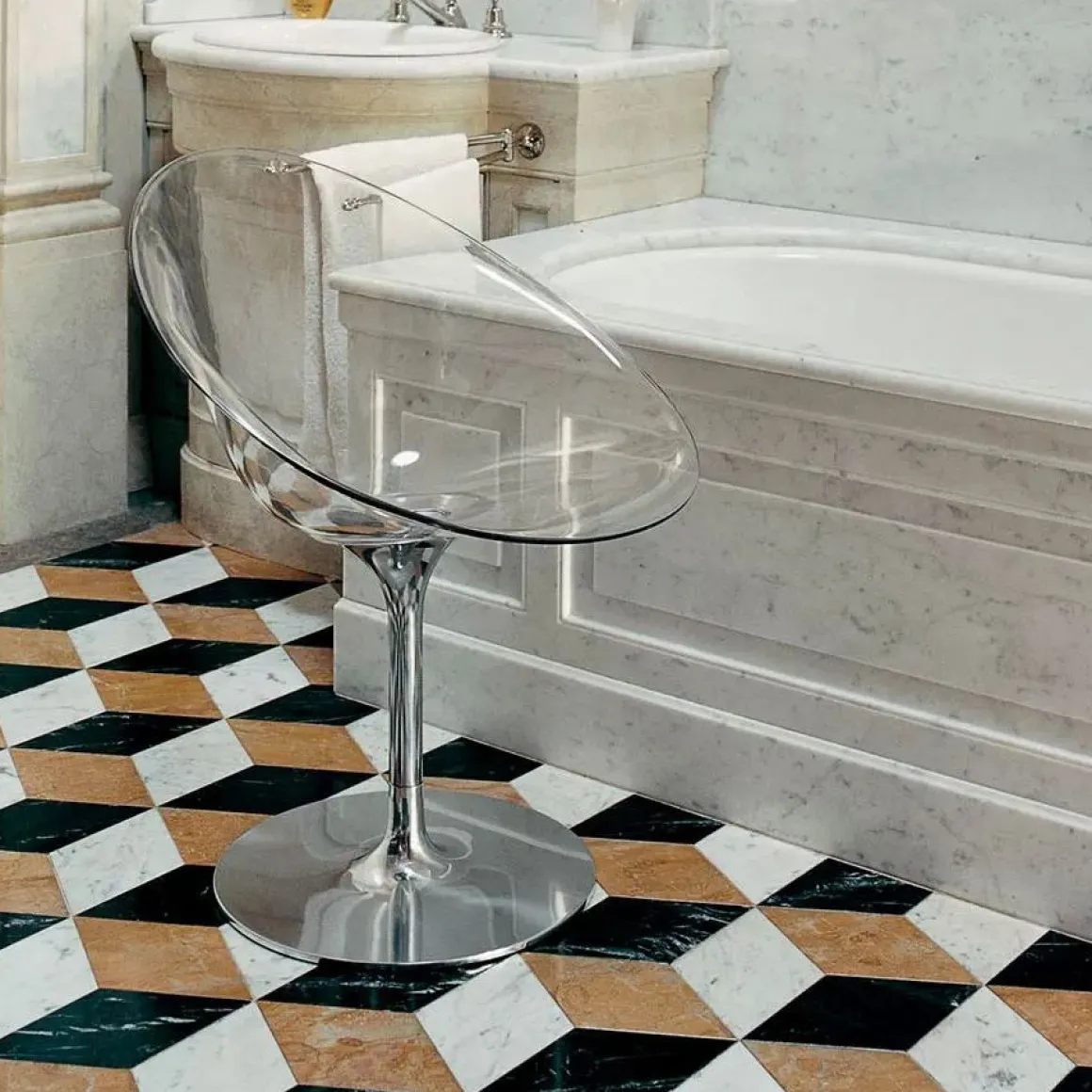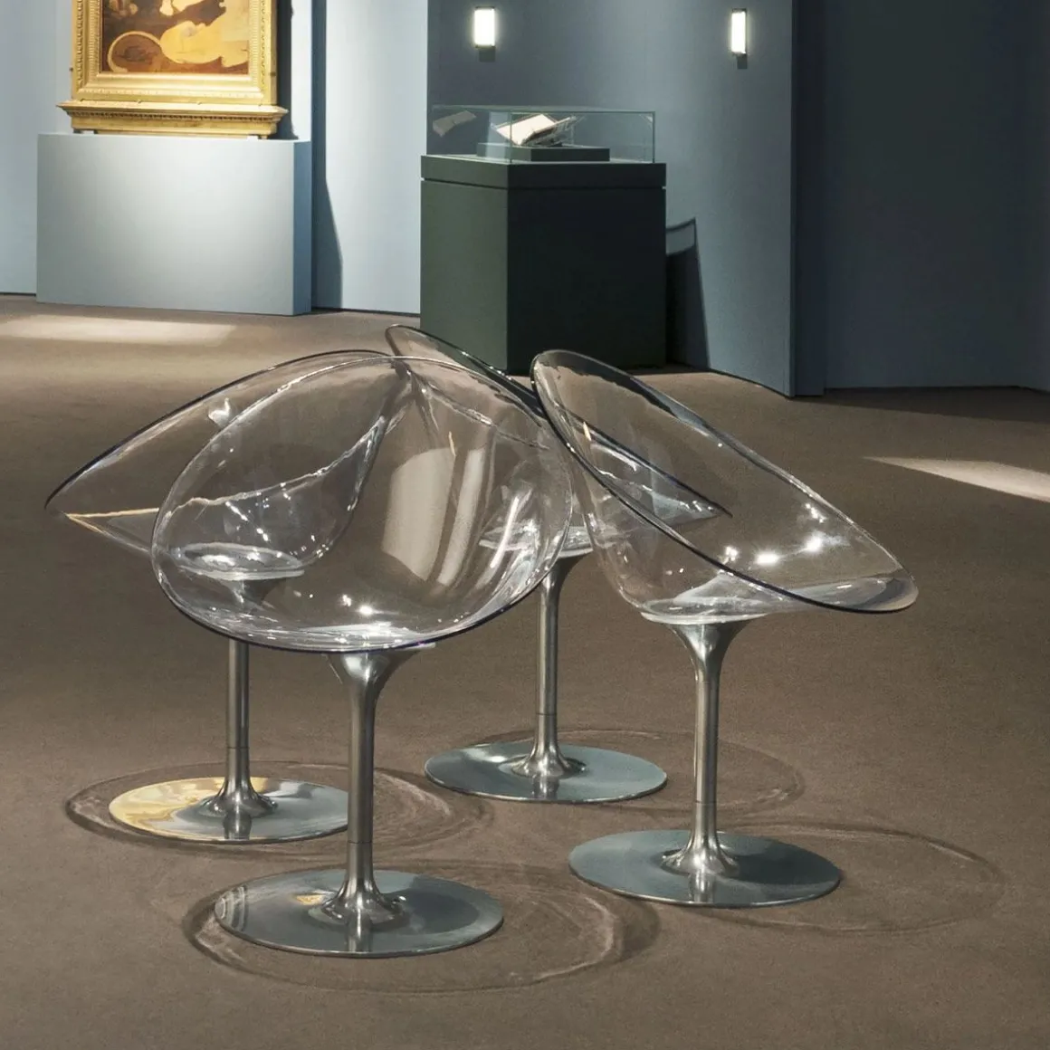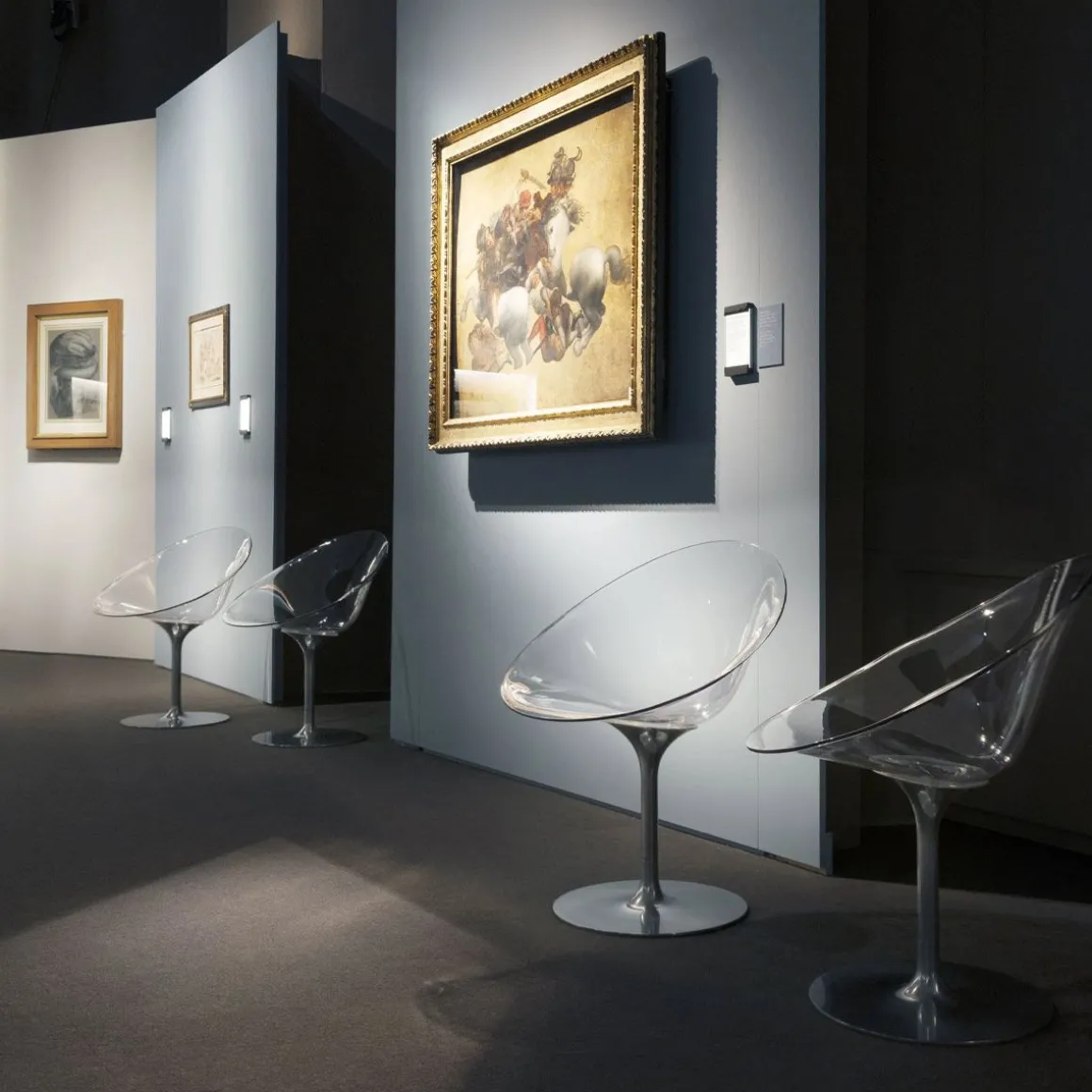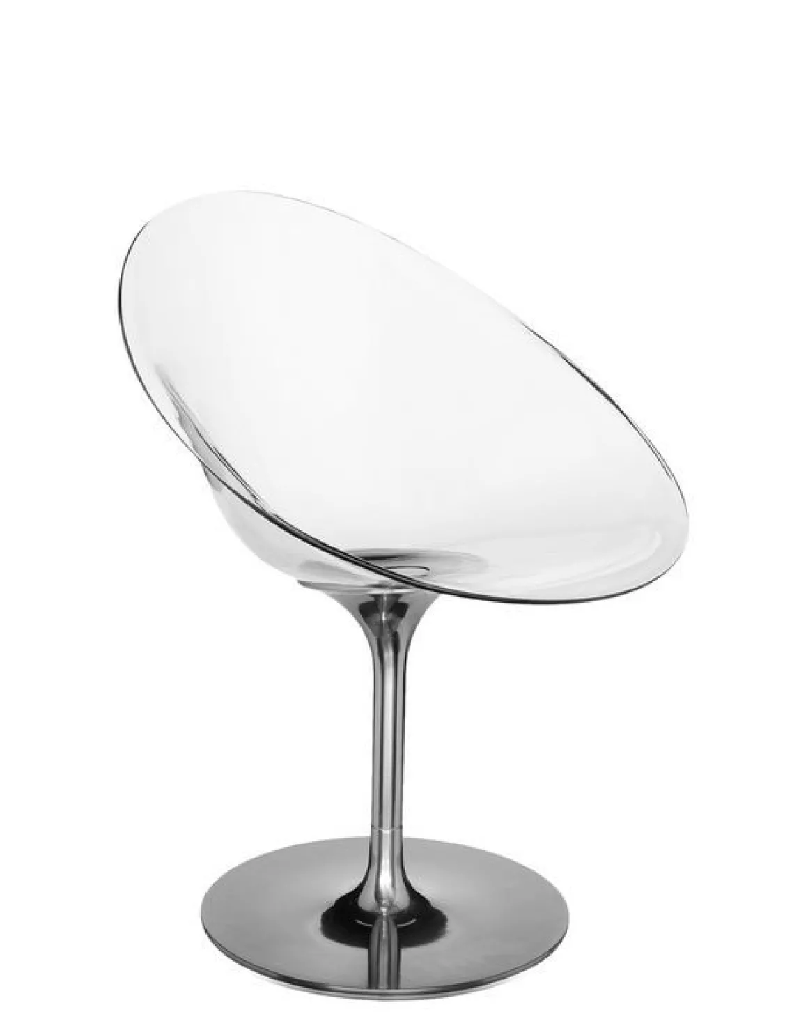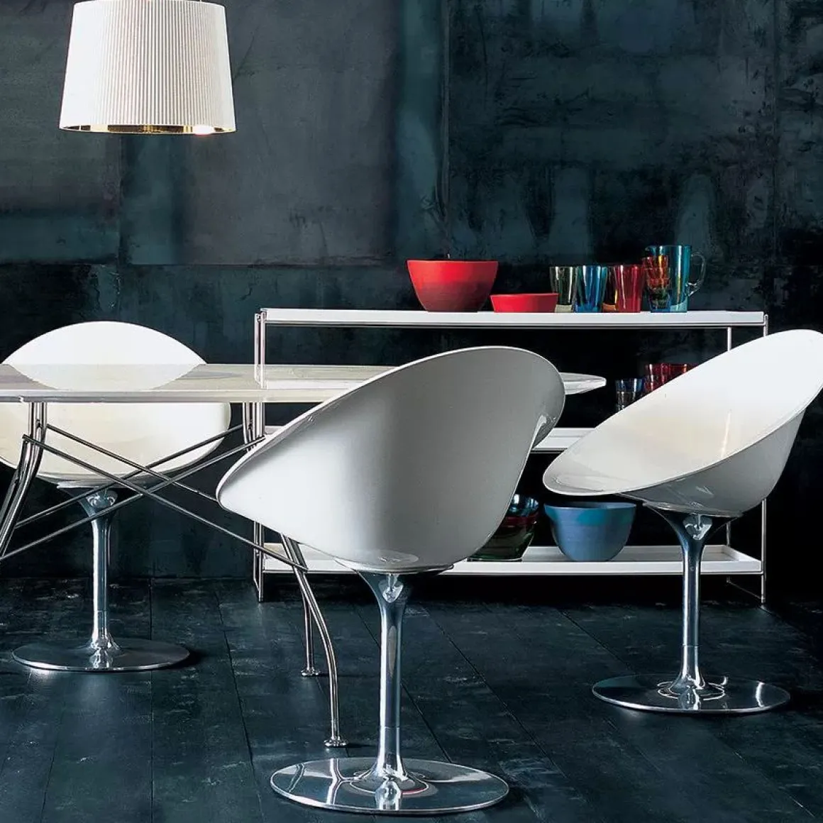 Ero’s est un petit fauteuil enveloppant ayant la forme d’un oeuf coupé, caractérisé par une combinaison raffinée des finitions et par une utilisation savante de la couleur. La qualité et la richesse des matériaux utilisés tant pour la coque que pour la base le rendent particulièrement élégant et sophistiqué. Ero’s est idéal pour la maison, dans la salle à manger ou le séjour, mais il trouve aussi sa place dans les bureaux, comme fauteuil de représentation dans les salles de conférence ou dans les salles d’attente. Le Eros’s 4835 se repose sur une base tournante à soutien central en aluminium poli. Diverses variantes chromatiques du polycarbonate existent tant dans la version transparente qu’opaque.