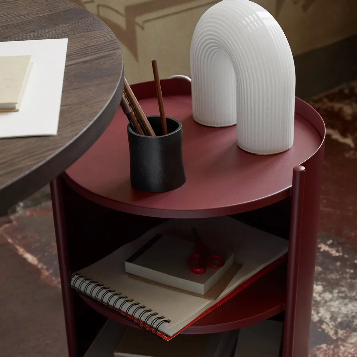 Défini par sa forme attrayante en cylindre et ses trois grandes roues, le Eve Storage est un meuble polyvalent fabriqué en acier durable recouvert de poudre, avec trois étagères, dont deux sont partiellement dissimulées derrière le cadre élégant. Placez une lampe de table sur l’étagère supérieure et utilisez le Eve Storage comme une table de chevet pratique, utilisez-le dans le salon comme une table d’appoint élégante ou dans le bureau pour ranger vos essentiels. Les roues fonctionnelles facilitent le déplacement du Eve Storage d’une pièce à l’autre, ce qui rend facile de répondre à tous vos besoins de rangement.