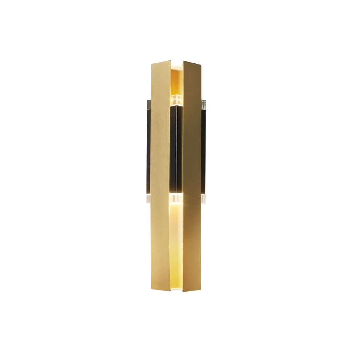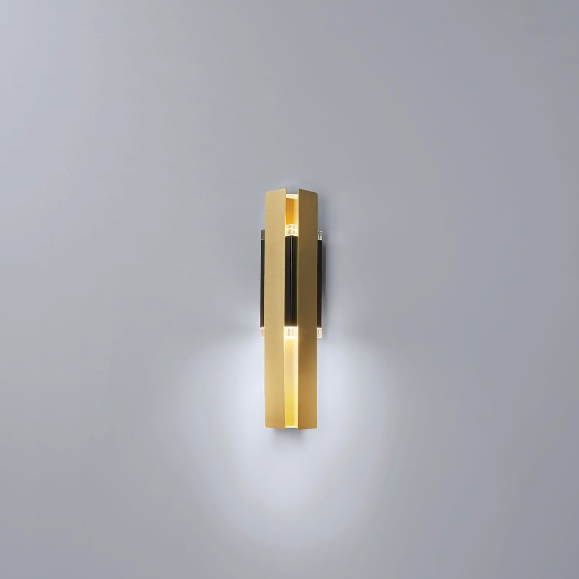 Exclalibur 559.41 de Tooy est une applique d’inspiration légèrement déco avec une base triangulaire. Le corps est en revêtement noir et la lumière est répartie à travers 2 prismes en plexiglas, tout ceci enveloppé dans 3 feuilles de laiton brossé rectangulaires.