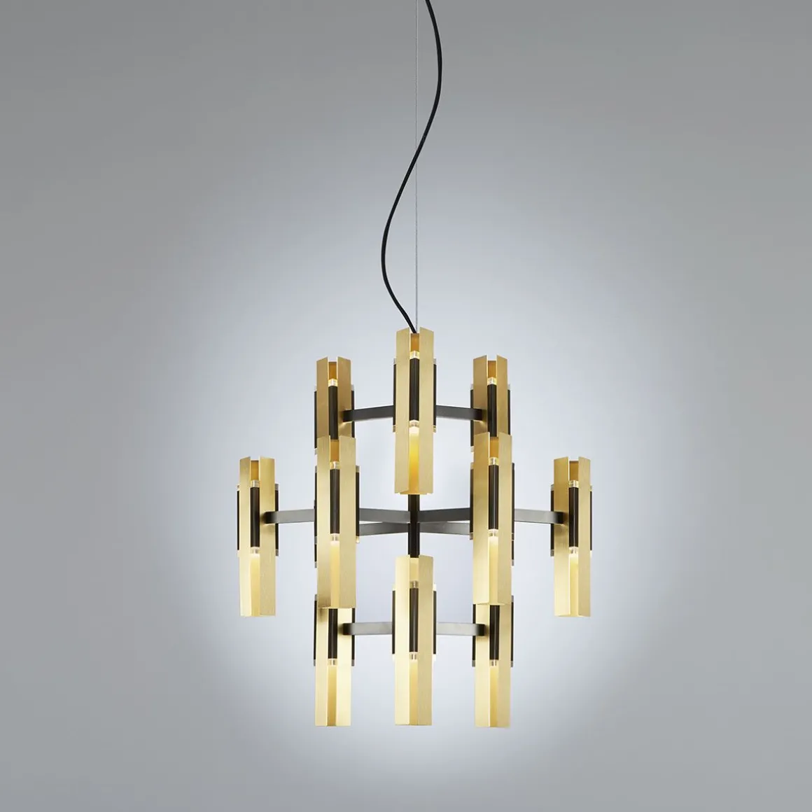 Exclalibur 559.12 de Tooy est une suspension d’inspiration légèrement déco avec une base triangulaire. Le corps principal est en revêtement noir et la lumière est répartie à travers 2 prismes en plexiglas, tout ceci enveloppé dans 3 feuilles de laiton brossé rectangulaires.