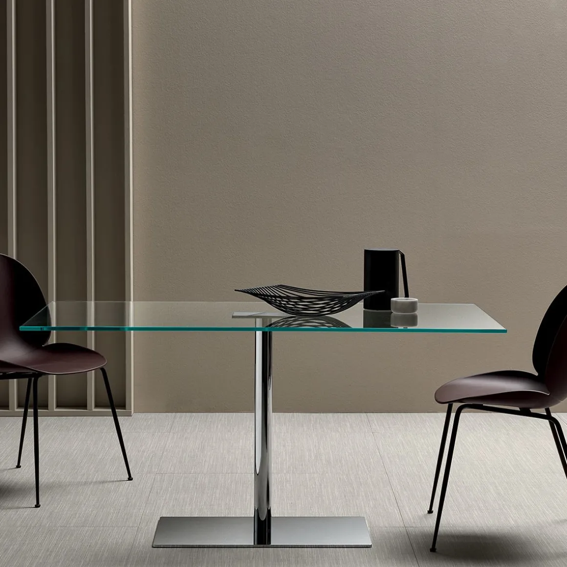 Table haute en verre trempé. Base en métal chromé. Disponible en trois versions : carrée, ronde et rectangulaire.
