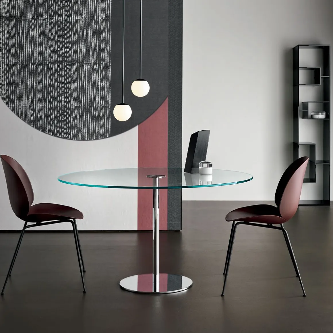 Table haute en verre trempé. Base en métal chromé. Disponible en trois versions : carrée, ronde et rectangulaire.