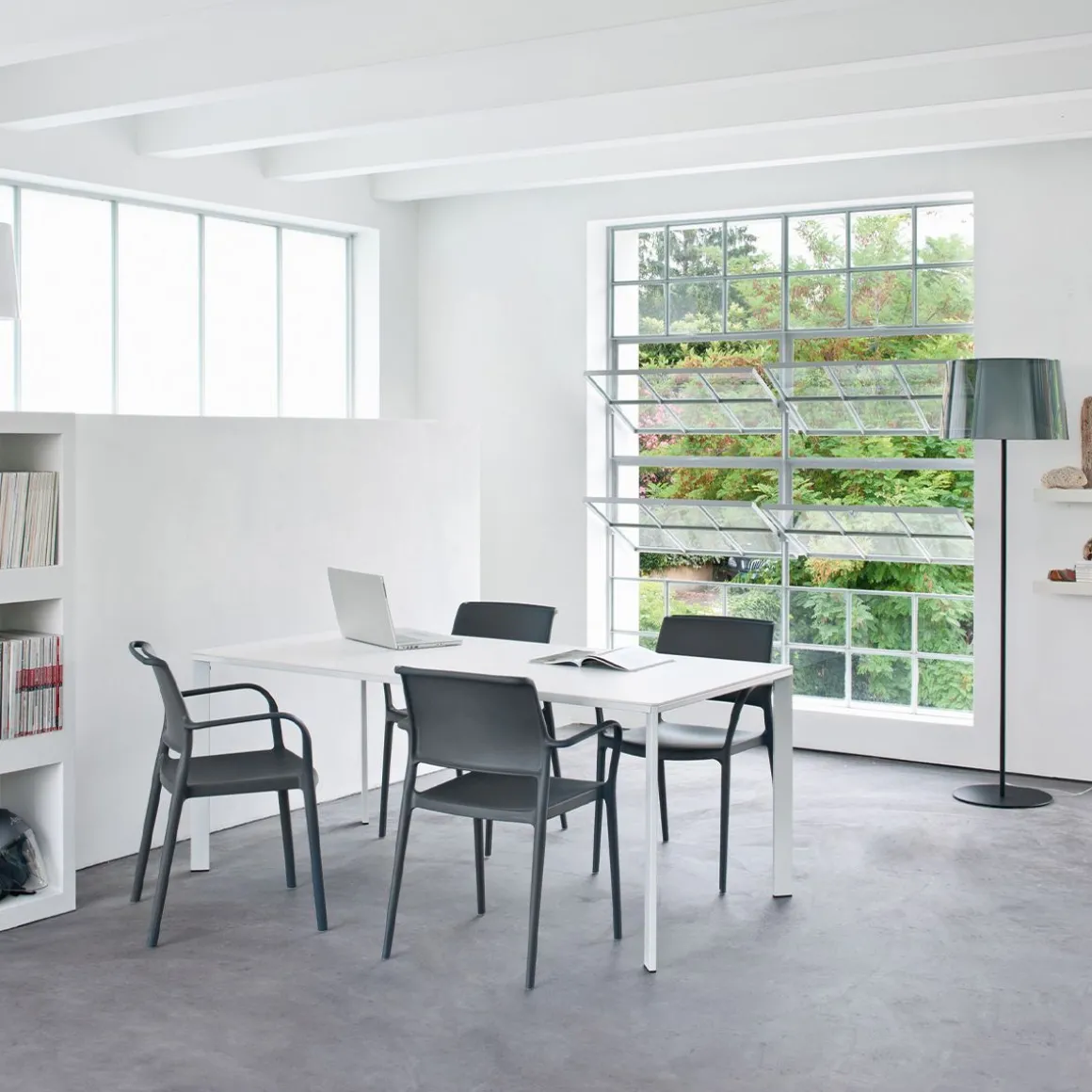 Fauteuil injecté en polypropylène chargé à fibres de verre, empilable et valable pour indoor et outdoor. La structure du dossier réalise, dans la partie haute, une grande poignée qui facilite le soulèvement et le déplacement de l’assise et qui lui donne un caractère distingué. Grâce à la forme effilée des pieds, le fauteuil paraît léger et élégant, cependant il est très résistant et indéformable.