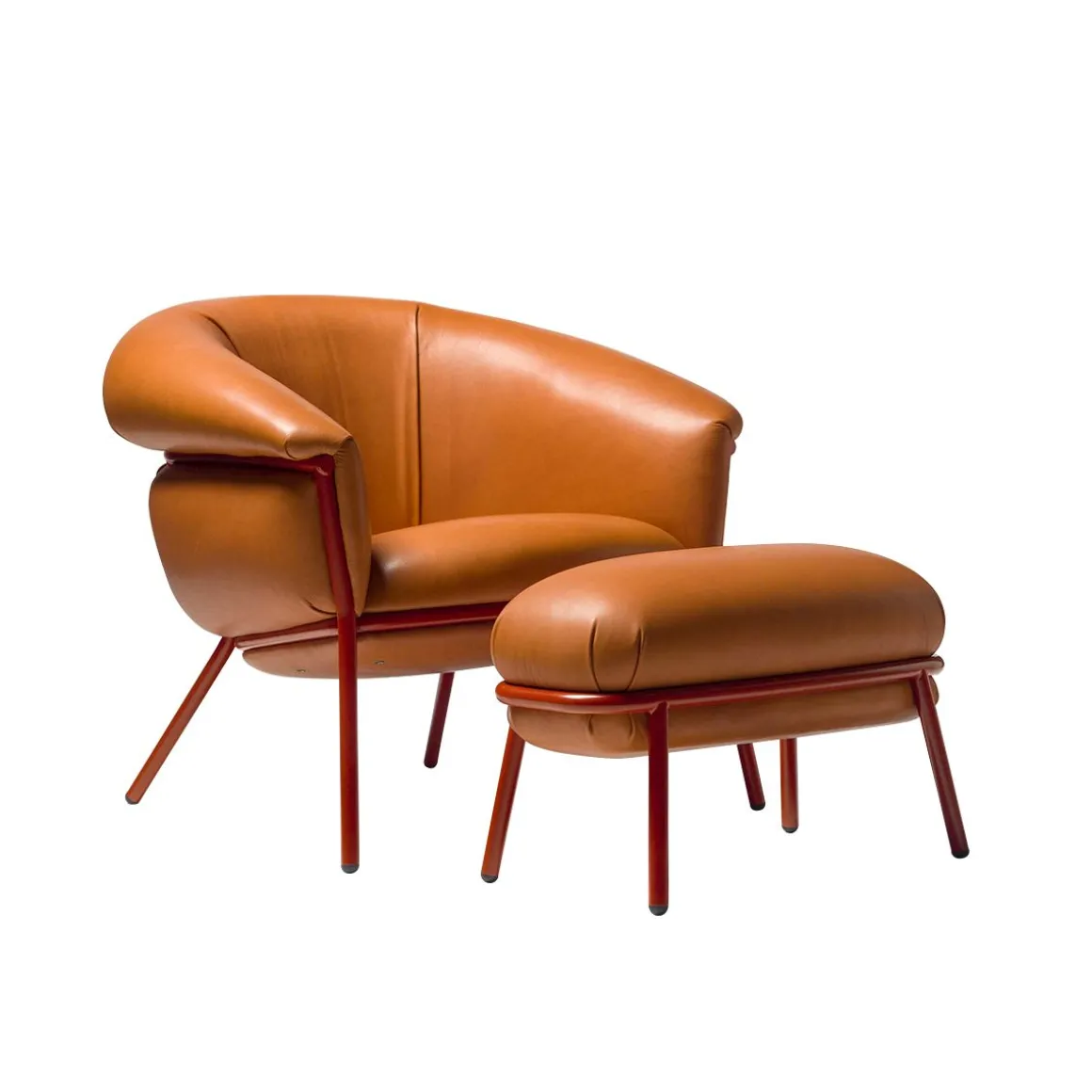 Matériaux : fauteuil et repose-pieds en structure tubulaire en acier peint en polyester, tapissé de différents cuirs et tissus fournis par BD
