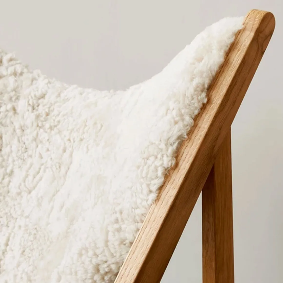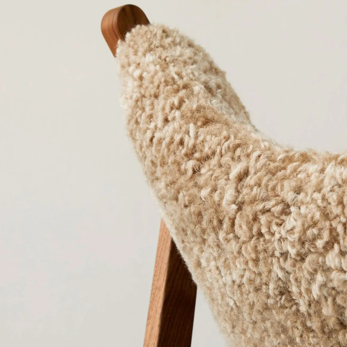 Matériaux : chêne massif ciré et huilé, chêne ou noyer teinté foncé, l’assise et le dossier en contreplaqué courbé et recouvert de peau de mouton
