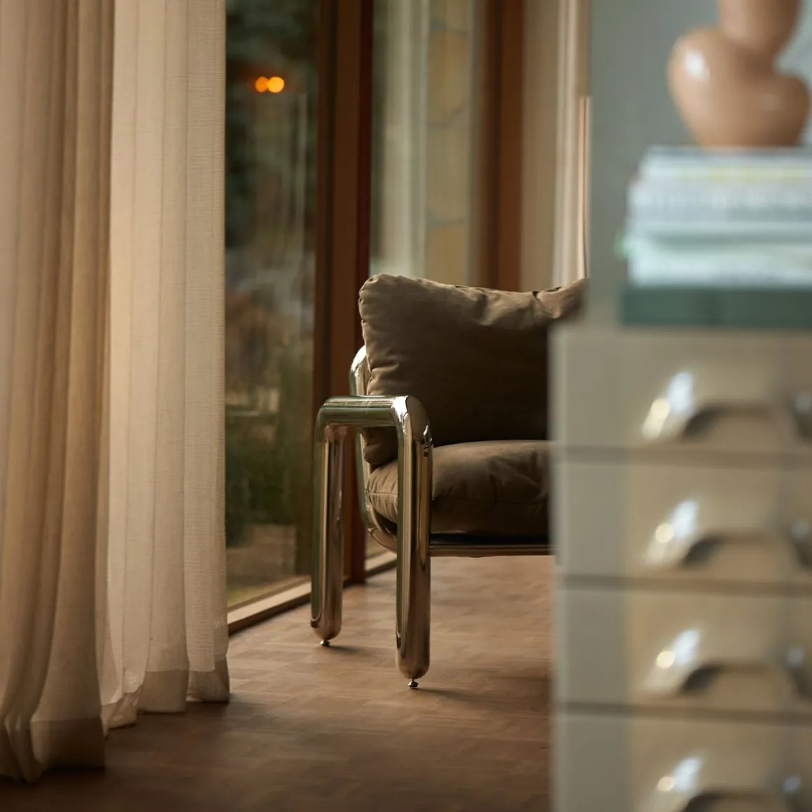 La base chromée renforce son esthétique potelée et épurée, tandis que la résistance la stabilité et le confort garantissent des années d’utilisation quotidienne. Conçu pour fusionner une base chromée robuste et un caractère rebelle avec la douceur et la chaleur du siège en toile ou velours dans des matériaux contrastés.