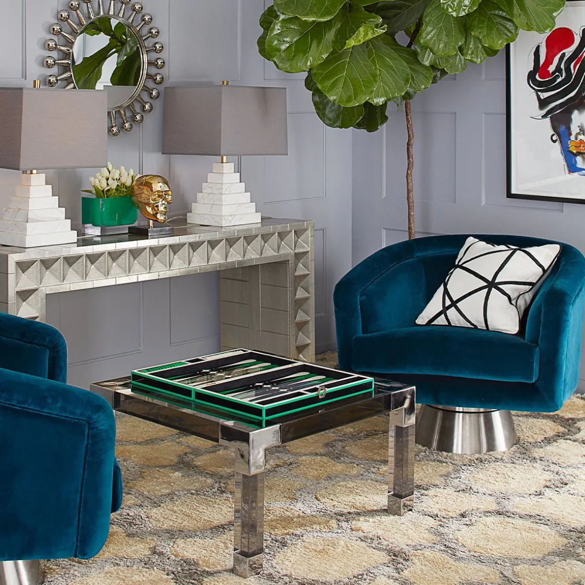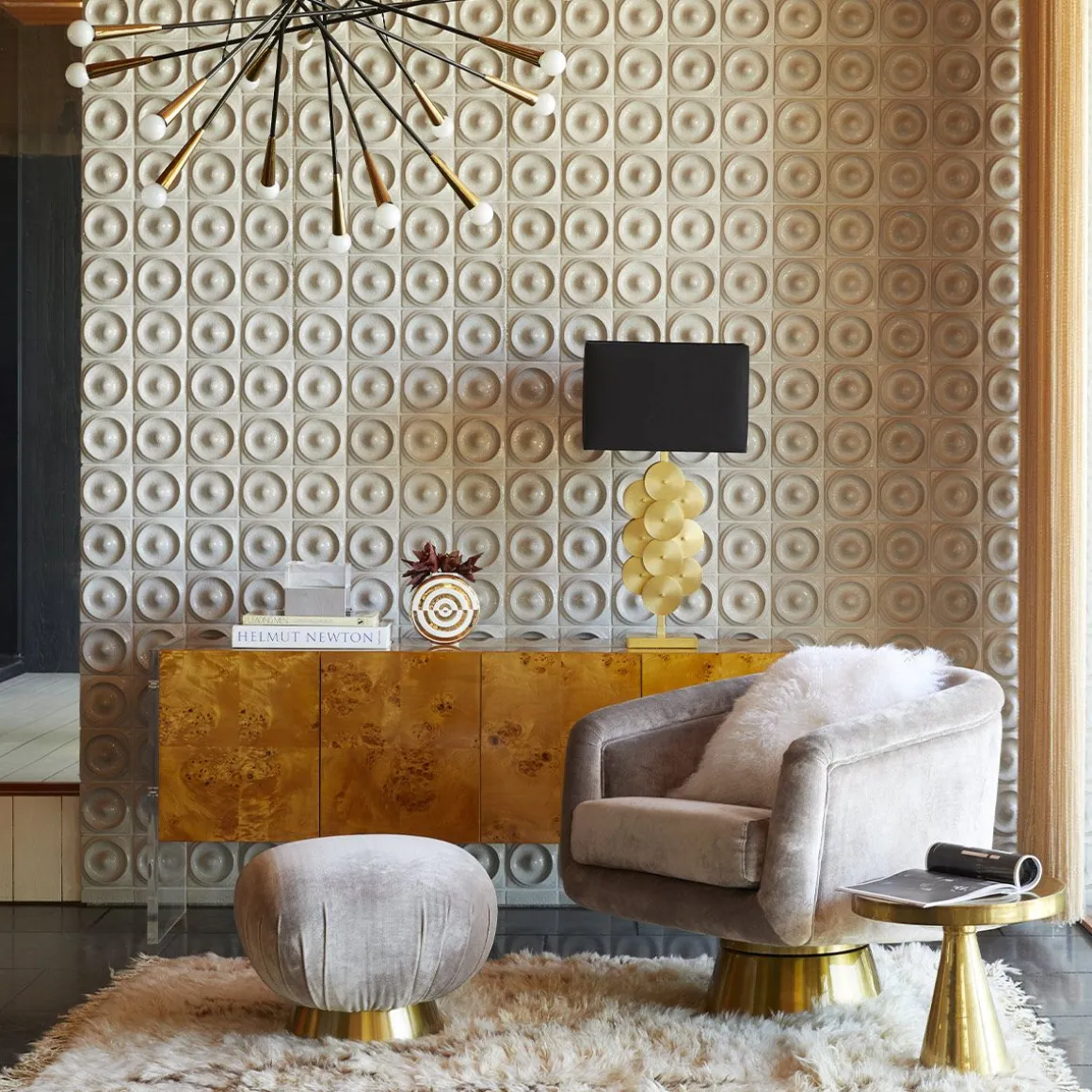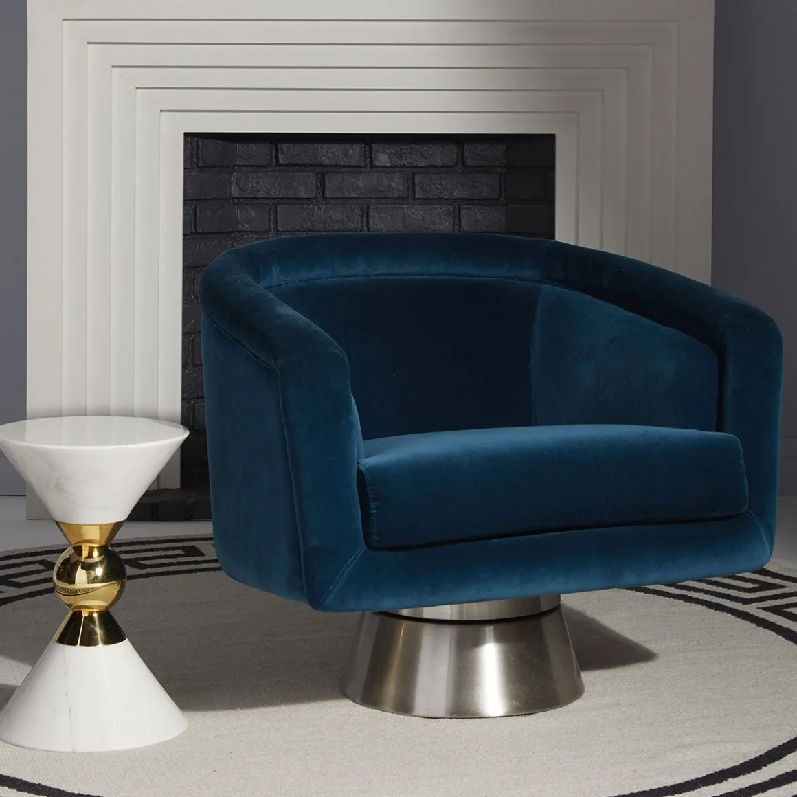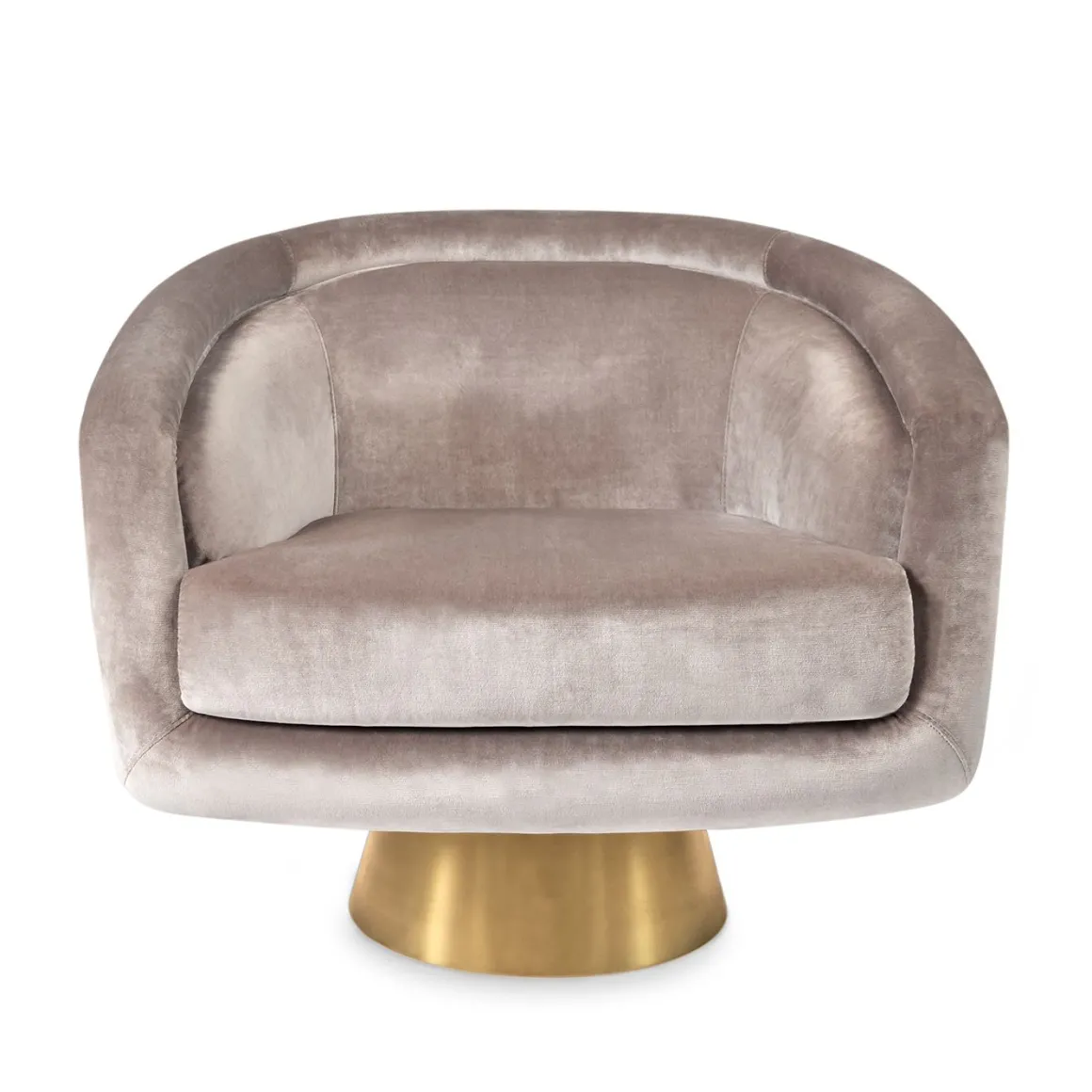 Pensez Halston, pensez au Studio 54, pensez au style sybaritique. Mais pensez aussi à une chaise pivotante douillette et confortable. Disponible en velours luxueux Rialto Reef sur une base pivotante en acier inoxydable brossé ou en velour Côme Champagne de rêve sur une base pivotante en laiton brossé