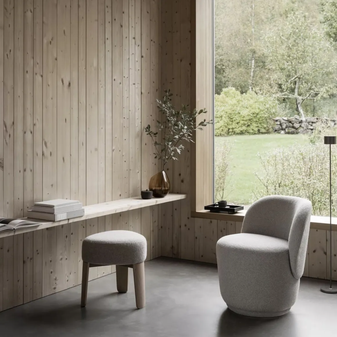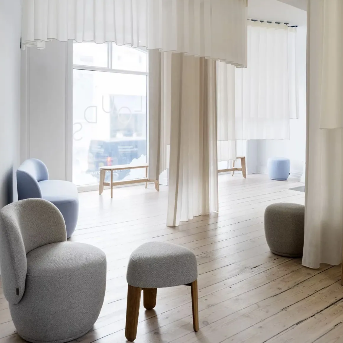 Une forme arrondie, accueillante et confortable. C’est ainsi que l’on peut décrire la série de meubles rembourrés KUON. Composé de 2 tabourets, en chêne clair et teinté, de 2 fauteuils, avec et sans fonction pivotante, et d’un 2 places, diverses utilisations possibles sont proposées. La série conçue par le designer japonais Kazushige Miyake avec un tissu bouclé durable.