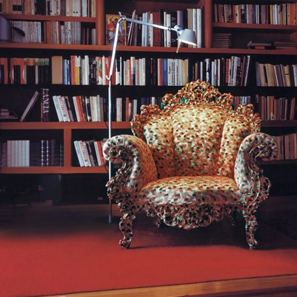 L’une des pièces de design les plus acclamées au monde, le fauteuil Proust d’ Alessandro Mendini a été lancé en 1978, lorsqu’il a été utilisé pour meubler le Palazzo dei Diamanti, à Ferrare lors d’une exposition intitulée « Incontri ravvicinati di architettura » (Rencontres rapprochées de l’architecture ). Peu de temps après, l’attrait postmoderne de la pièce a attiré l’attention des connaisseurs et des initiés du design à l’échelle internationale. Cette nouvelle édition du fauteuil iconique a le cadre en bois traditionnel sculpté et peint à la main avec une couverture fixe en tissu multicolore qui fait écho au décor du cadre. Le fauteuil Proust est produit dans deux palettes multicolores différentes: bleu clair / gris / jaune ou noir / vert / rouge.