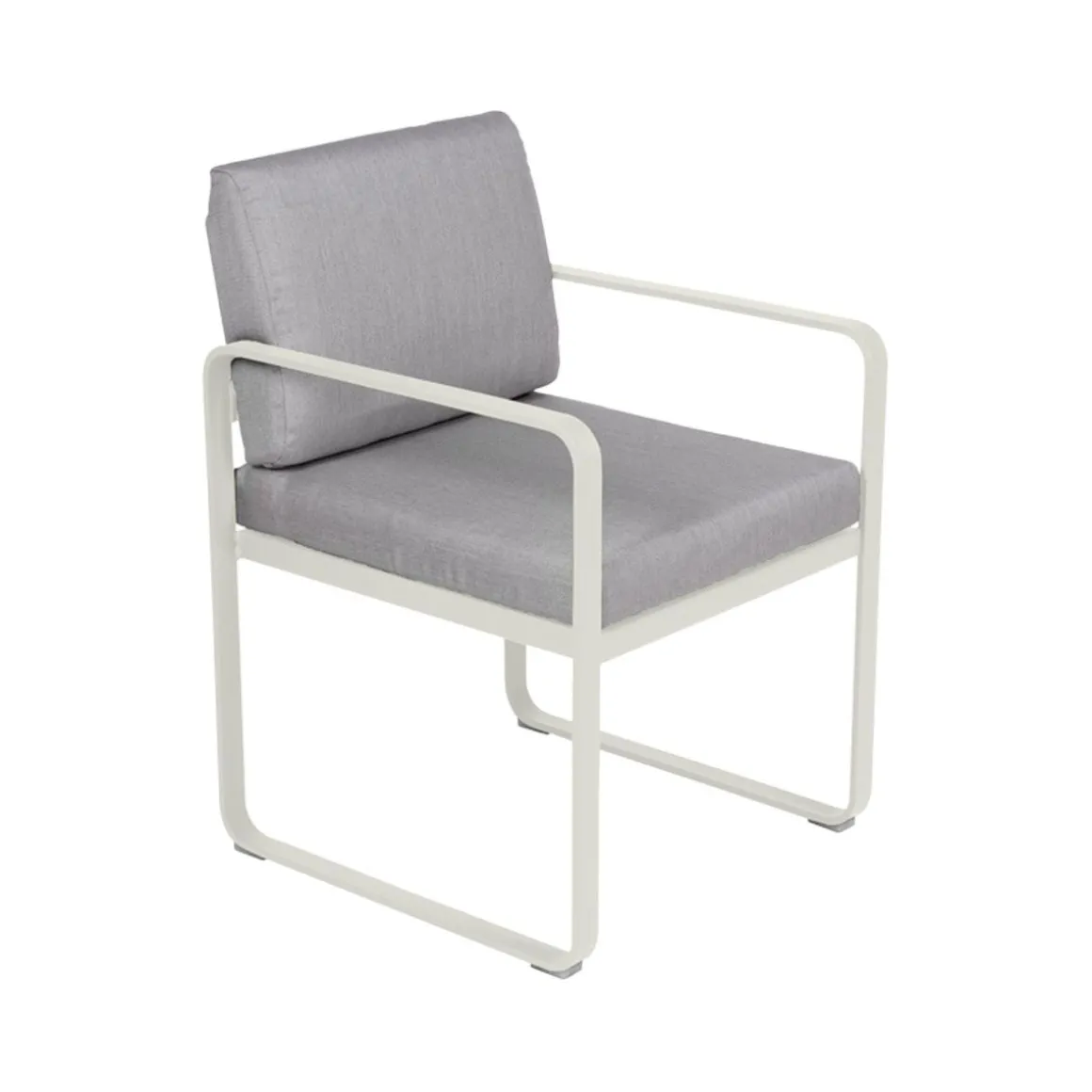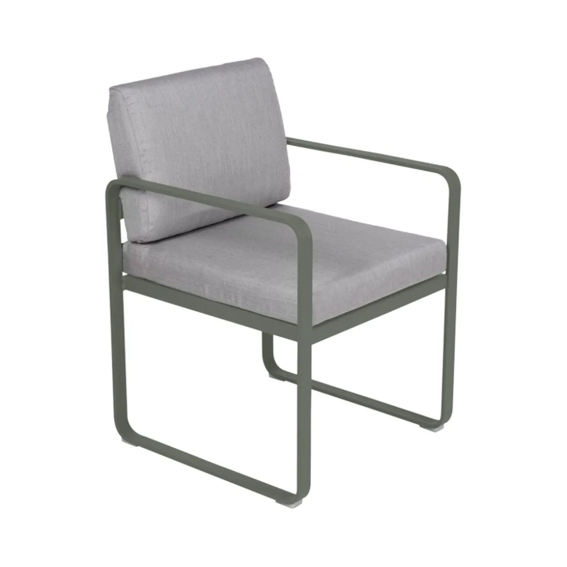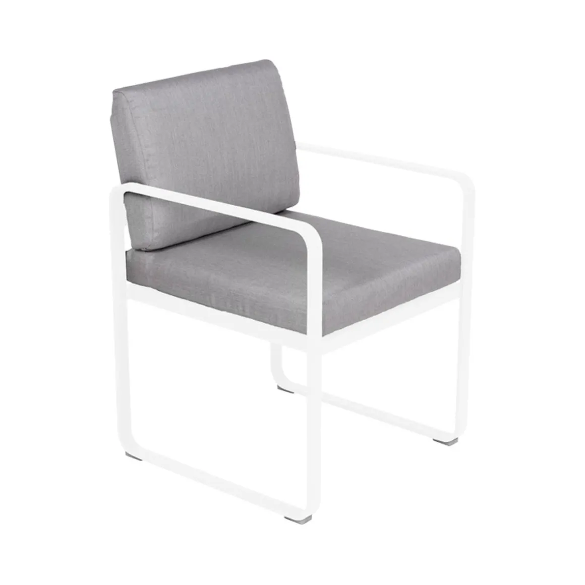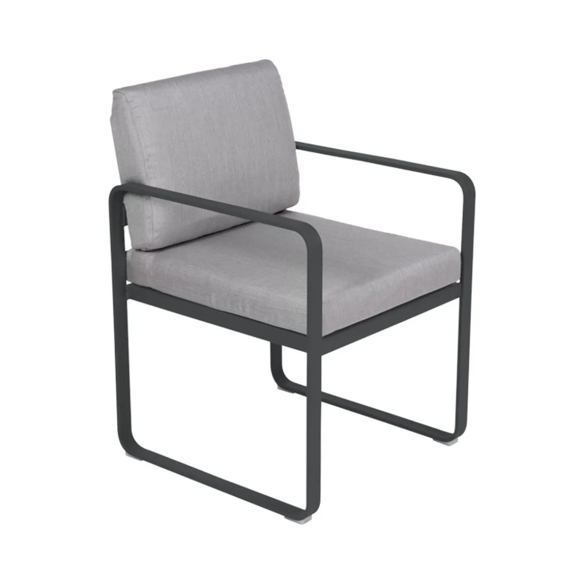 Fauteuil repas Bellevie – gris de Fermob. La famille Bellevie s’agrandit avec un fauteuil de table, parfait pour prendre votre repas, attablés à l’une des tables de la même collection. Confortablement installés prolongez le moment, faites durer déjeuners et dîners. Indéfiniment… Le fauteuil-repas Bellevie est là pour ça ! Il vous appelle à vous régaler de manière décontractée. Il est également parfait pour chiller après le repas, ce fauteuil-là ! Ultra-accueillant, avec ses coussins d’un confort absolu, garnis de mousse polyuréthane haute résilience et enveloppés de tissu Sunbrella® d’une étonnante douceur, le fauteuil de table Bellevie vous garantit des repas bien assis. Grâce à ce tissu outdoor 100% acrylique teint masse, résistant aux taches, à la moisissure, aux déchirures et à l’abrasion mais aussi grâce à sa structure 100% aluminium recouverte de peinture poudre polyester, votre fauteuil-repas Bellevie affronte les intempéries et les climats les plus rudes, en bord de mer notamment. Afin de les tenir toujours propres et pimpants, ses coussins sont déhoussables et leurs housses, lavables en machine. Le souci du détail est tel, chez Fermob, que le coussin du dossier est équipé d’une poche, à glisser par-dessus la structure afin de dissimuler habilement la partie métallique de l’arrière de votre fauteuil-repas, pour un fini très élégant. Enfin, la hauteur de ses accoudoirs est ajustée pour passer sous les plateaux de toutes les tables de la collection, ce qui ouvre large le champ des associations possibles ! N’hésitez pas à adopter un « total look » Bellevie sur votre terrasse avec votre fauteuil-repas ultra-douillet : alors, quelle table de la gamme pour l’accompagner ? Vous avez l’embarras du choix ! Laissez libre cours à votre imagination…