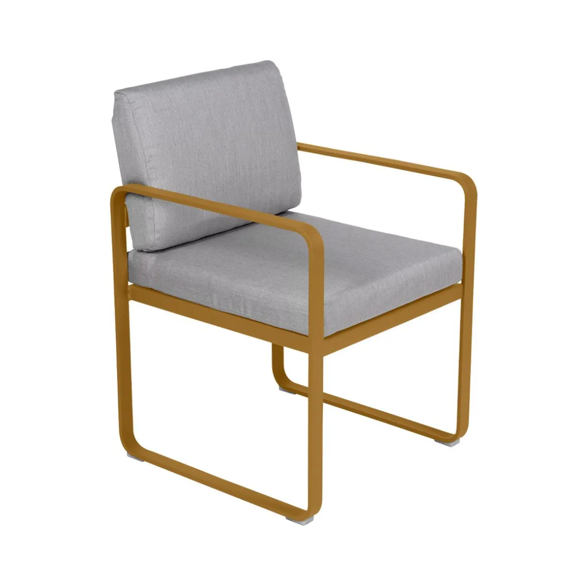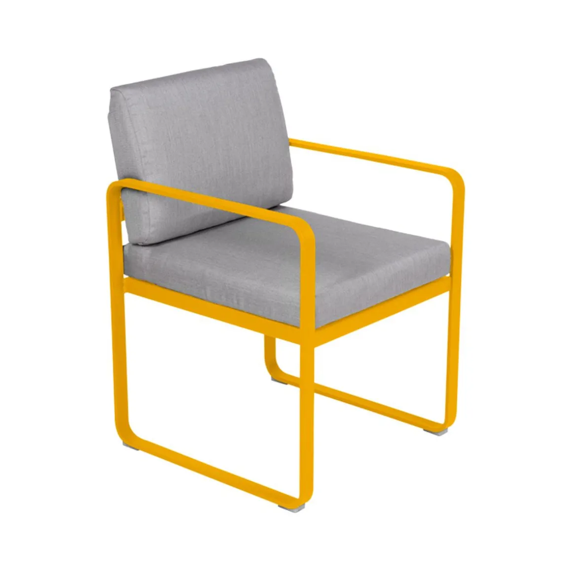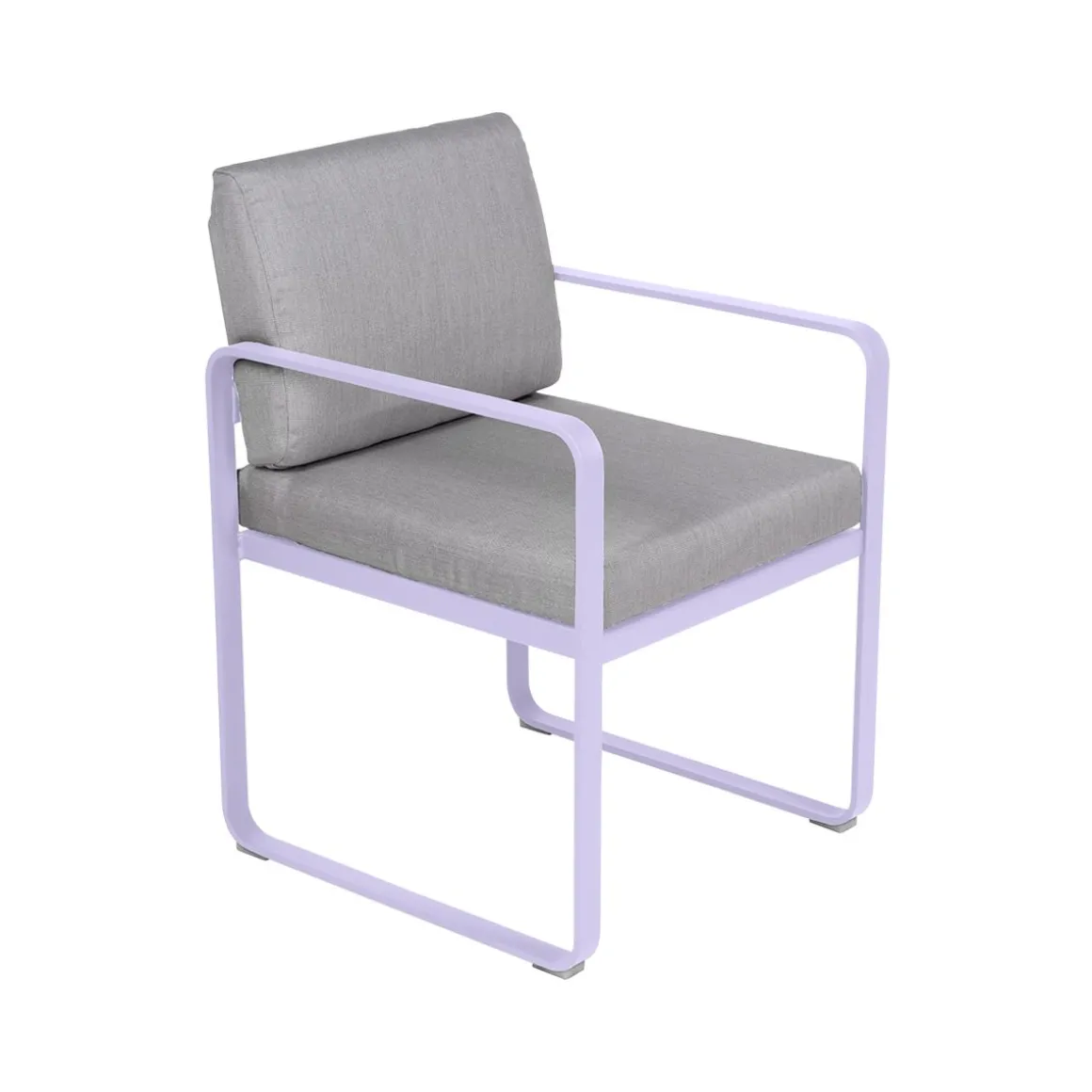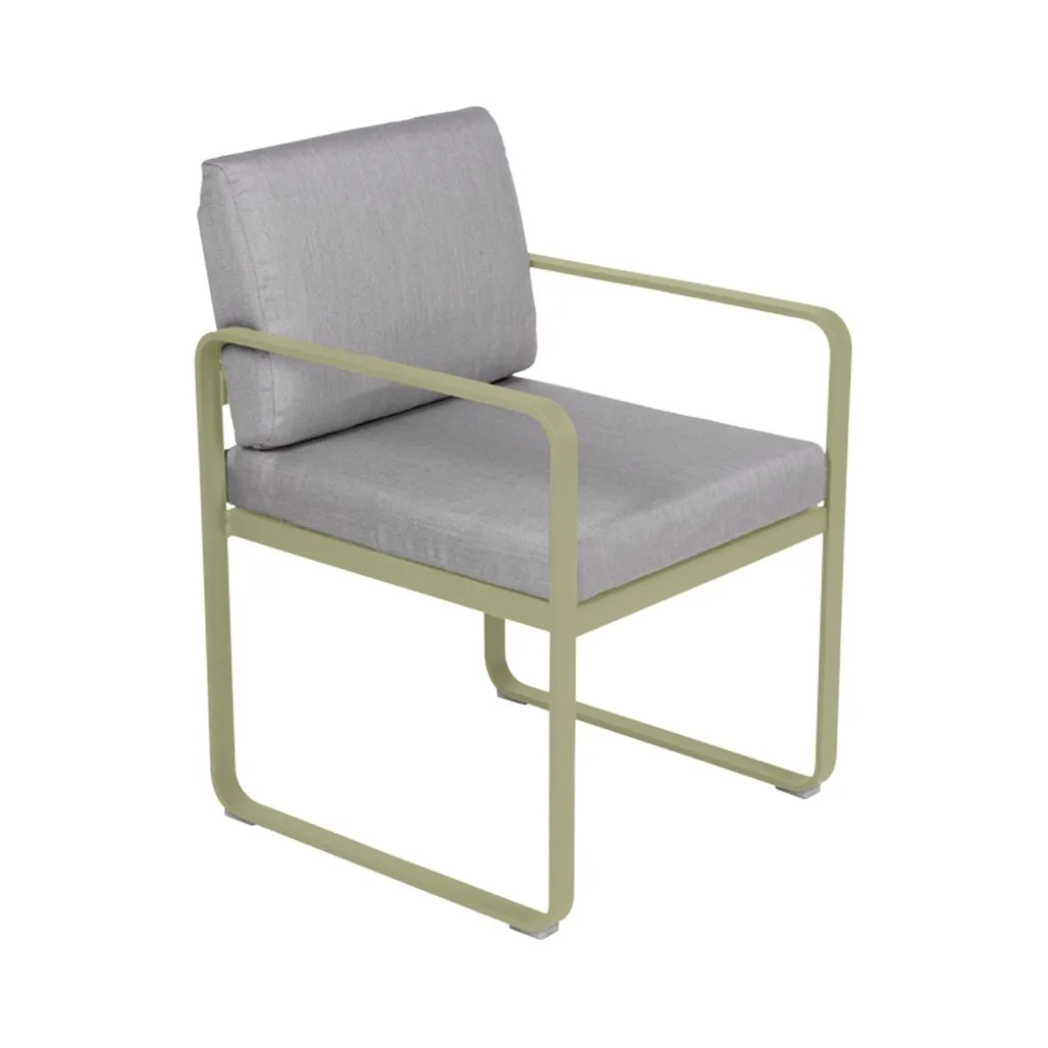 Fauteuil repas Bellevie – gris de Fermob. La famille Bellevie s’agrandit avec un fauteuil de table, parfait pour prendre votre repas, attablés à l’une des tables de la même collection. Confortablement installés prolongez le moment, faites durer déjeuners et dîners. Indéfiniment… Le fauteuil-repas Bellevie est là pour ça ! Il vous appelle à vous régaler de manière décontractée. Il est également parfait pour chiller après le repas, ce fauteuil-là ! Ultra-accueillant, avec ses coussins d’un confort absolu, garnis de mousse polyuréthane haute résilience et enveloppés de tissu Sunbrella® d’une étonnante douceur, le fauteuil de table Bellevie vous garantit des repas bien assis. Grâce à ce tissu outdoor 100% acrylique teint masse, résistant aux taches, à la moisissure, aux déchirures et à l’abrasion mais aussi grâce à sa structure 100% aluminium recouverte de peinture poudre polyester, votre fauteuil-repas Bellevie affronte les intempéries et les climats les plus rudes, en bord de mer notamment. Afin de les tenir toujours propres et pimpants, ses coussins sont déhoussables et leurs housses, lavables en machine. Le souci du détail est tel, chez Fermob, que le coussin du dossier est équipé d’une poche, à glisser par-dessus la structure afin de dissimuler habilement la partie métallique de l’arrière de votre fauteuil-repas, pour un fini très élégant. Enfin, la hauteur de ses accoudoirs est ajustée pour passer sous les plateaux de toutes les tables de la collection, ce qui ouvre large le champ des associations possibles ! N’hésitez pas à adopter un « total look » Bellevie sur votre terrasse avec votre fauteuil-repas ultra-douillet : alors, quelle table de la gamme pour l’accompagner ? Vous avez l’embarras du choix ! Laissez libre cours à votre imagination…