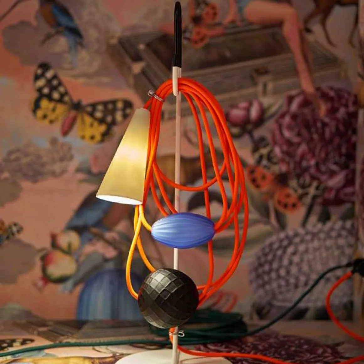Matériaux : pied en fer, cordon en tissu, perle en verre de murano et abat jour en porcelaine
