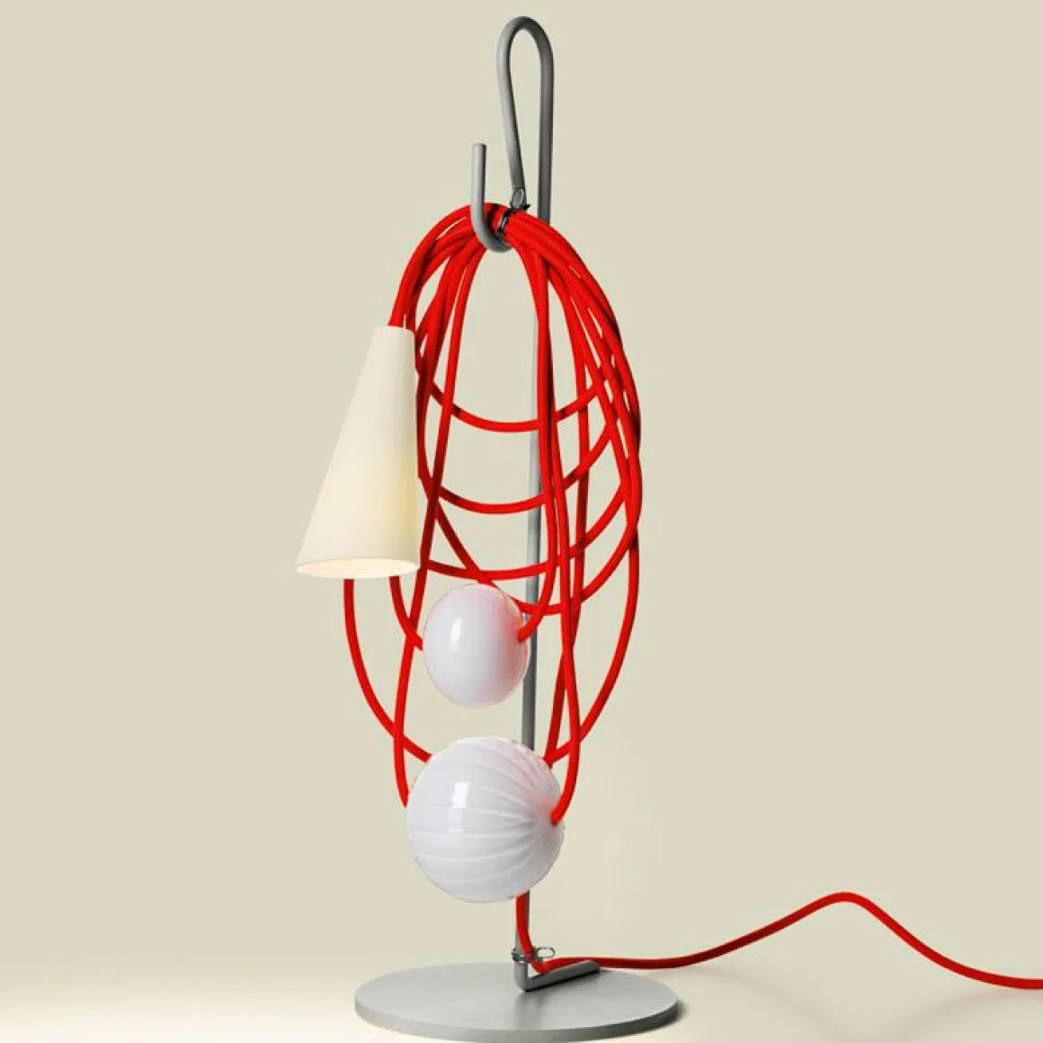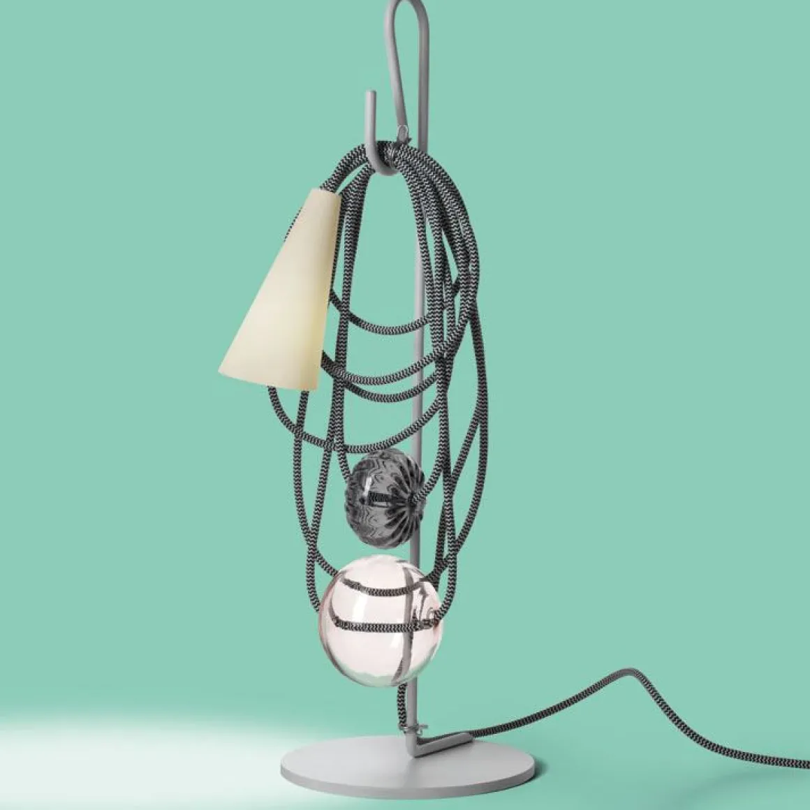 Filo est une collection de lampes de table conçues par Andrea Anastasio et produite par la marque Foscarini. Les lampes traditionnelles sont généralement conçues de manière à ce que le câble, la structure de base et l’ampoule soit cachées derrière un ornement. Ici la créatrice Andrea Anastasio a décidé de créer Filo dans une approche déstructuré, elle a choisi de mettre en avant ces pièces qui sont généralement cachés et d’en faire des éléments décoratifs. Ainsi le fil électrique est enroulé et accroché sur un crochet au sommet de la base de la lampe, les différentes perles de verre et l’abat-jour en forme de cônes sont suspendues au cordon, ce qui lui donne l’apparence d’un collier. Celle-ci est disponible dans de nombreuse combinaisons de teintes. Au salon du mobilier 2017, la lampe de table Filo a été nommée « best of euroluce »
