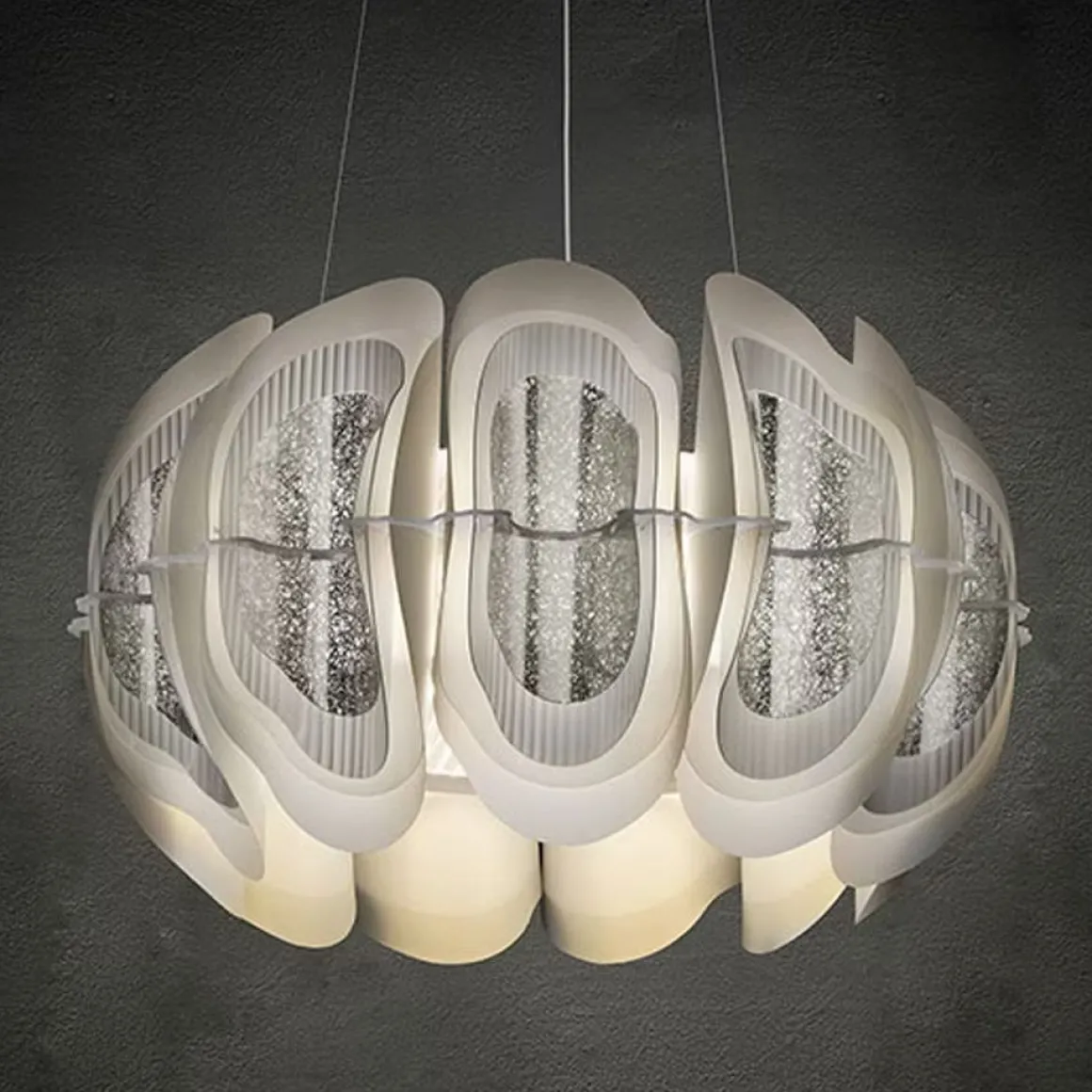 Fiordlys s’inspire des vagues sinueuses des aurores boréales et des mouvements des falaises nordiques. Dans un contexte métropolitain où la vitesse et le chaos perturbent l’équilibre humain, Fiordlys apporte la brise fraîche et calme de la nature au centre de la maison. Fiordlys est hautement personnalisable dans ses finitions. En effet, conçue en deux versions de suspension – ronde et linéaire – et en une version d’applique murale, elle est disponible en trois finitions différentes : White, Gold et Silver.