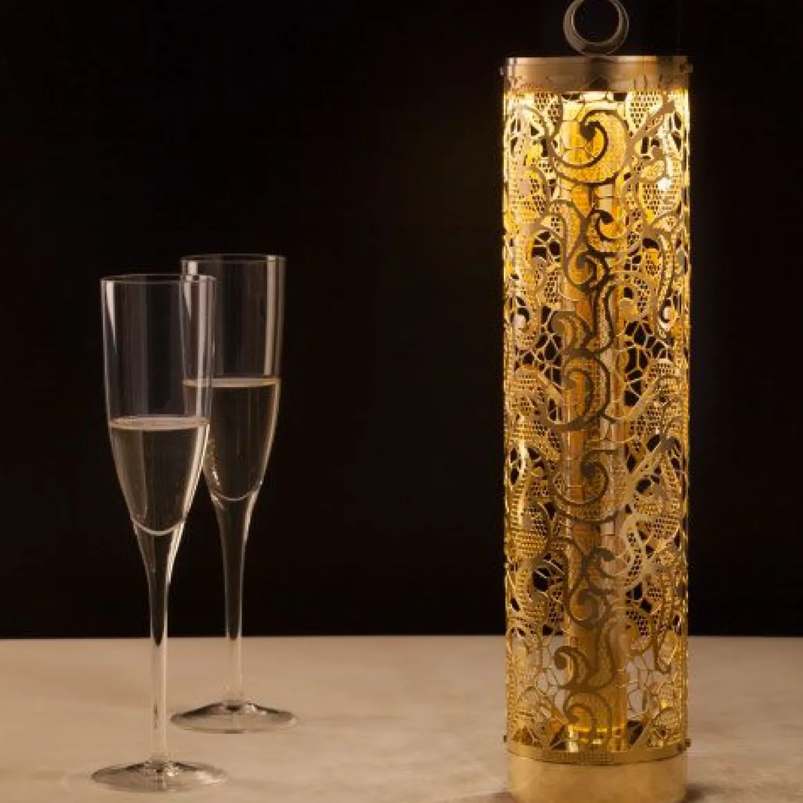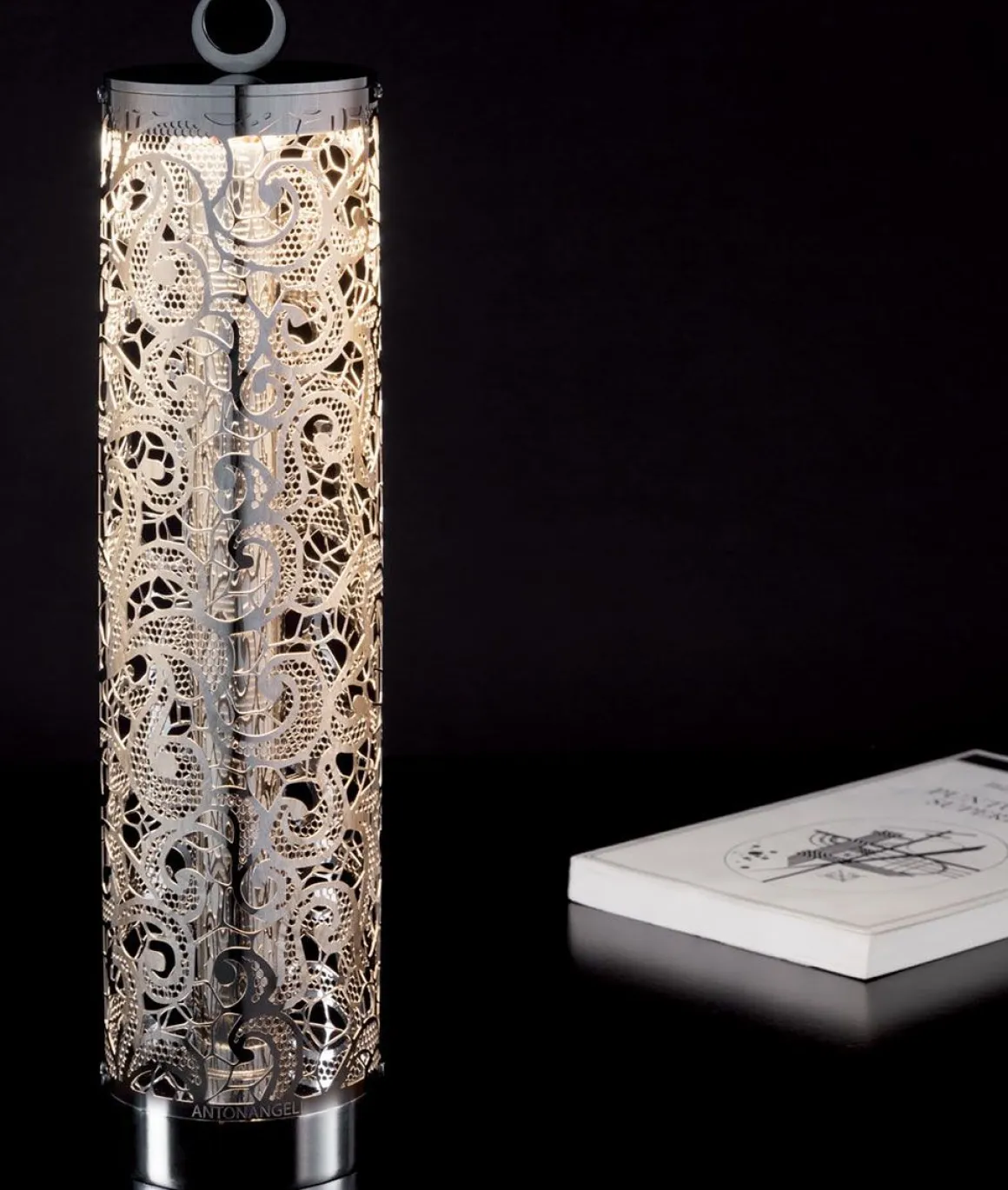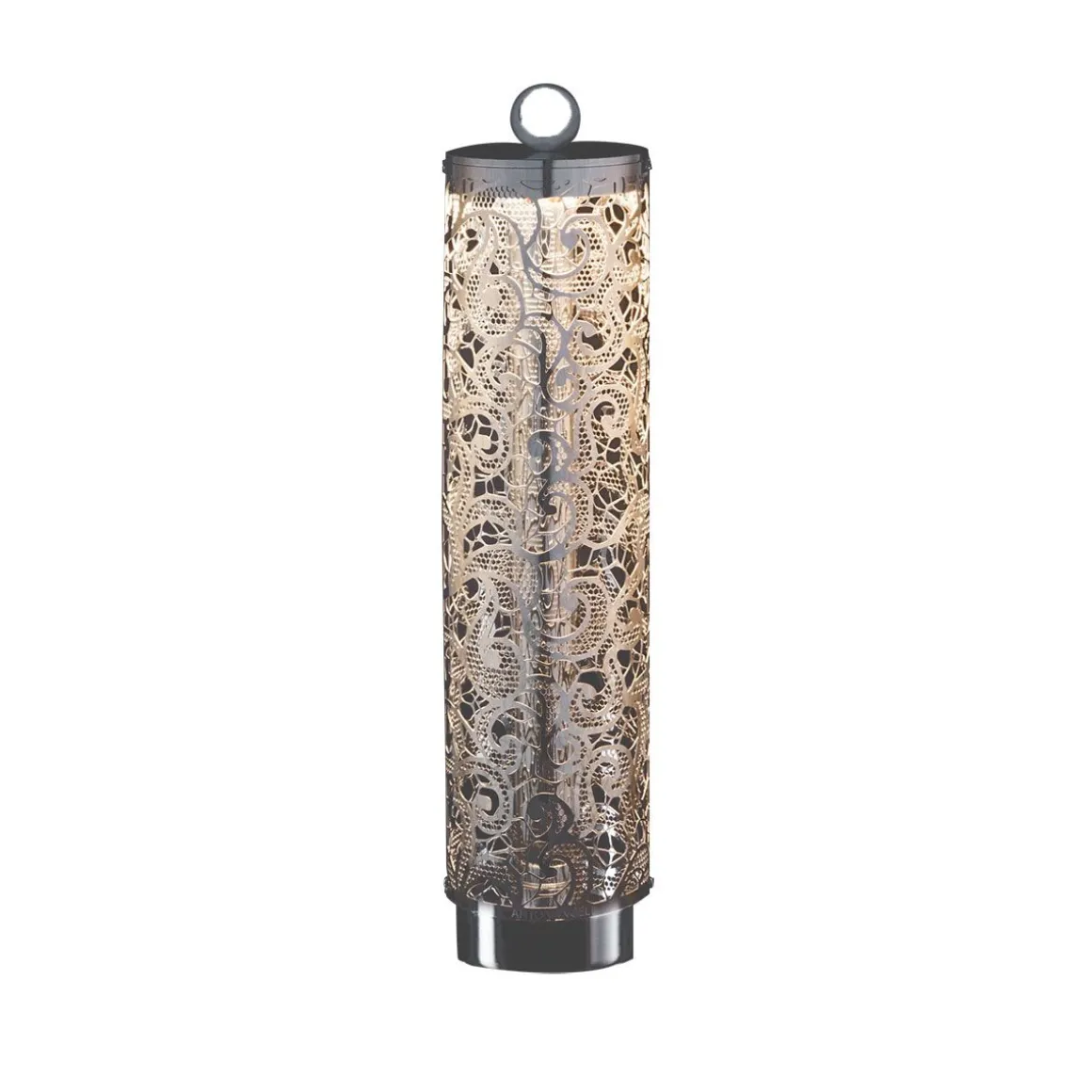Lampe flambeau avec structure travaillée en dentelle à poser ou à suspendre, pour une opération autonome rechargeable, sans fil.