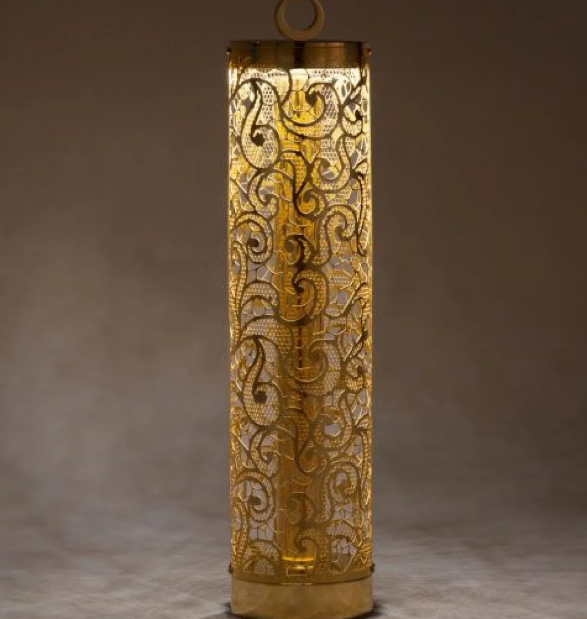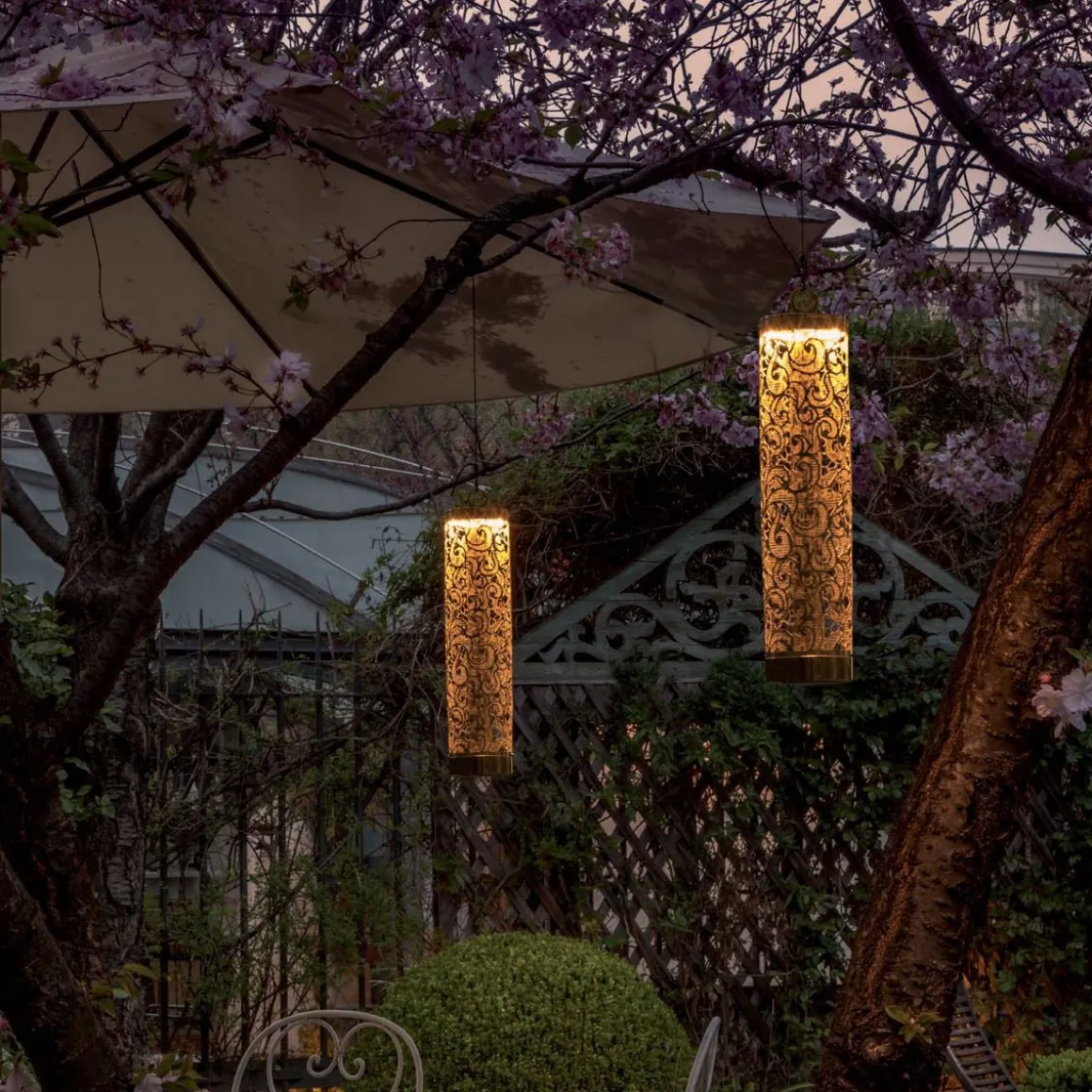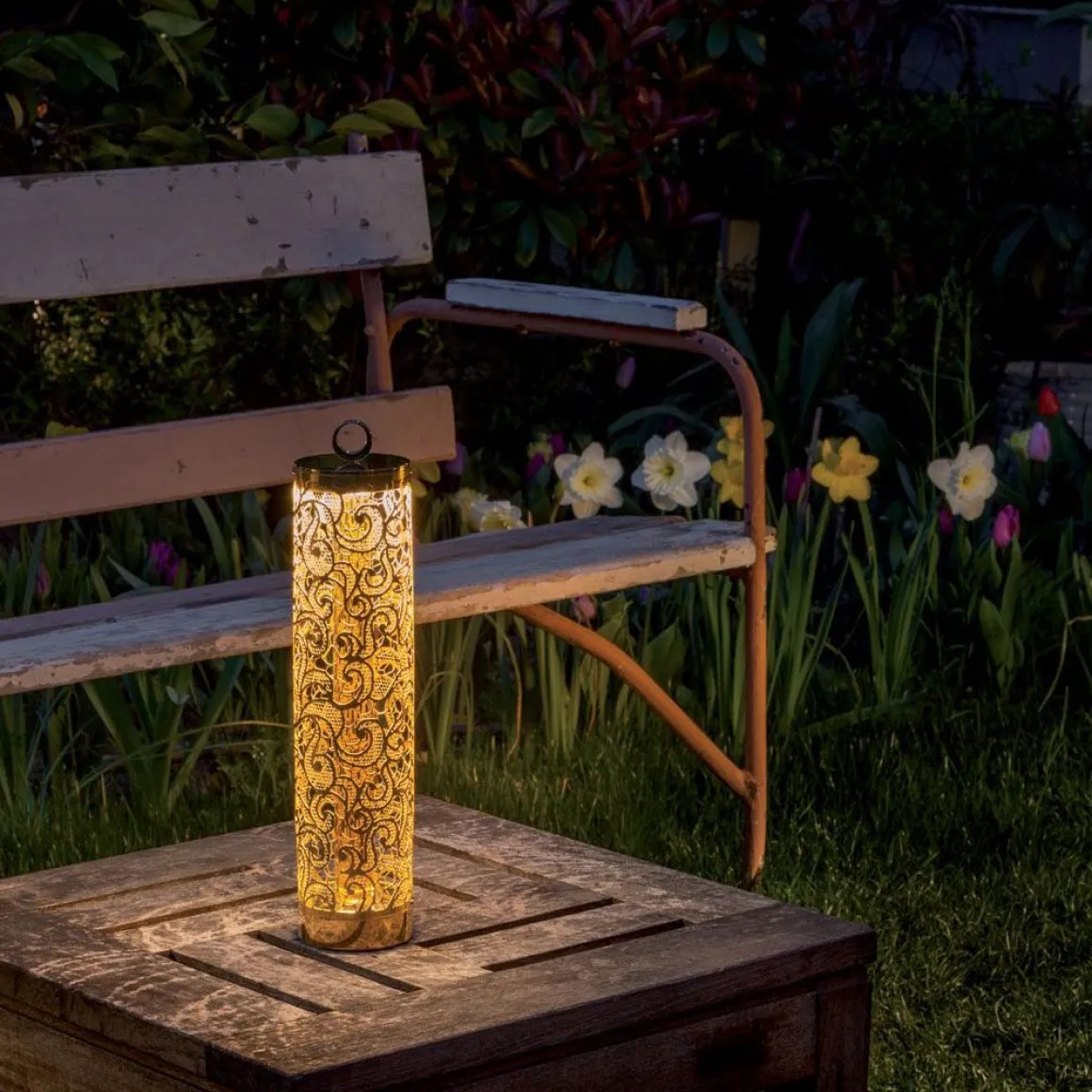 Lampe flambeau avec structure travaillée en dentelle à poser ou à suspendre, pour une opération autonome rechargeable, sans fil.