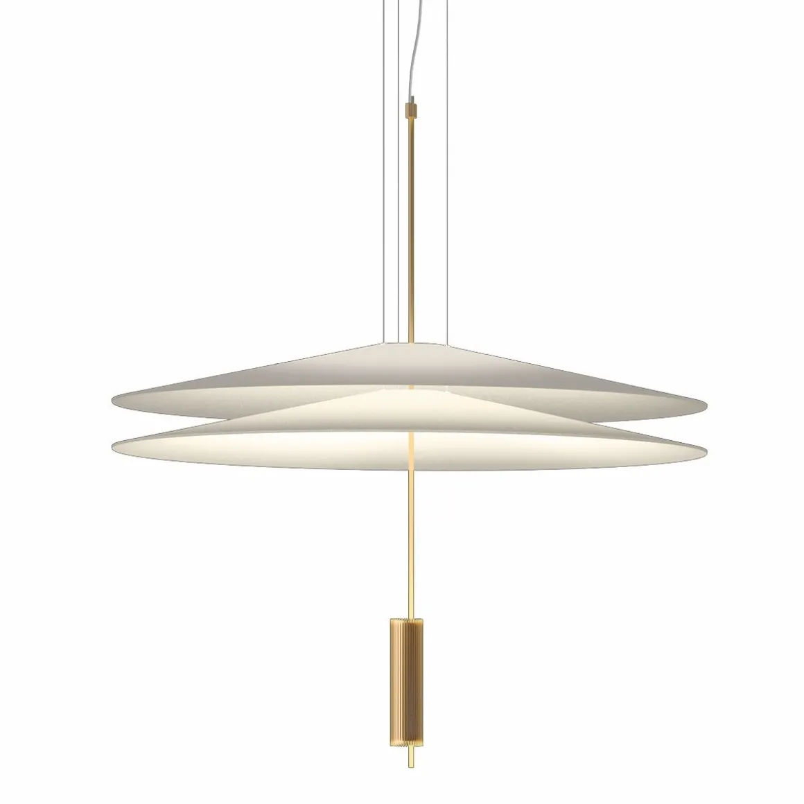 Suspension Flamingo de Vibia, par le designer Antoni Arola. Le défi était de projeter la lumière sur le diffuseur de la lampe plutôt que d’entourer la source de lumière. Le résultat, un effet éthéré, où la lampe et sa luminance sont déconstruits.