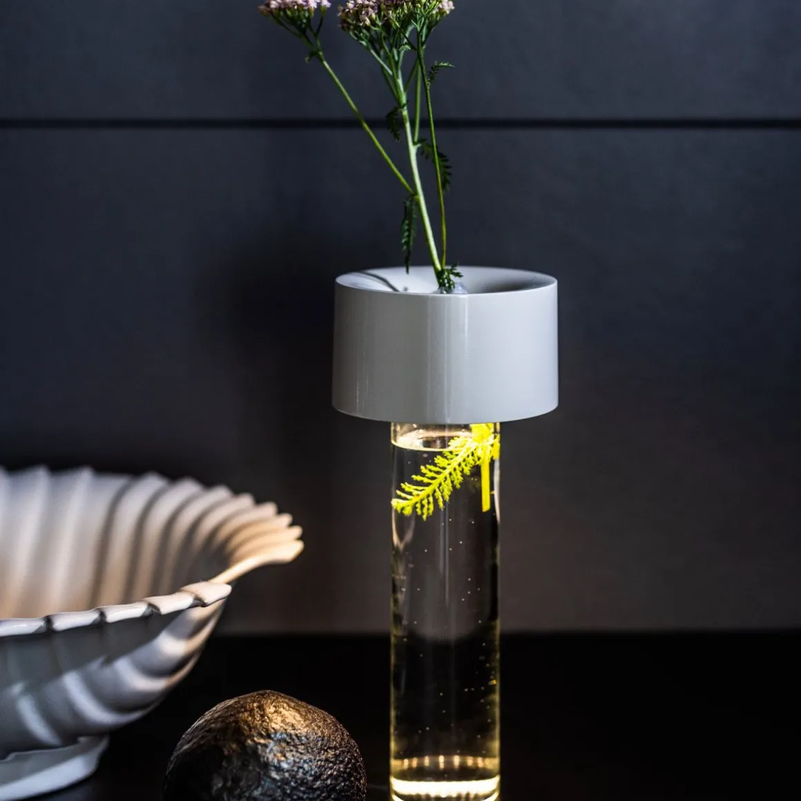 Fleur de Foscarini par Rodolfo Dordoni. Transparence, légèreté et une lumière poétique qui crée l’atmosphère. Fleur est une lampe de table rechargeable à double fonction : celle, plus naturelle, d’éclairer et celle, inattendue, de contenir de l’eau et une fleur fraîche. Fleur se caractérise par une proportion élégante et soignée entre les deux volumes qui la composent : à la légèreté de la base en verre transparent, qui rend à disparaître de la vue, répond un corps léger à forte présence en ABS poli coloré. Lorsque Fleur est allumée, la lumière souligne le profil de la tige en verre et se diffuse sur le dessus, éclairant la surface autour de se base tout en créant un faisceau lumineux plus large que celui des lampes à piles conventionnelles, grâce à la carte LED spécialement conçue à cet effet. Fleur est également très efficace : elle ne consomme qu’un watt, mais ses LED – à charge rapide via la prise USB-C – sont capable d’émettre une lumière vive et variable grâce à un variateur tactile.