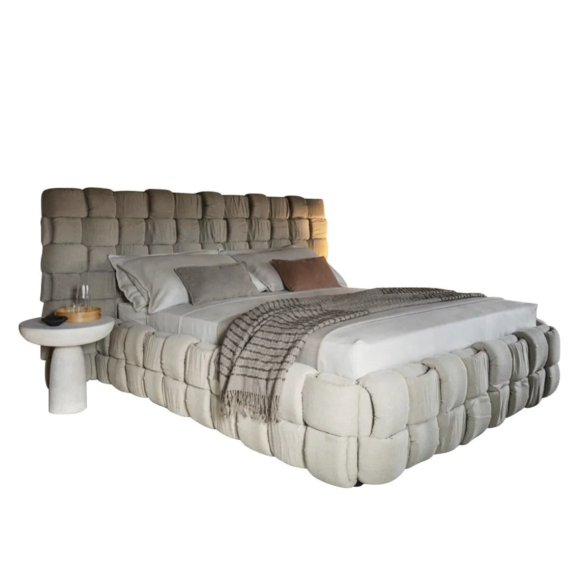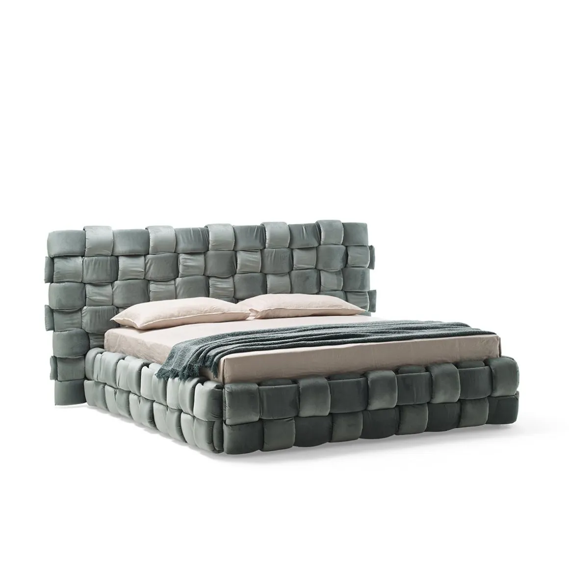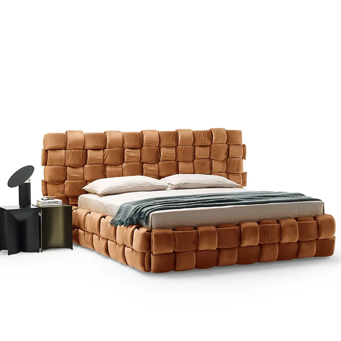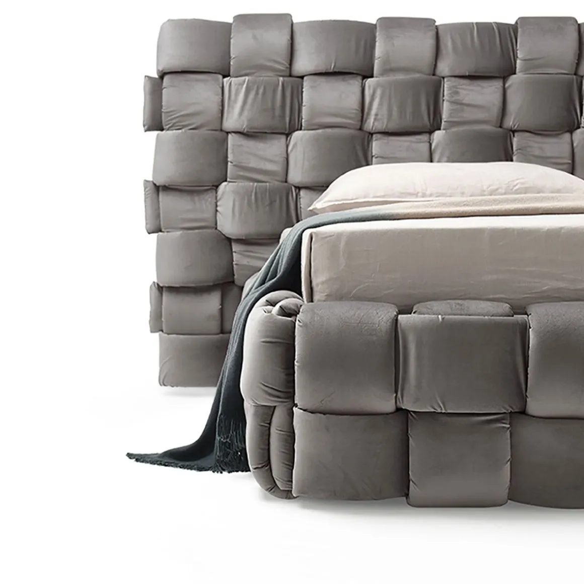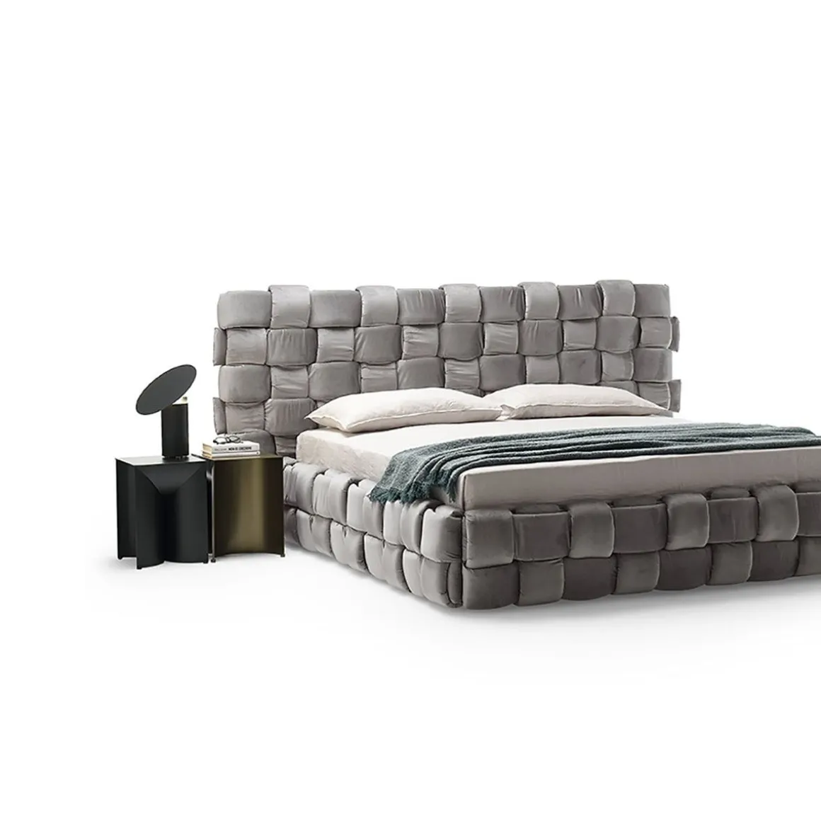 Lit double qui transmet une agréable sensation de confort grâce à l’élégant tissage macro rembourré de la grand tête de lit et du cadre de lit.