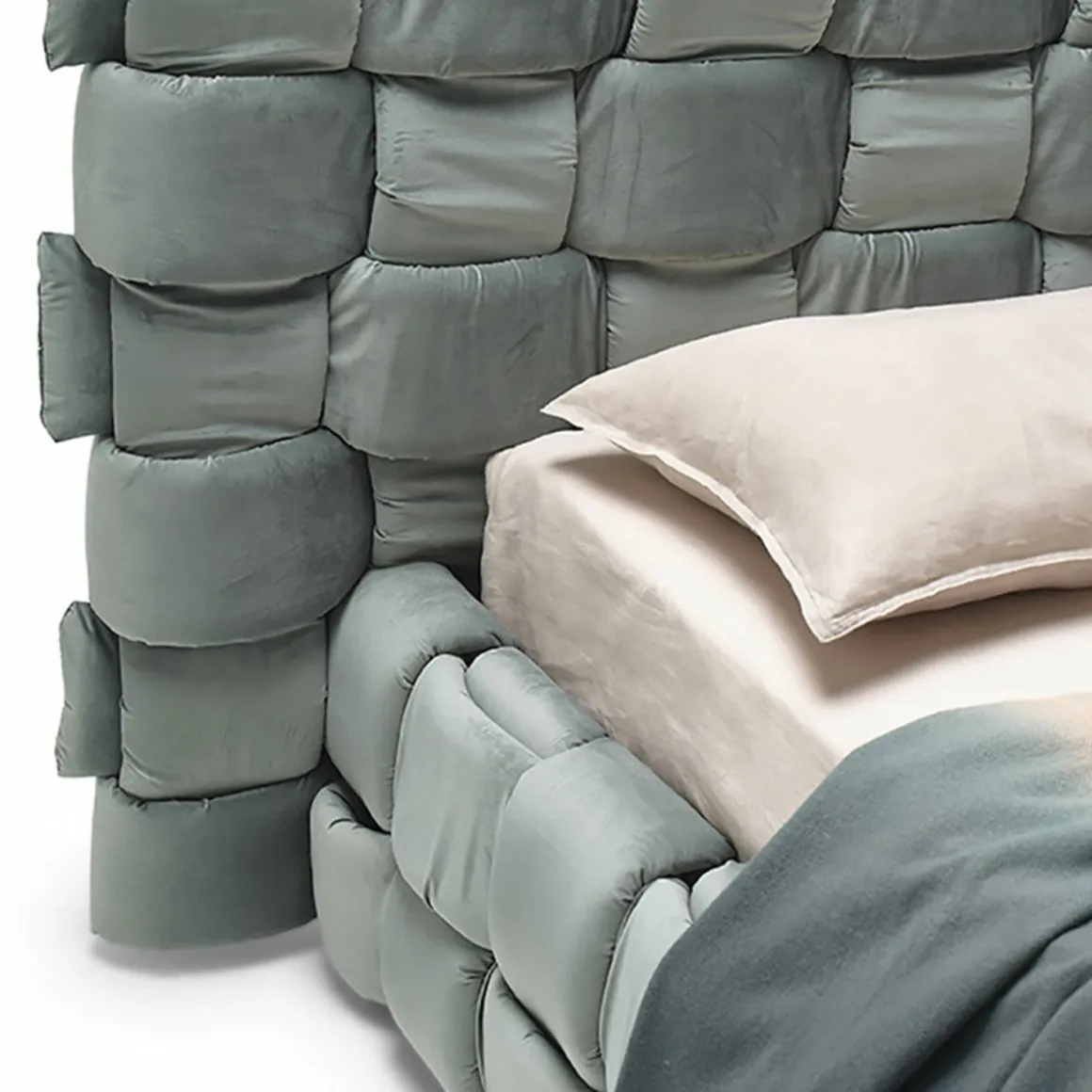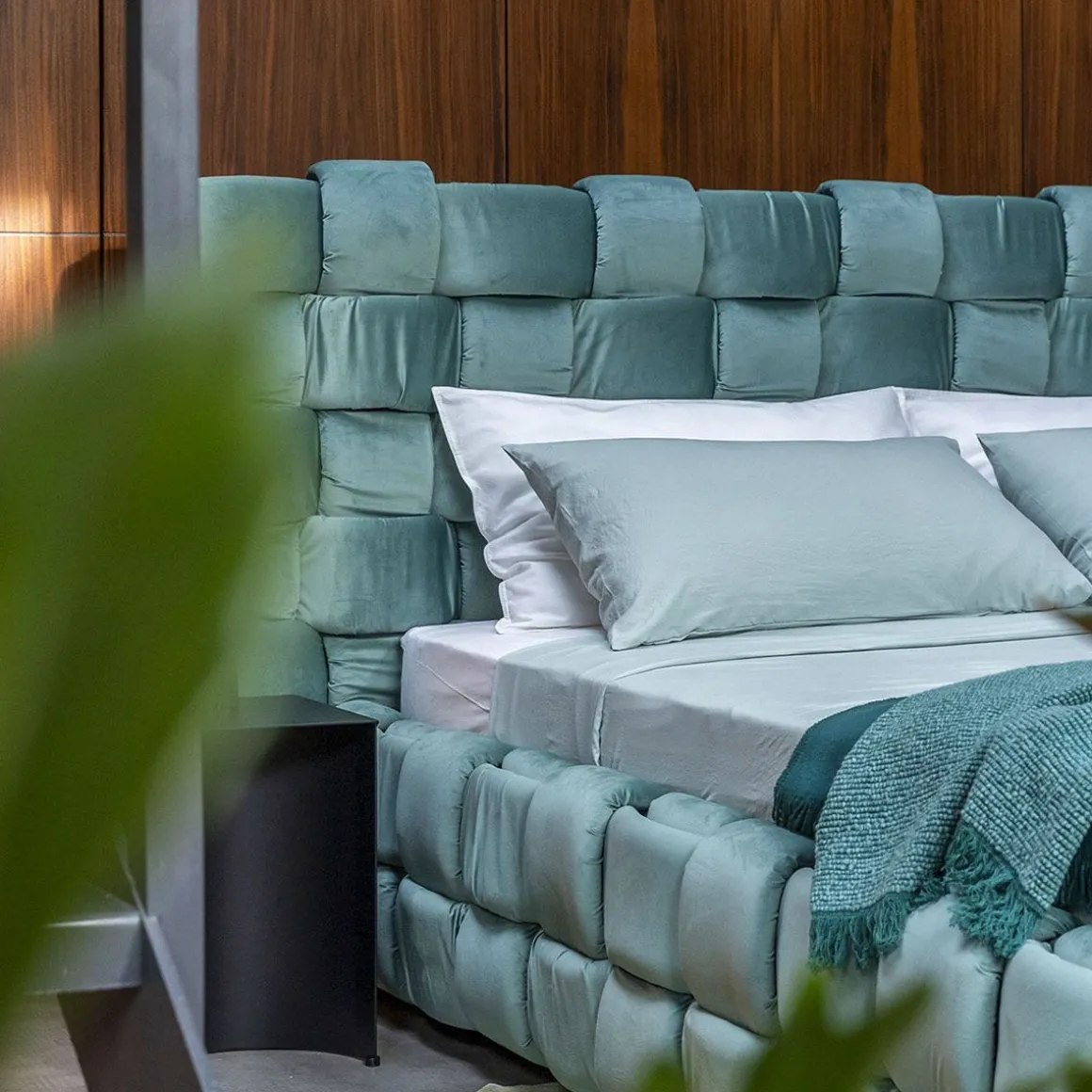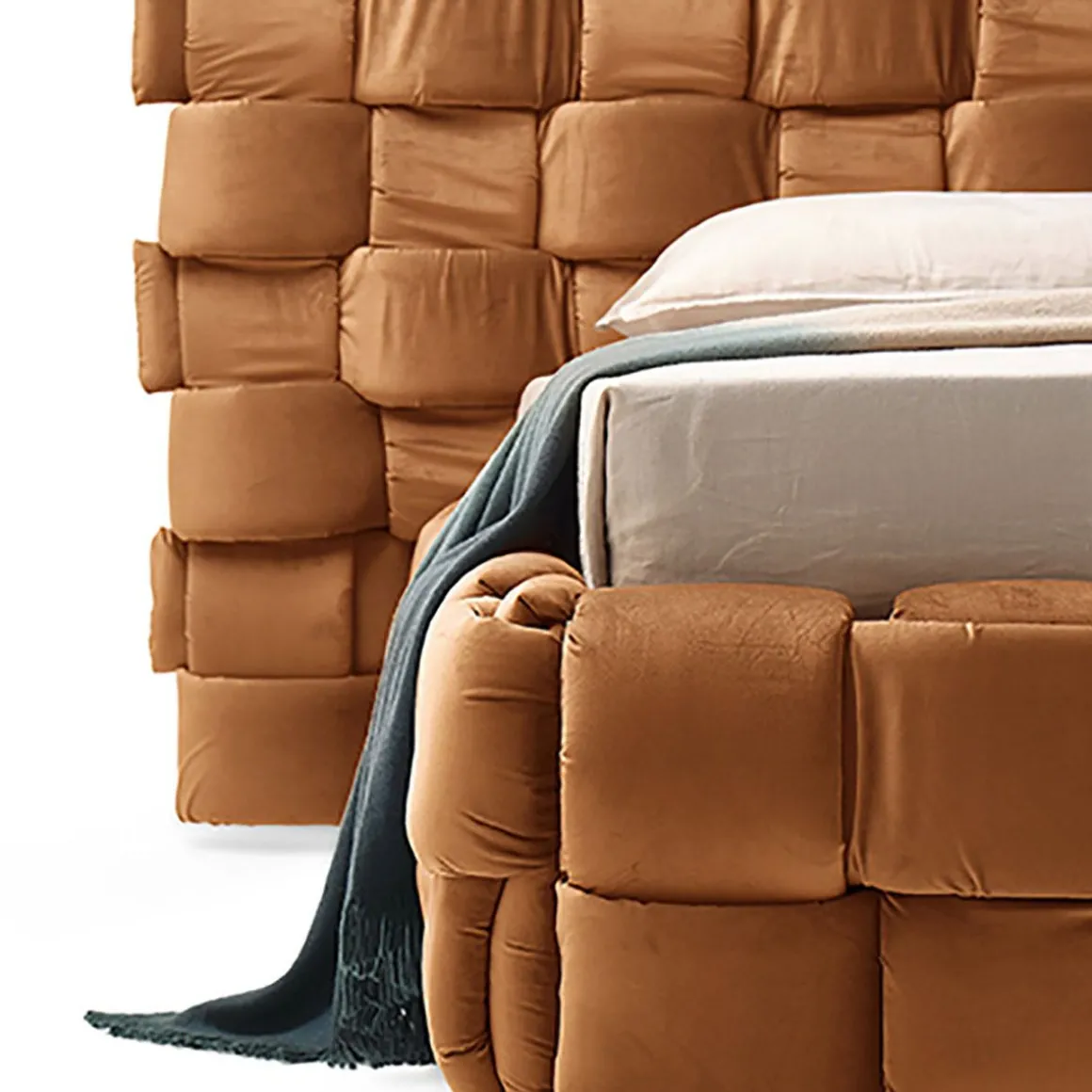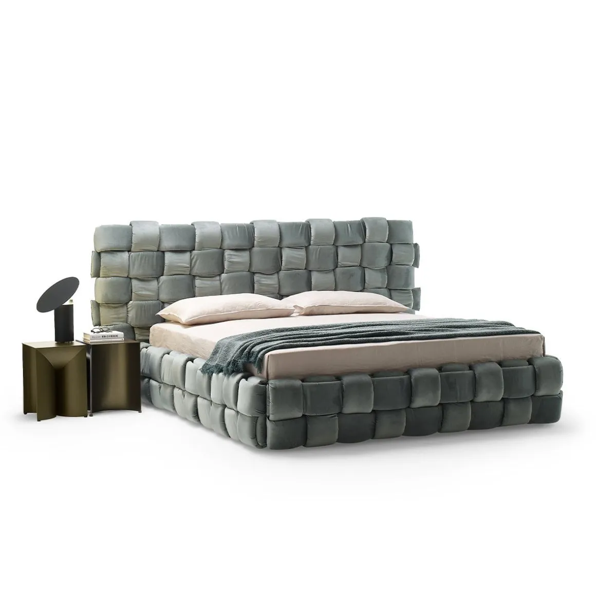 Lit double qui transmet une agréable sensation de confort grâce à l’élégant tissage macro rembourré de la grand tête de lit et du cadre de lit.