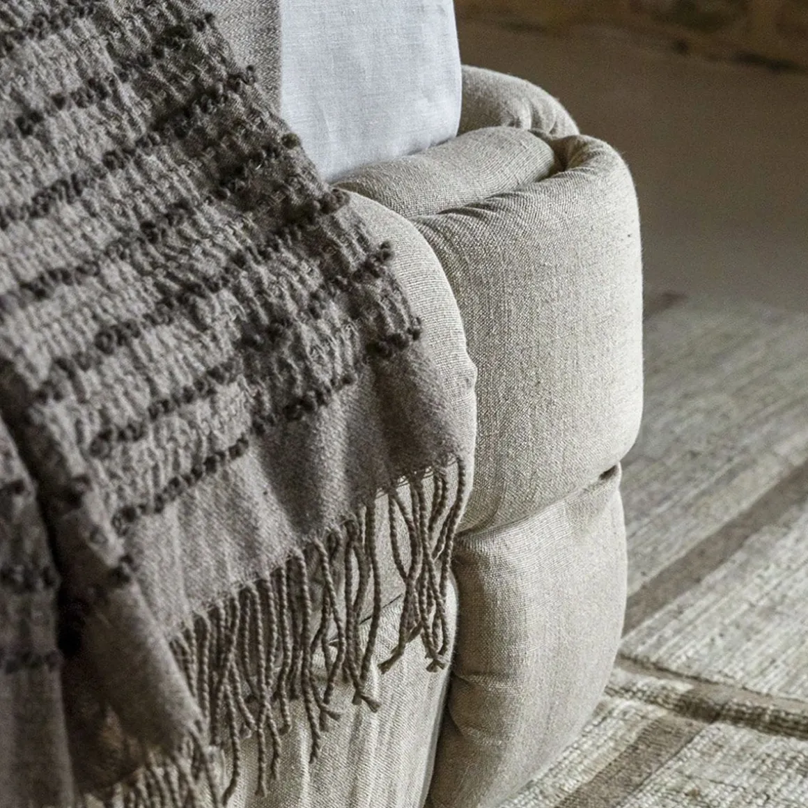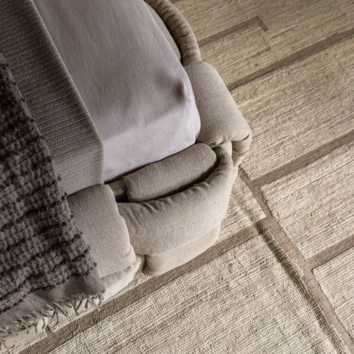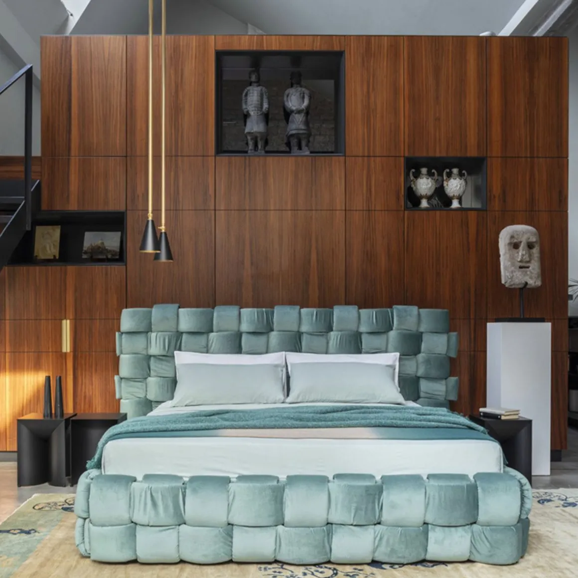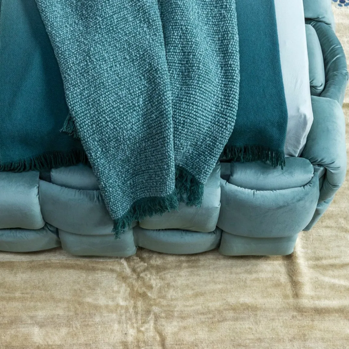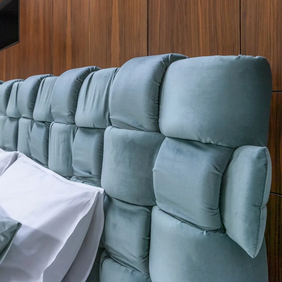 Lit double qui transmet une agréable sensation de confort grâce à l’élégant tissage macro rembourré de la grand tête de lit et du cadre de lit.