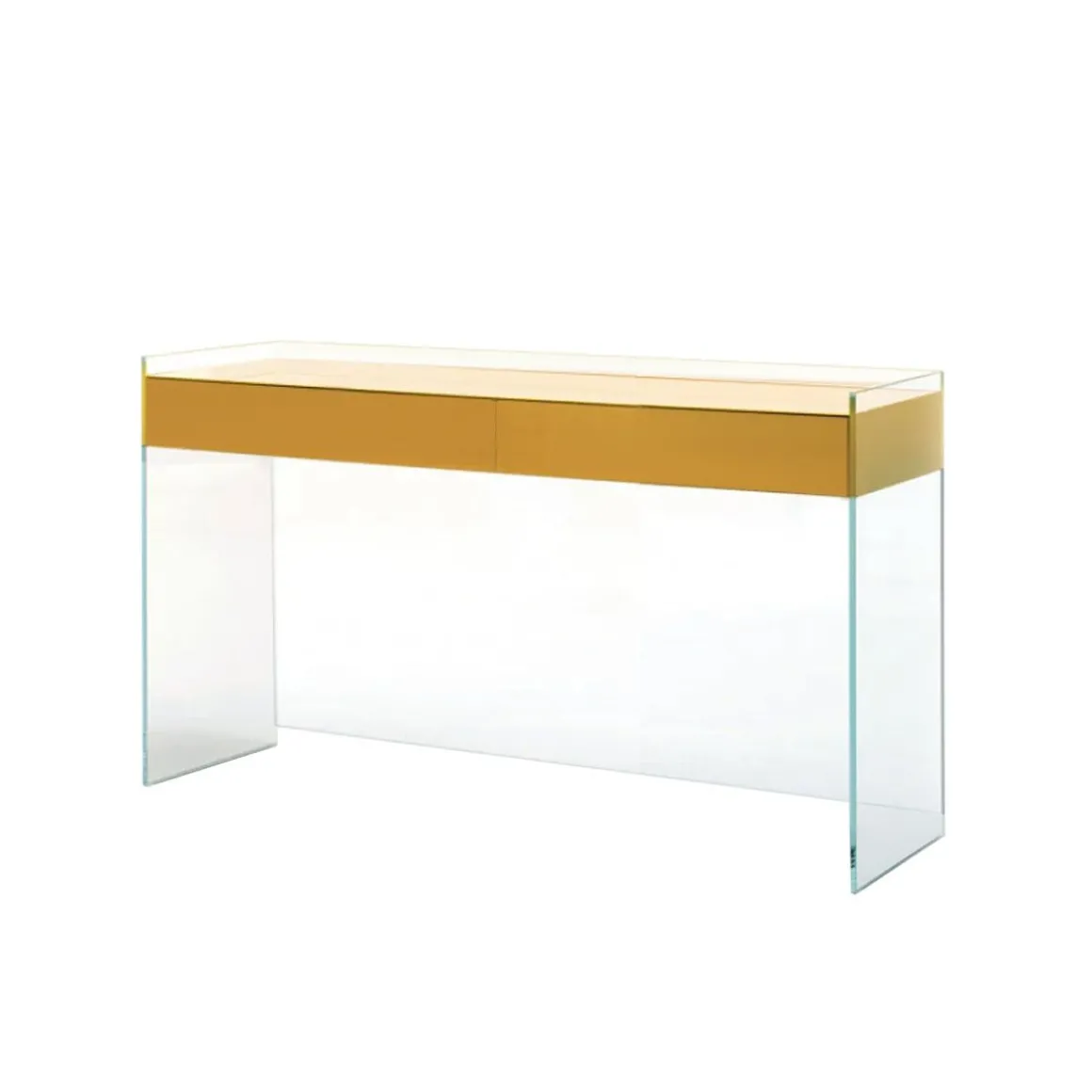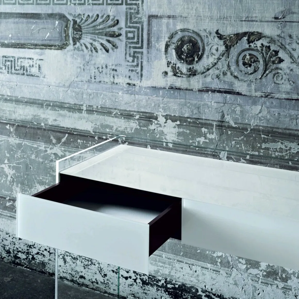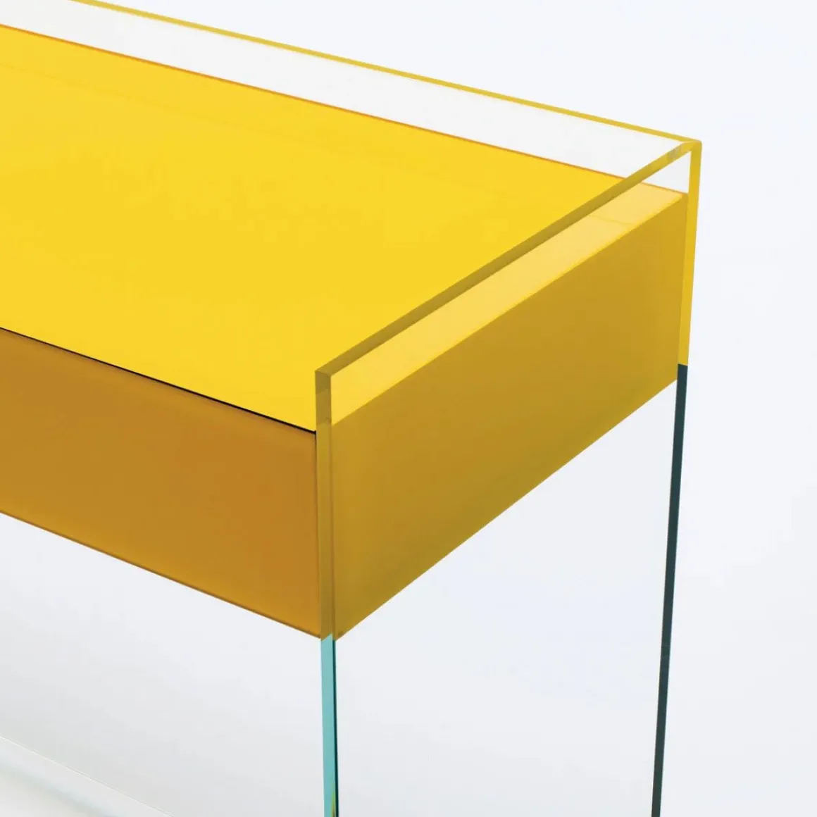 Les côtés et le dos, réalisés en verre extralight transparent, tiroirs de soutien en wengé recouvert à l’extérieur de verre trempé, laqué brillant de différentes couleurs.