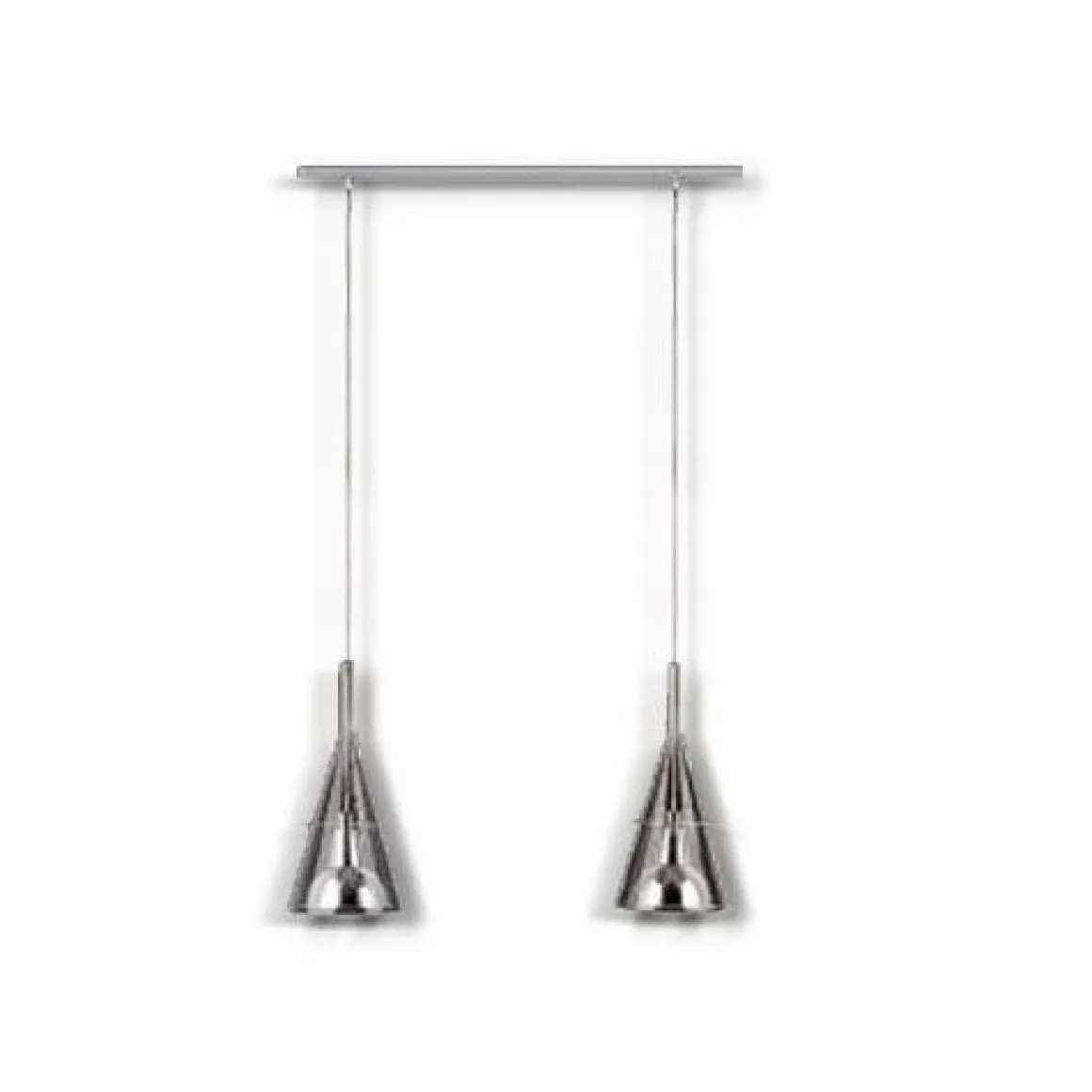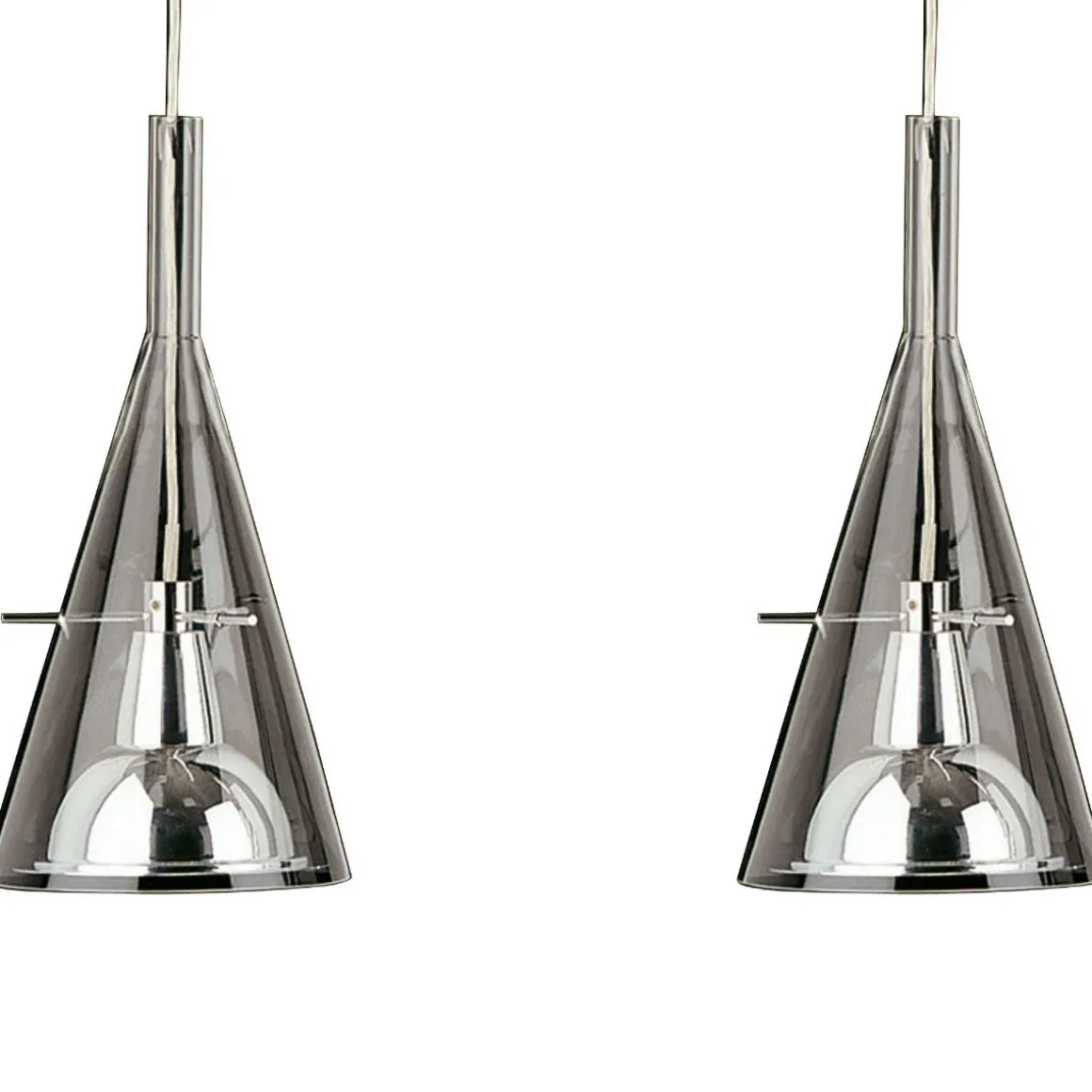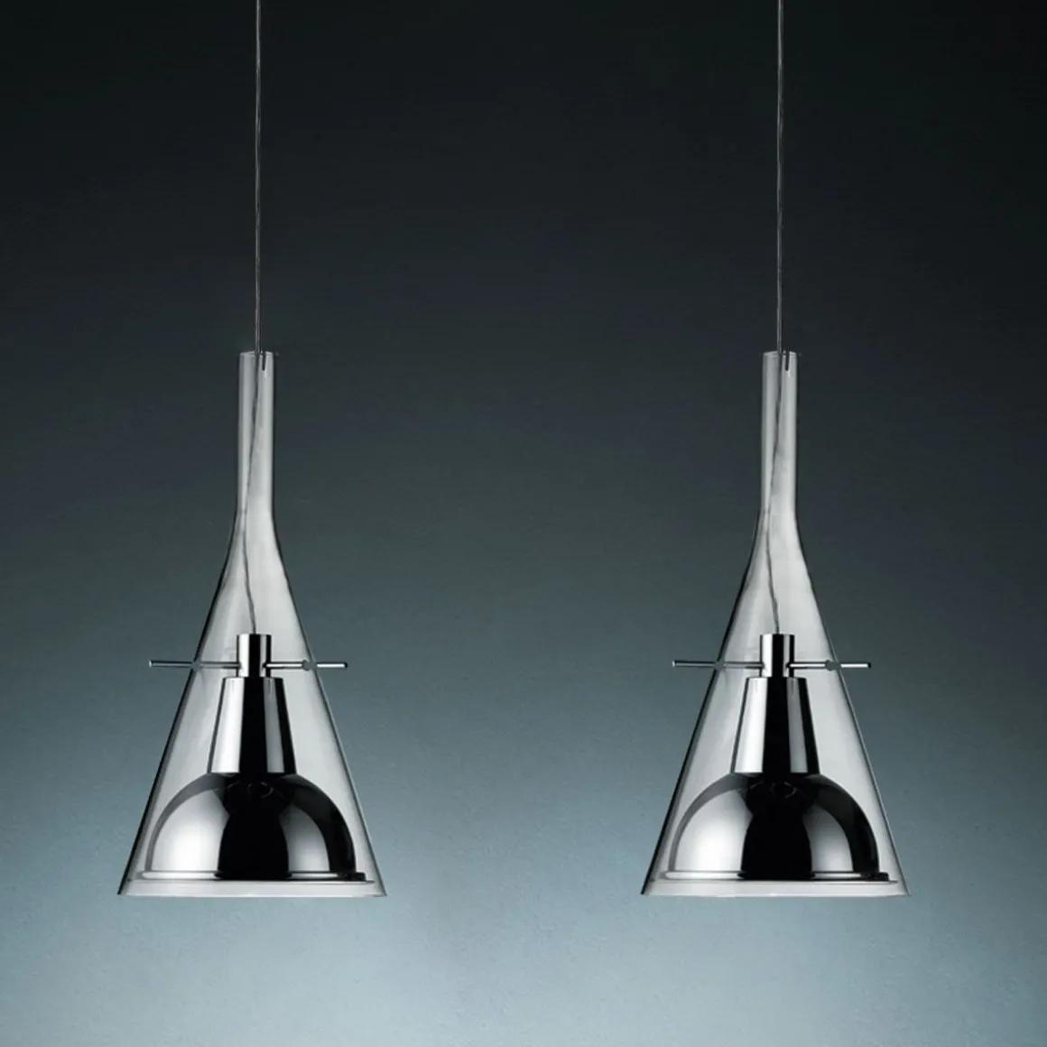 Le cône de verre accueille en son interne le réflecteur, soutenu par trois bras chromés. La lumière se reflète à l’intérieur du cône et se diffuse de manière uniforme vers le haut.