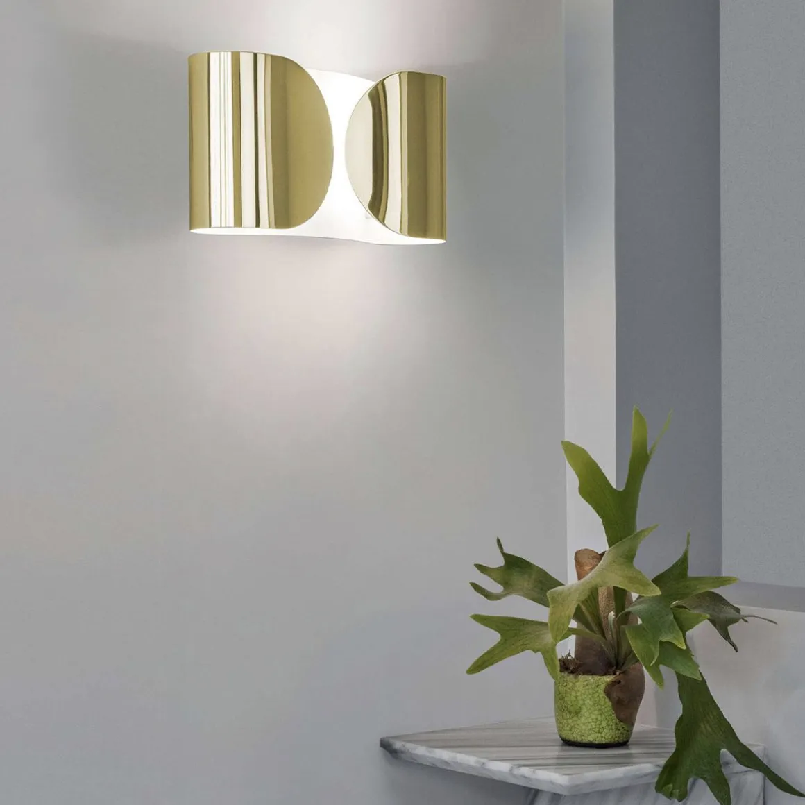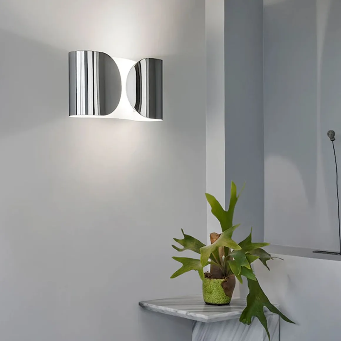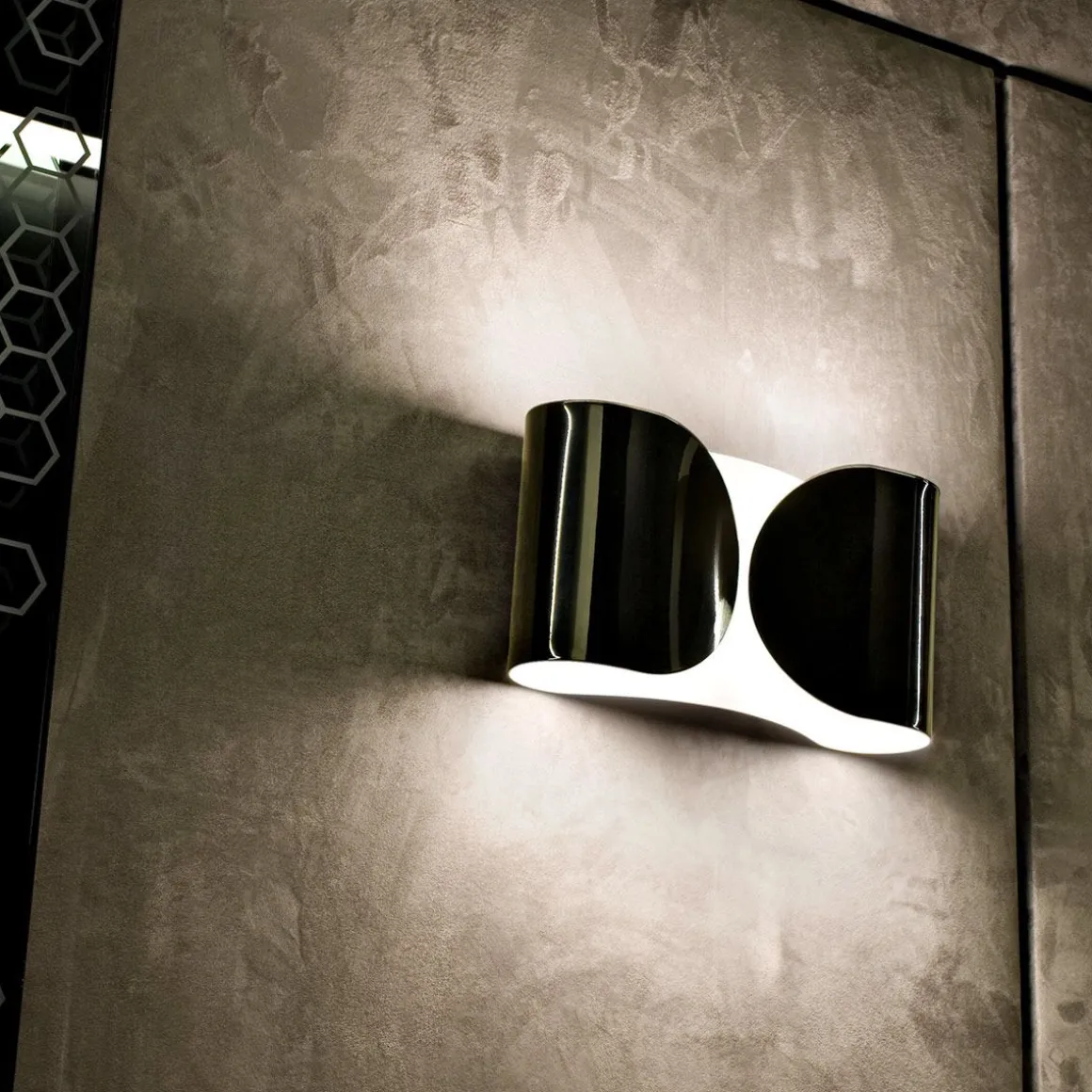 Dessinée par Tobia Scarpa en 1966, l’applique Foglio est une véritable icône du design. Son style est simple et très sophistiqué. La fine feuille d’acier incurvée enveloppe délicatement la lumière. L’applique Foglio possède deux sources lumineuses qui diffusent une lumière à la fois directe et indirecte.
