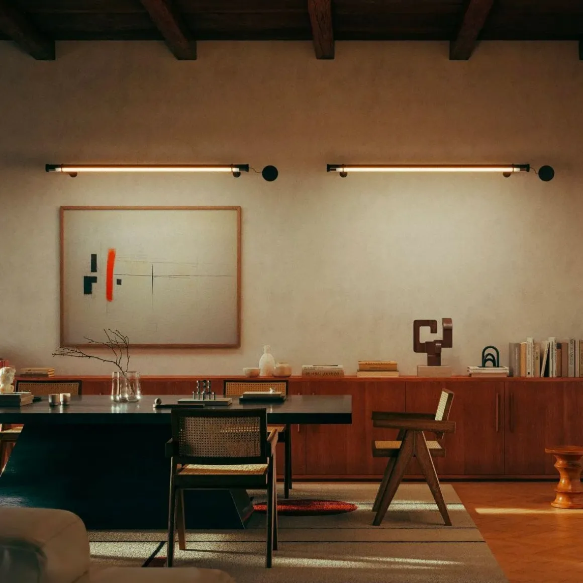 Fris de la marque Marset par Joan Gaspar. Dessiner de fins faisceaux de lumière dans un espace, chacun d’eux pointant dans n’importe quelle direction. C’est pourquoi nous avons créé Fris, un système d’éclairage polyvalent, disponible en version mur/plafond ou suspension, qui permet de combiner plusieurs unités de différentes tailles et positions, chacune dirigeant son propre faisceau lumineux. Sa conception consiste en un tube de verre qui enveloppe la lumière. Ce qui le rend unique est que le verre protège non seulement la lumière, mais assure également une fonction mécanique, suspendant l’ensemble du système et permettant à la lampe de tourner et d’orienter la lumière dans une certaine direction. Le verre est ainsi à la fois matériau et fonction. À travers le verre transparent, nous voyons l’intérieur de la lampe, composé de deux profils : l’un comprend la source lumineuse et l’autre agit comme une parabole, projetant une lumière vive et intense. Ce système permet de composer des structures lumineuses et d’assembler un ensemble de lampes au moyen de différents accessoires de montage et d’accrochage. Ils peuvent également fonctionner séparément comme une lampe individuelle. Fris propose un design très polyvalent et fonctionnel pour un éclairage précis de tout type de projet. Un système ingénieux qui s’attaque avec audace à un problème jusqu’alors non résolu : disposer d’un ensemble de lampes où chacune dirige la lumière individuellement.