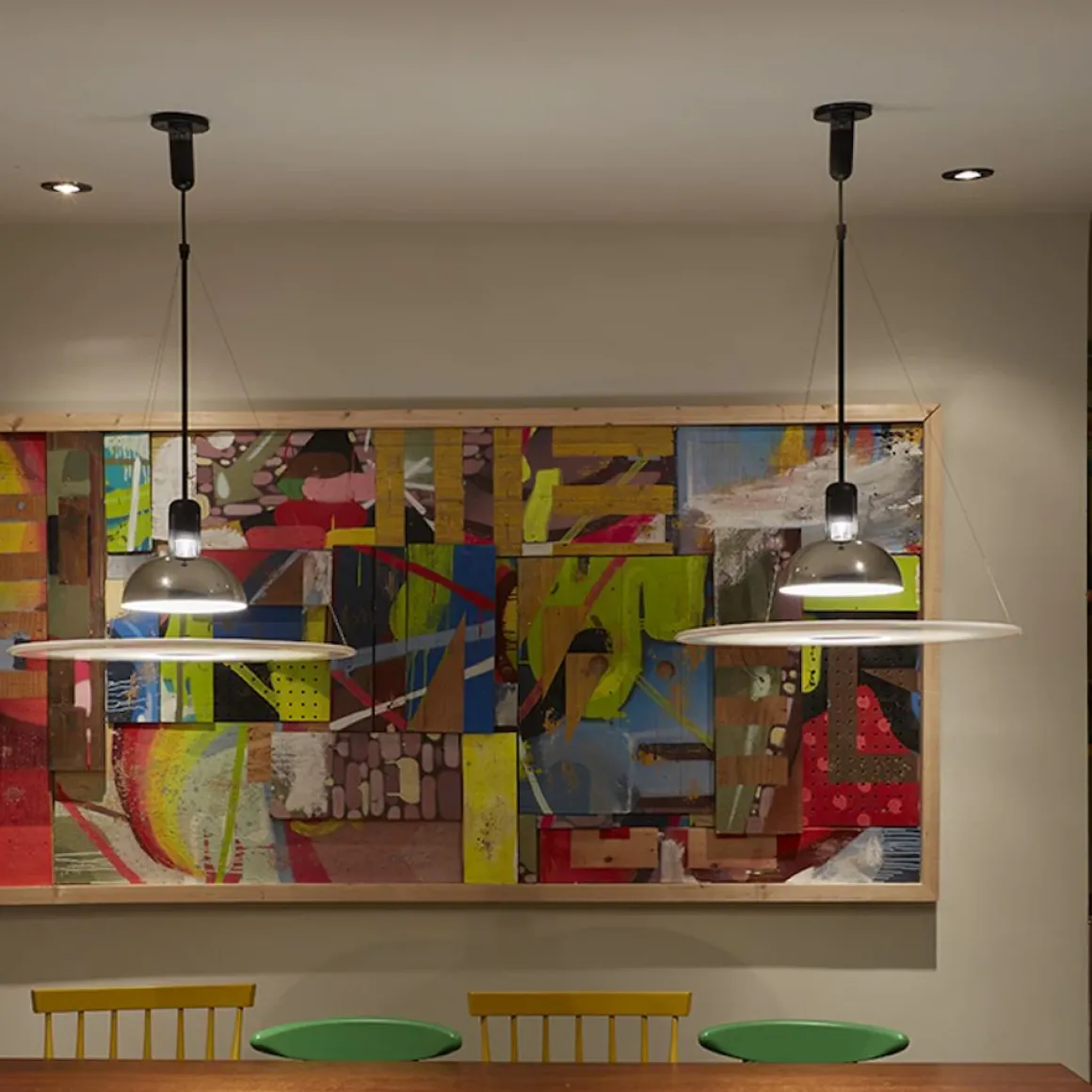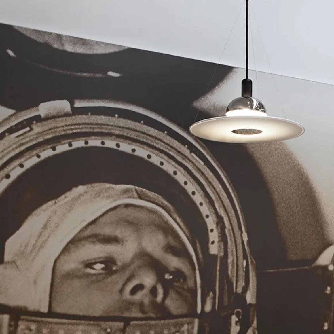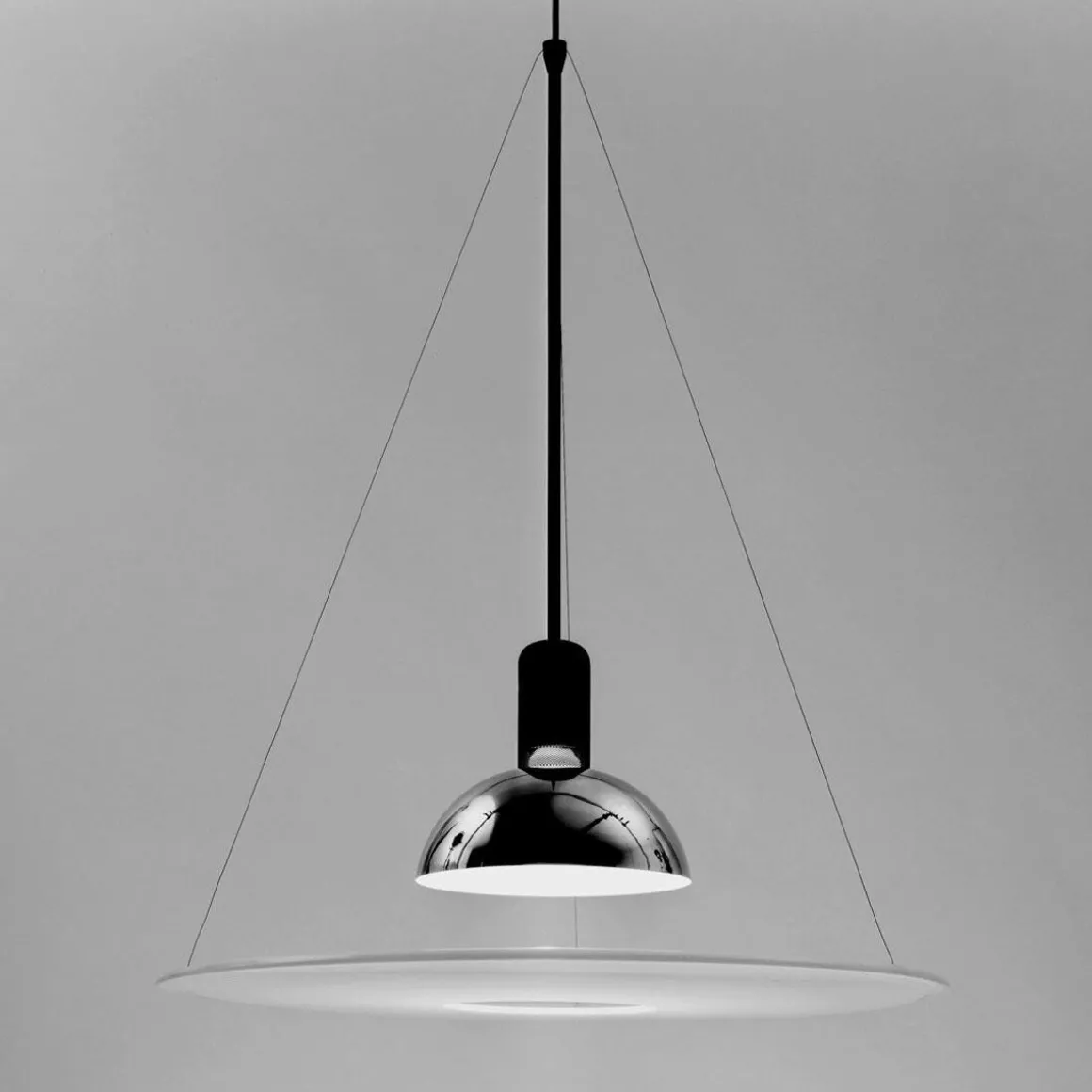 Frisbi est une suspension dessinée par Achille Castiglioni pour Flos. Cette suspension est à lumière directe, diffuse et réfléchie. Son diffuseur plat est suspendu au corps de l’appareil par trois fils en acier harmonique. Son réflecteur en tôle moulée, polie et nickelée lui donne une touche industrielle chic !
