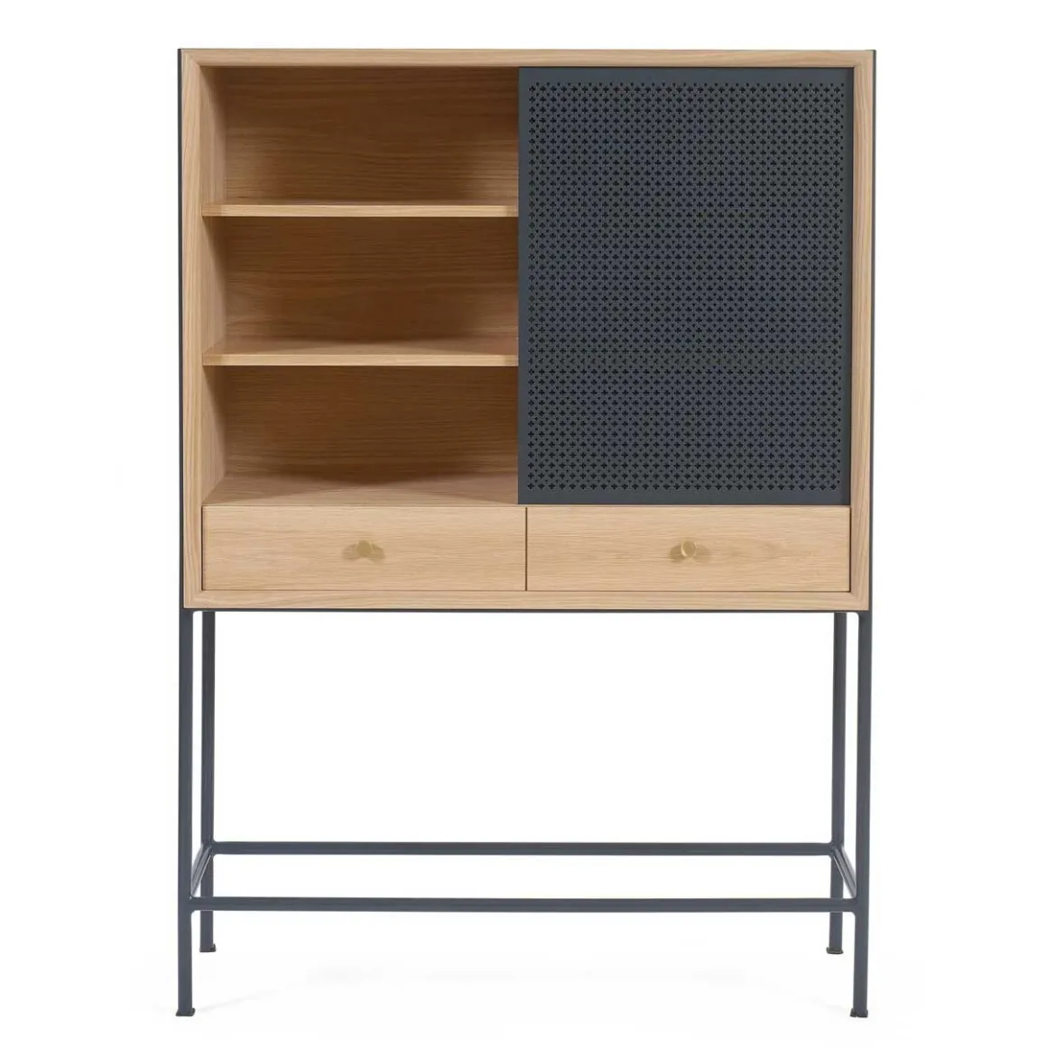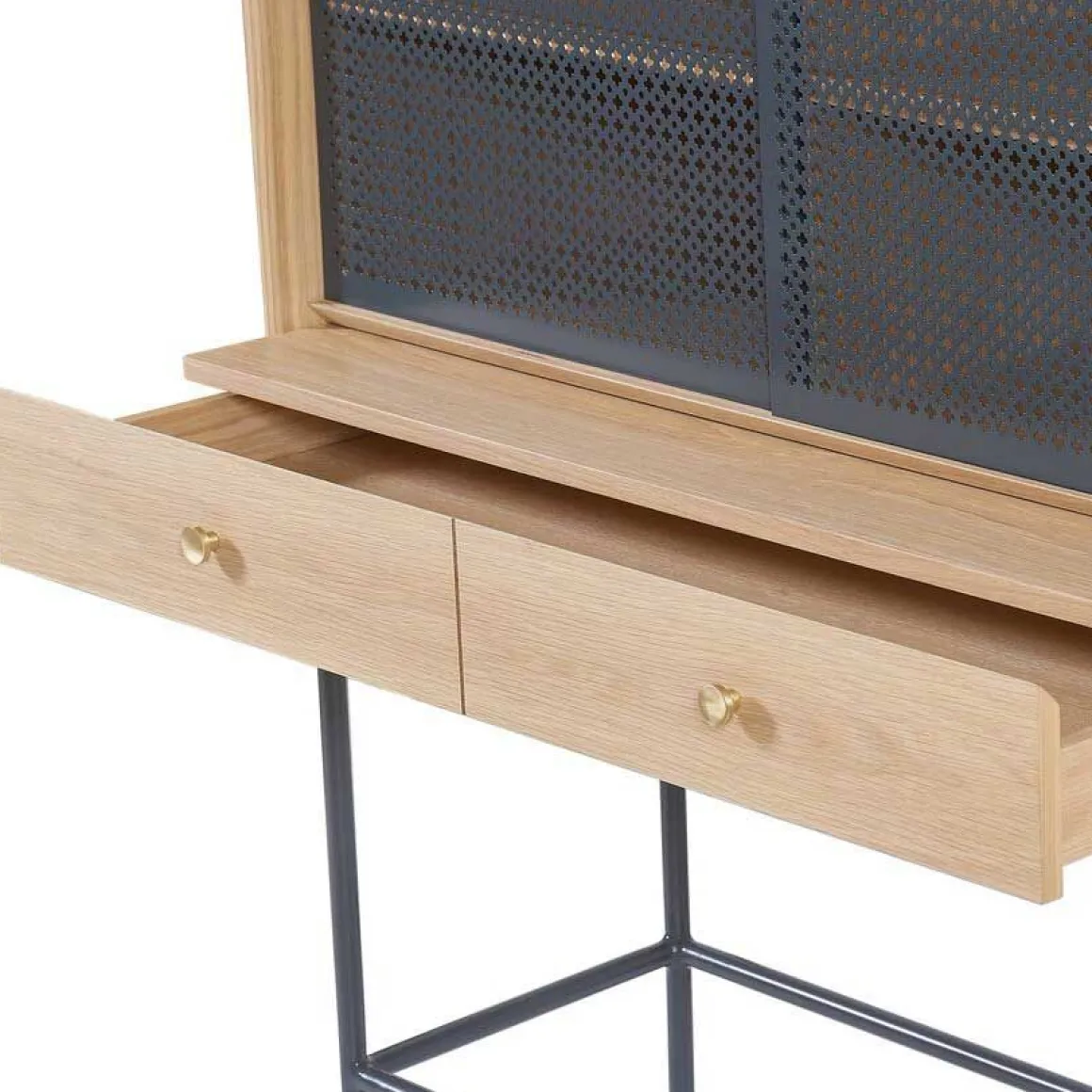 Matériaux : Corps et tiroir en MDF plaqué chêne naturel, poignées laiton brossé, Portes coulissantes en métal perforé laquées mates, Pieds laqués gris ardoise.
