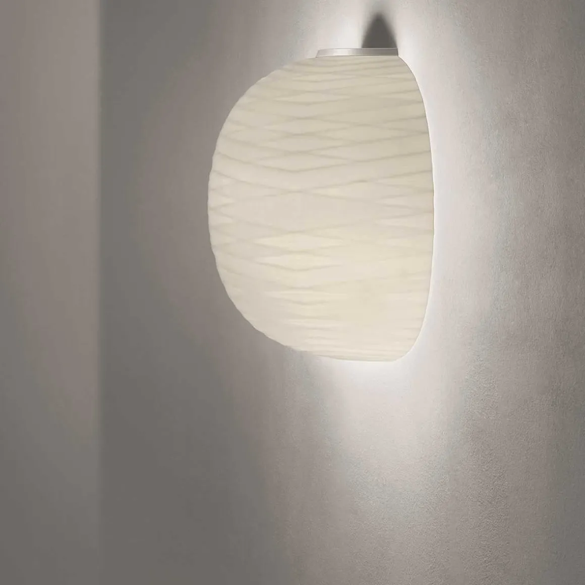 Au premier coup d’oeil, le verre Gem déclare la préciosité de la matière : il a un motif graphique caractérisé par des ondes qui se poursuivent sur sa surface et rendent la lampe unique, même éteinte. L’applique Gem « Semi Parete » fait partie du système Mix&Match et est disponible dans trois couleurs qui peuvent être combinées facilement, pour définir et coordonner l’éclairage de différents espaces.