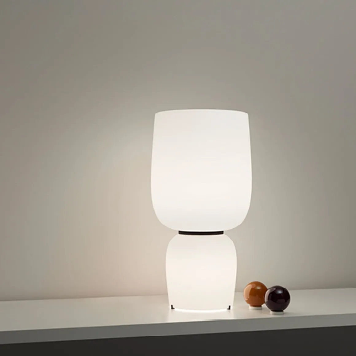 La lampe de table Ghost se présente sous la forme de deux bulbes lumineux posés l’un sur l’autre, qui dispensent un éclairage d’ambiance chaleureux. Les diffuseurs en verre opalin triplex soufflés bouche sont disponibles en différents coloris, pour des effets lumineux mix and match.