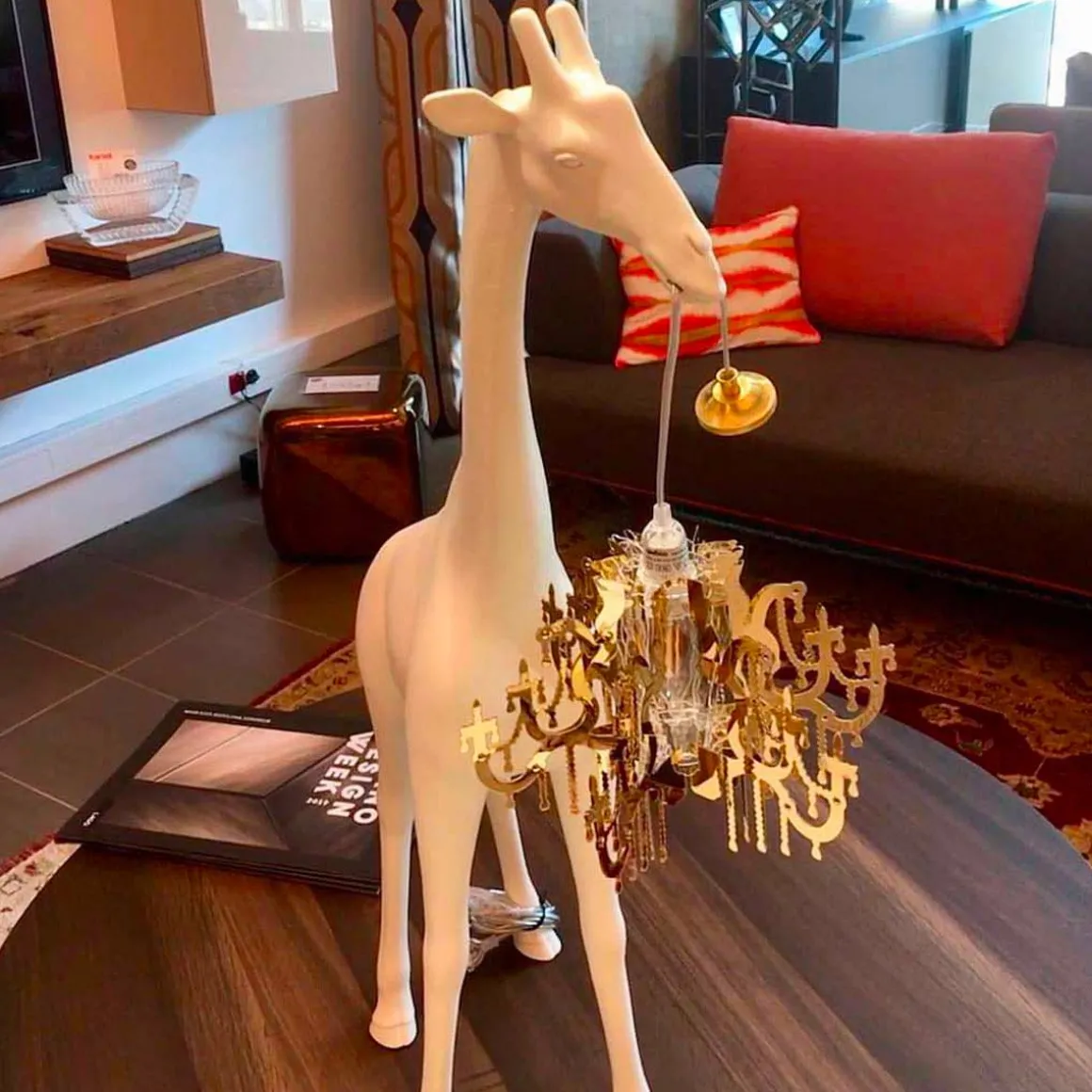 Giraffe in love de Qeeboo. Giraffe In Love XS, conçue par Marcantonio, est une girafe qui tient un lustre de style Marie-Thérèse, en version miniature. La lampe girafe devient un objet design polyvalent et ludique qui saura éloigner tout stress de votre bureau.