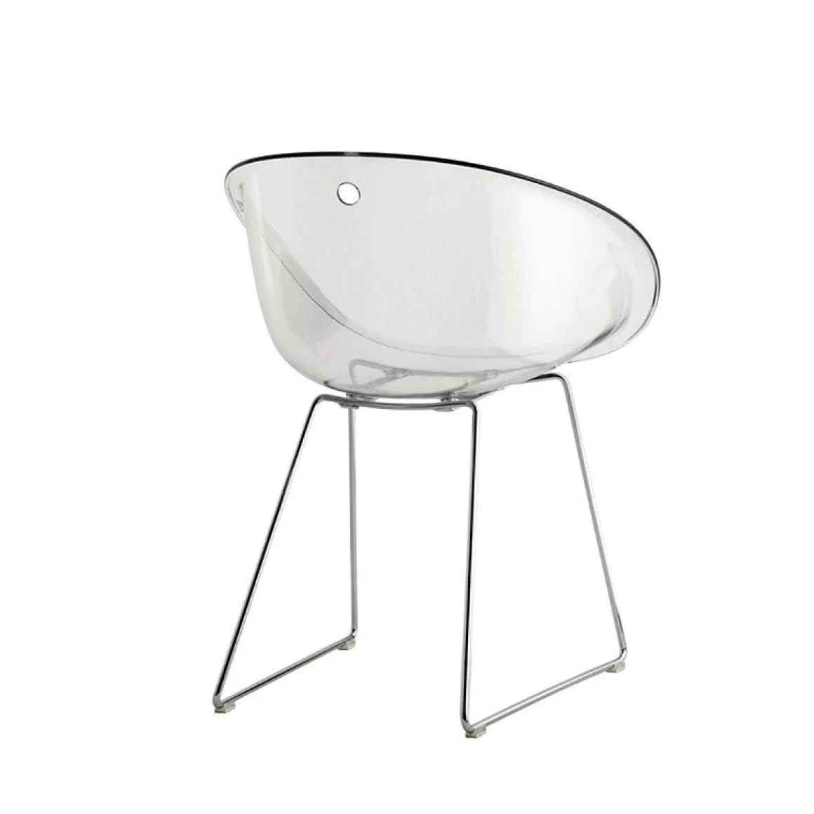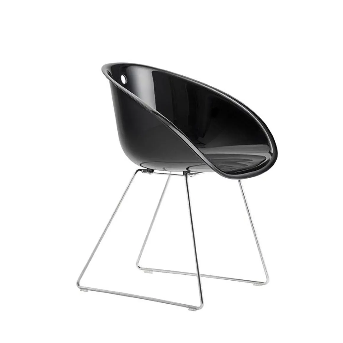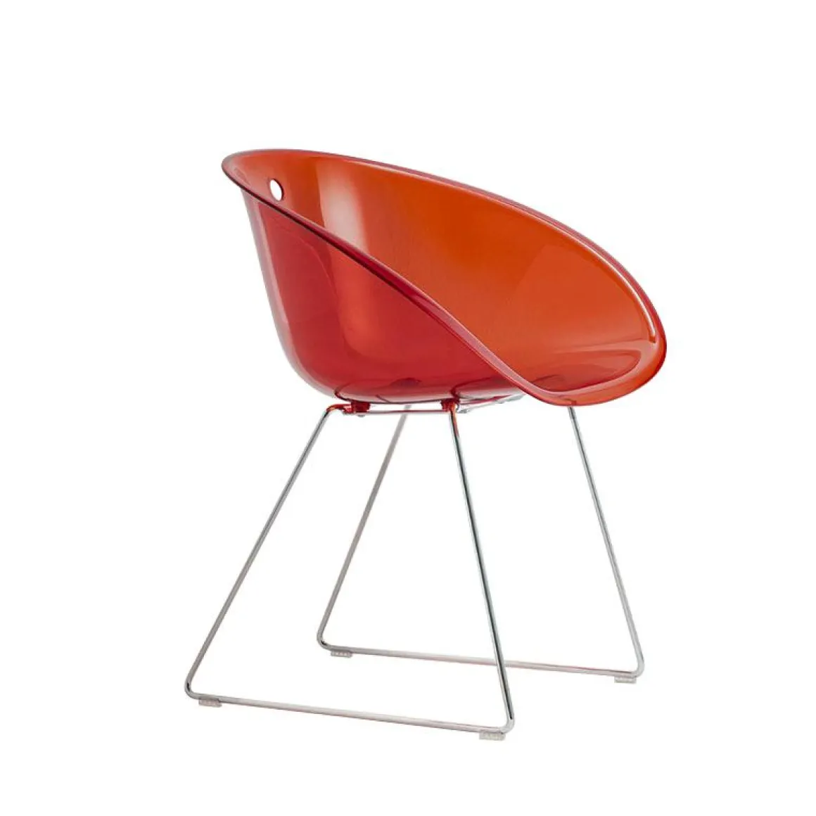 Glass a une forme enveloppante et ergonomique inspirée aux sièges emblématique des années 1950 et se caractérise par l’élément distinctif du trou dans la coque. La collection est confortable et fonctionnelle grâce à la forme sinueuse des accoudoirs qui entourent la personne assise comme dans un câlin et qui favorisent la prise de main pour le déplacement. Fauteuil avec coque en polycarbonate et structure en luge avec fil en acier (diamètre 10mm).