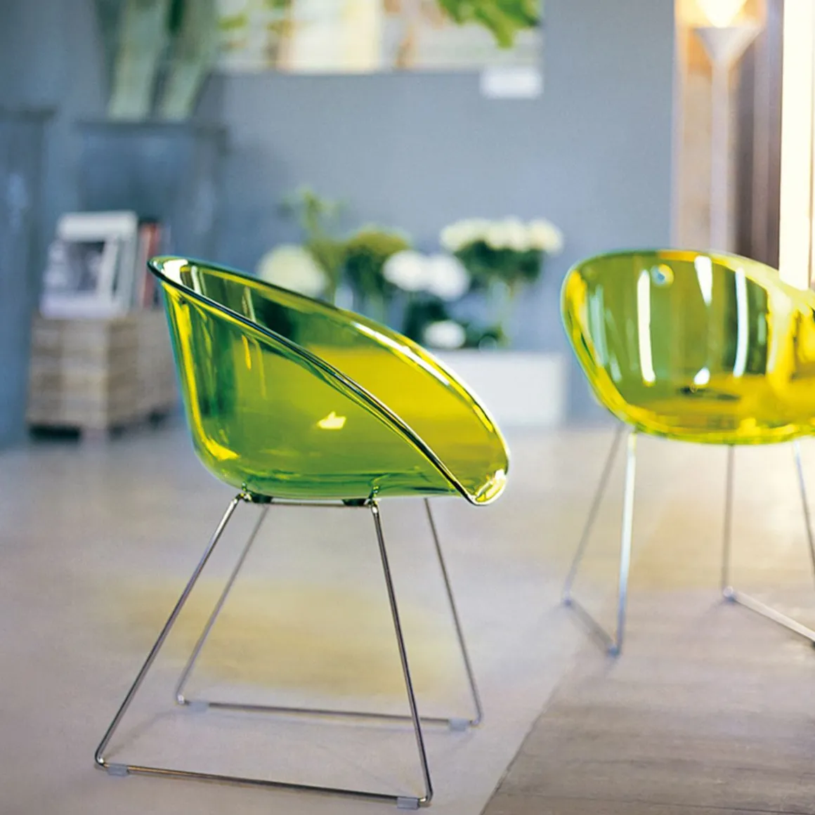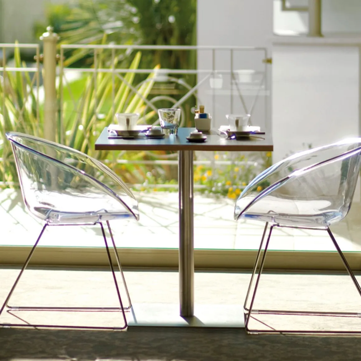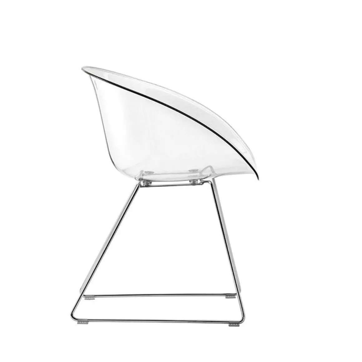 Glass a une forme enveloppante et ergonomique inspirée aux sièges emblématique des années 1950 et se caractérise par l’élément distinctif du trou dans la coque. La collection est confortable et fonctionnelle grâce à la forme sinueuse des accoudoirs qui entourent la personne assise comme dans un câlin et qui favorisent la prise de main pour le déplacement. Fauteuil avec coque en polycarbonate et structure en luge avec fil en acier (diamètre 10mm).