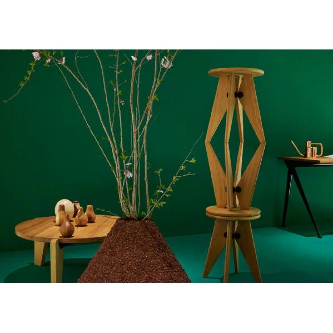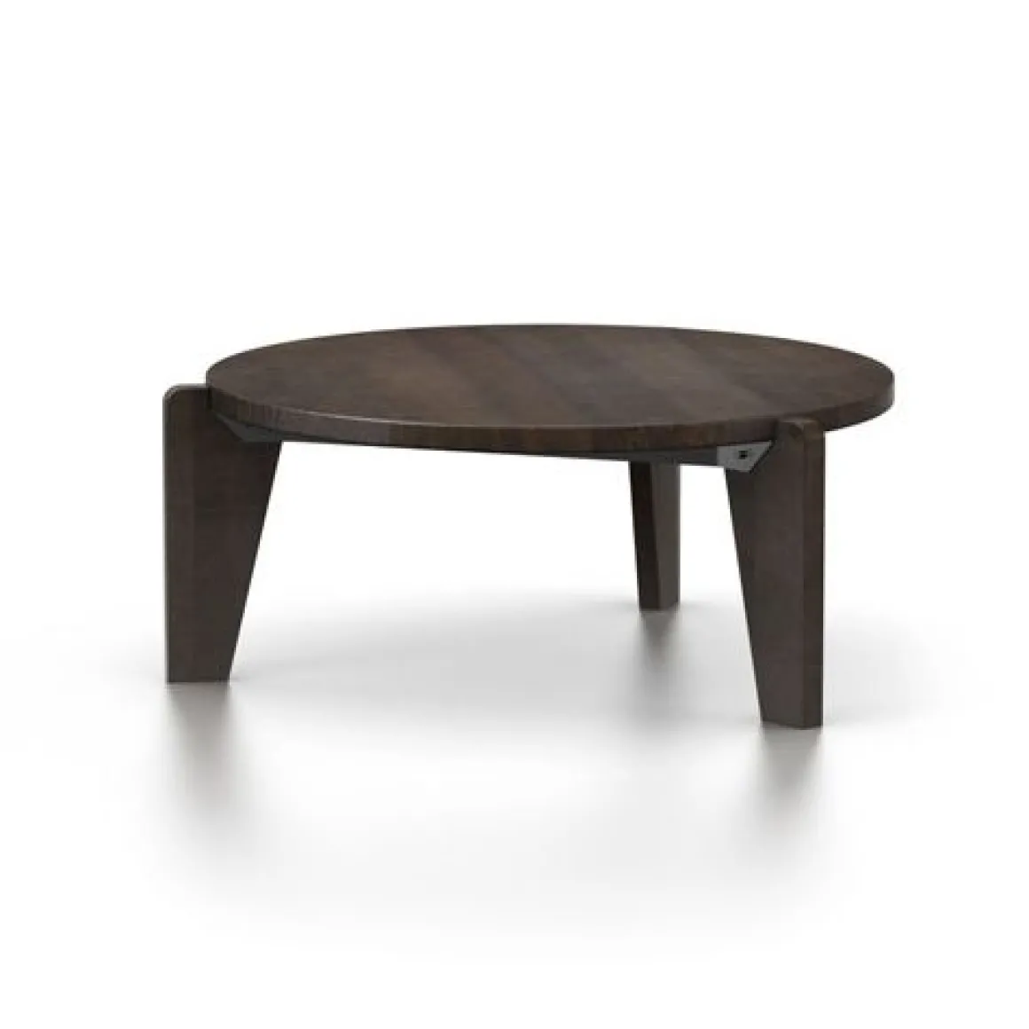 Au début des années 1940, Jean Prouvé se consacra de plus en plus au travail du bois. La table Guéridon Bas est composée d’un lourd plateau en chêne massif ou en noyer américain reposant sur trois pieds élaborés dans le même bois. Ces éléments sont reliés entre eux par une structure robuste composée de tôle pliée. En référence à une version originale en bois tropical nommée « Table Africaine », Guéridon Bas est également disponible en chêne fumé foncé.