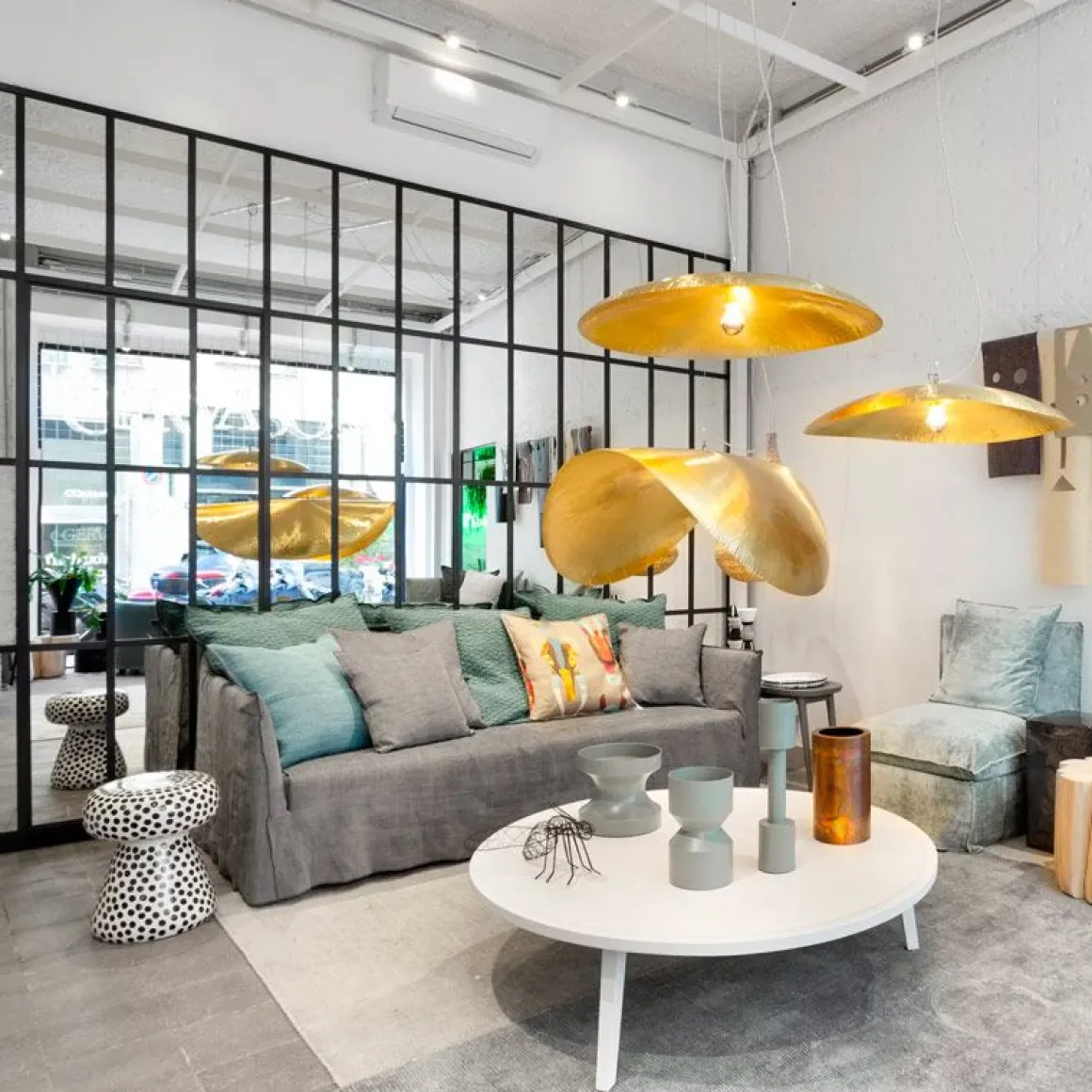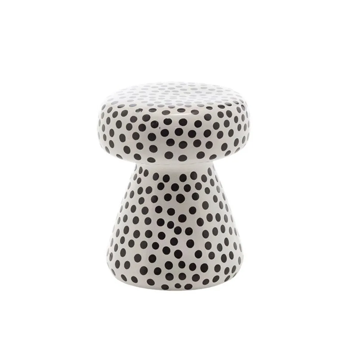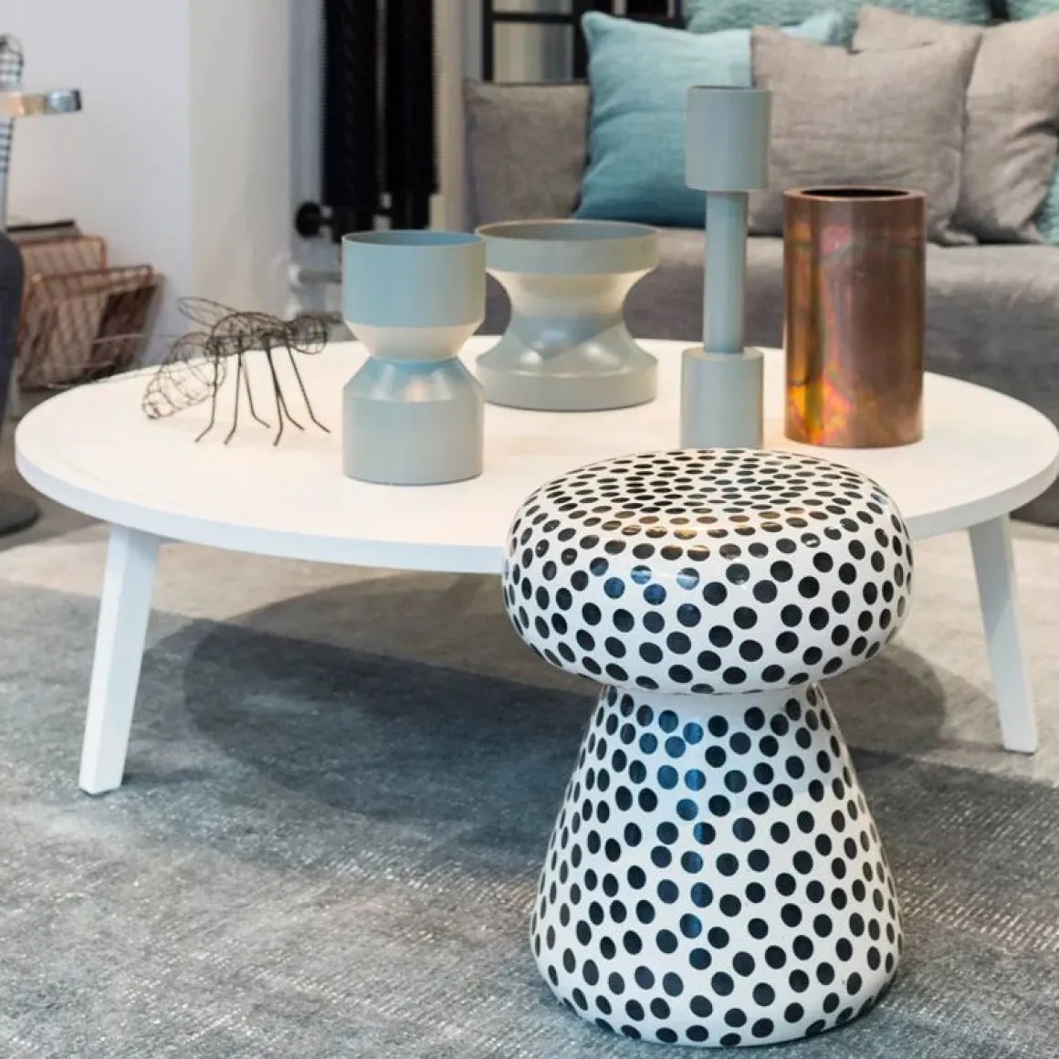Guéridon Inout 44 de Gervasoni par Paola Navone. Inout 44 est une table basse-pouf en béton GFRC blanc décorée de pois noirs. Elle présente une forme de bouchon champagne, essentielle et minimale.